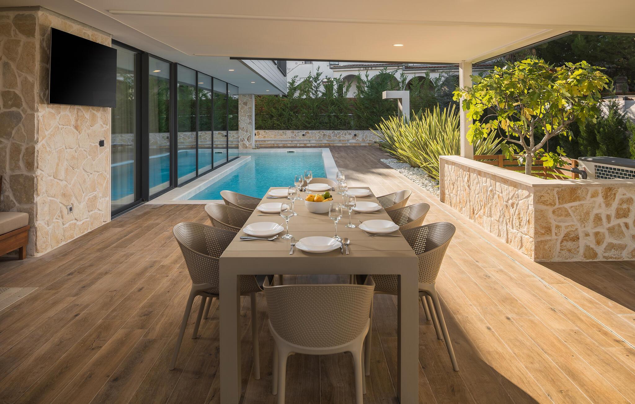 Stilfuldt, luksuriøst feriehus med dejlig udendørspool.