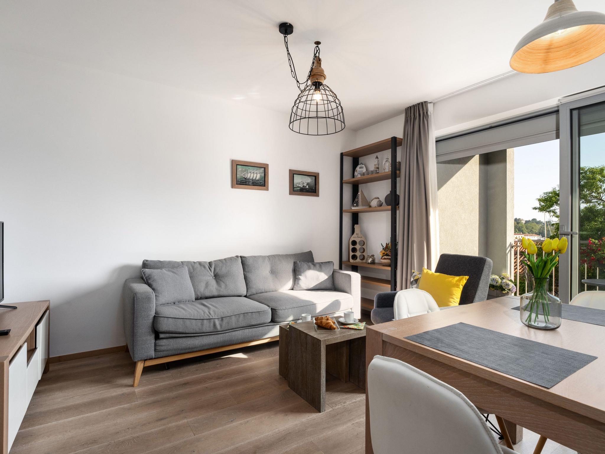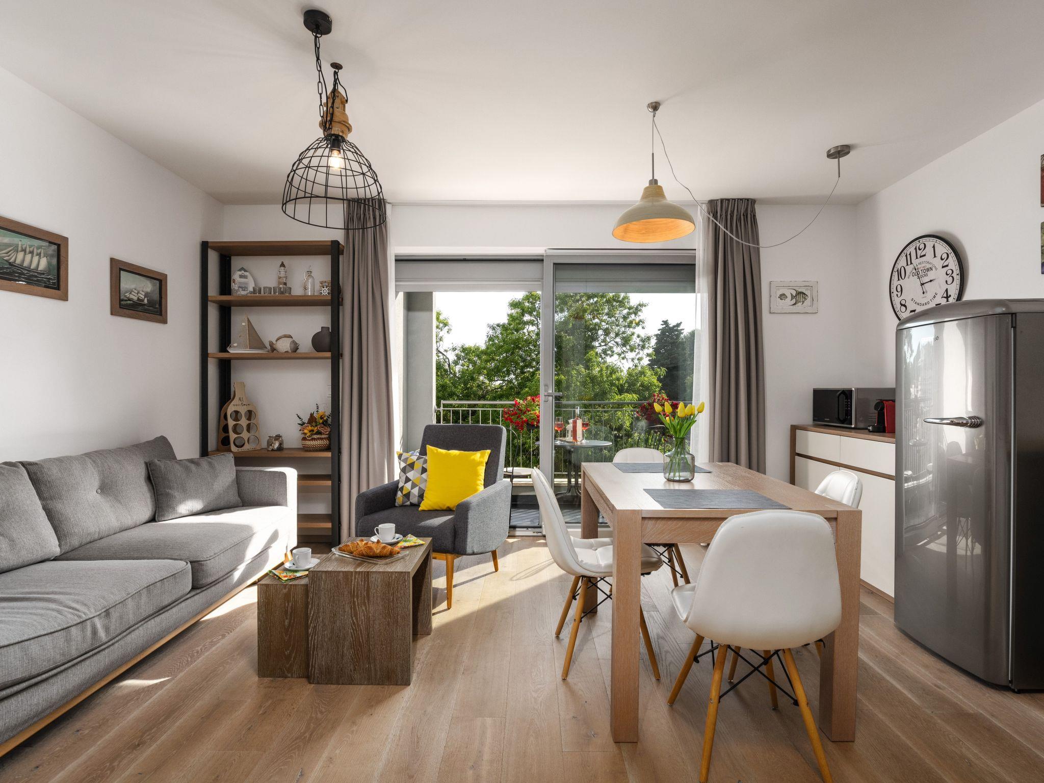 The flat itself is located on the first floor of a new building and has 47 square metres of living space, which is perfectly divided. It offers a cosy living area with a fully equipped kitchen, a dining table and a pull-out couch, which is ideal for a small child. A highlight is the balcony, which invites you to relax with its enchanting sea view and comfortable garden furniture. There is also a bedroom with a double bed and a modern bathroom with shower/WC.