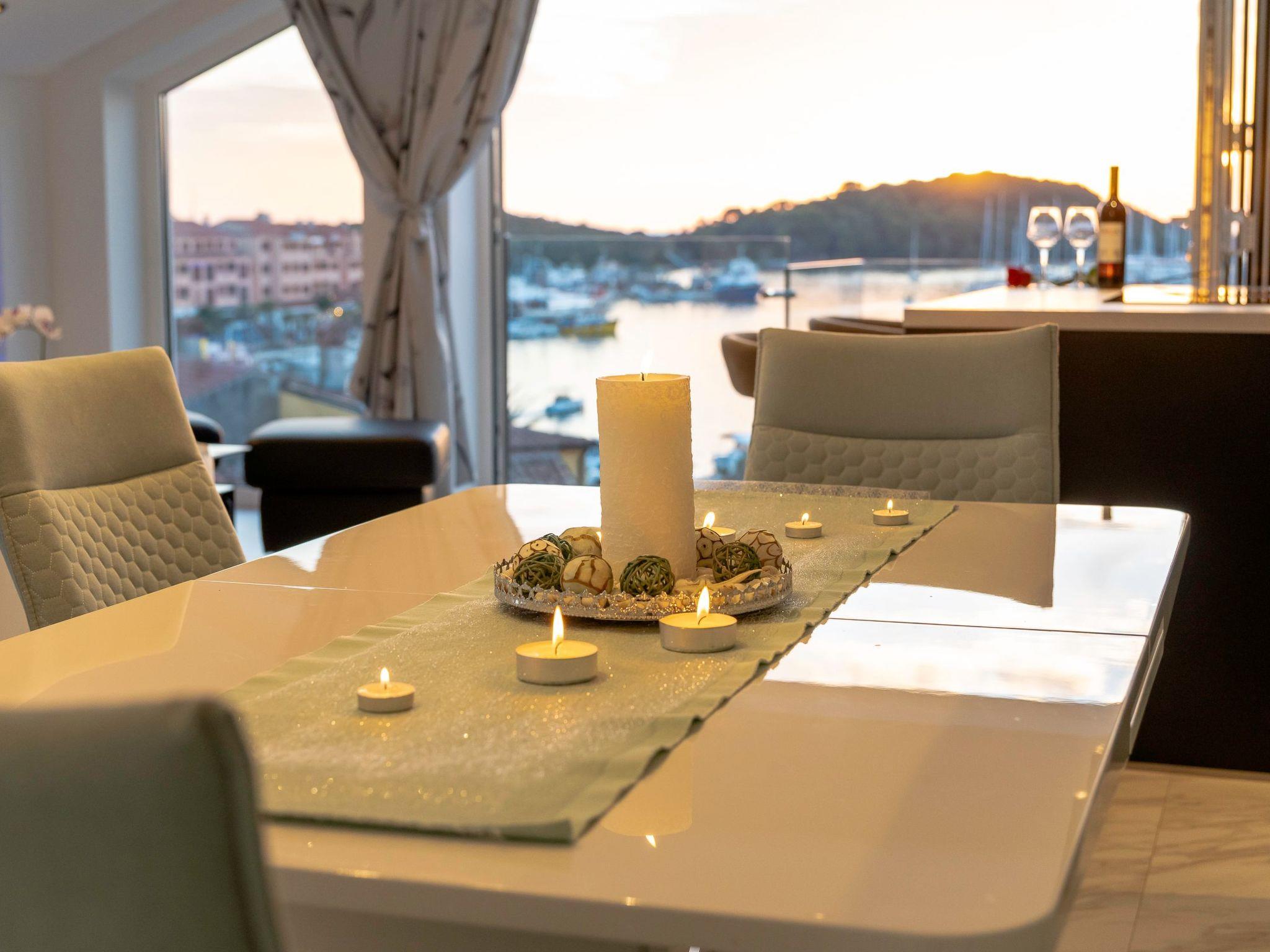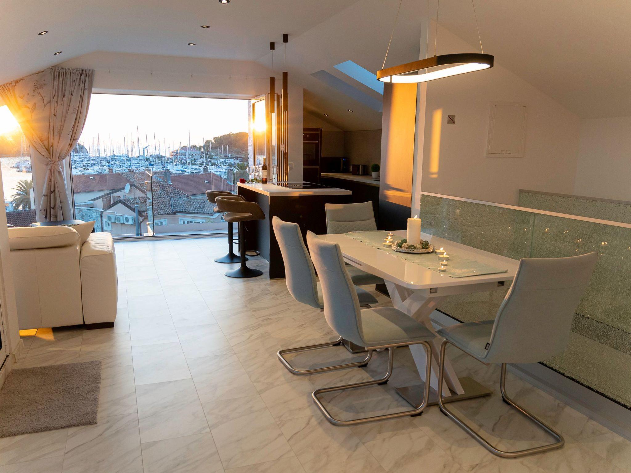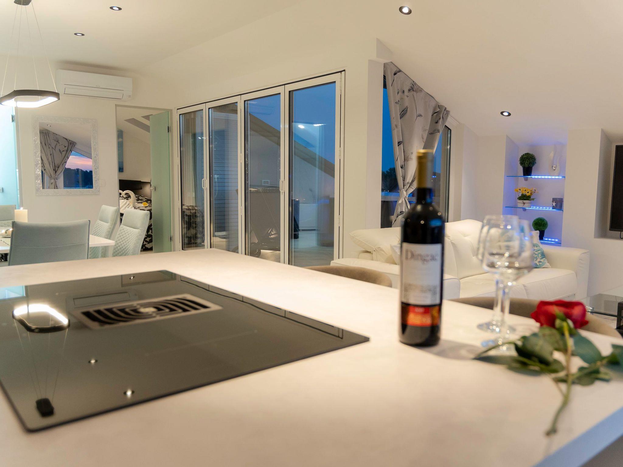 Luxury flat for up to 4 people. Equipped with modern fitted kitchen, elegant living and dining room, deluxe bathroom, sun terrace, Jacuzzi, panoramic windows and an excellent view of the sea. Enjoy the sunset and the view of the Croatian sea from your personal jacuzzi for up to 4 people.