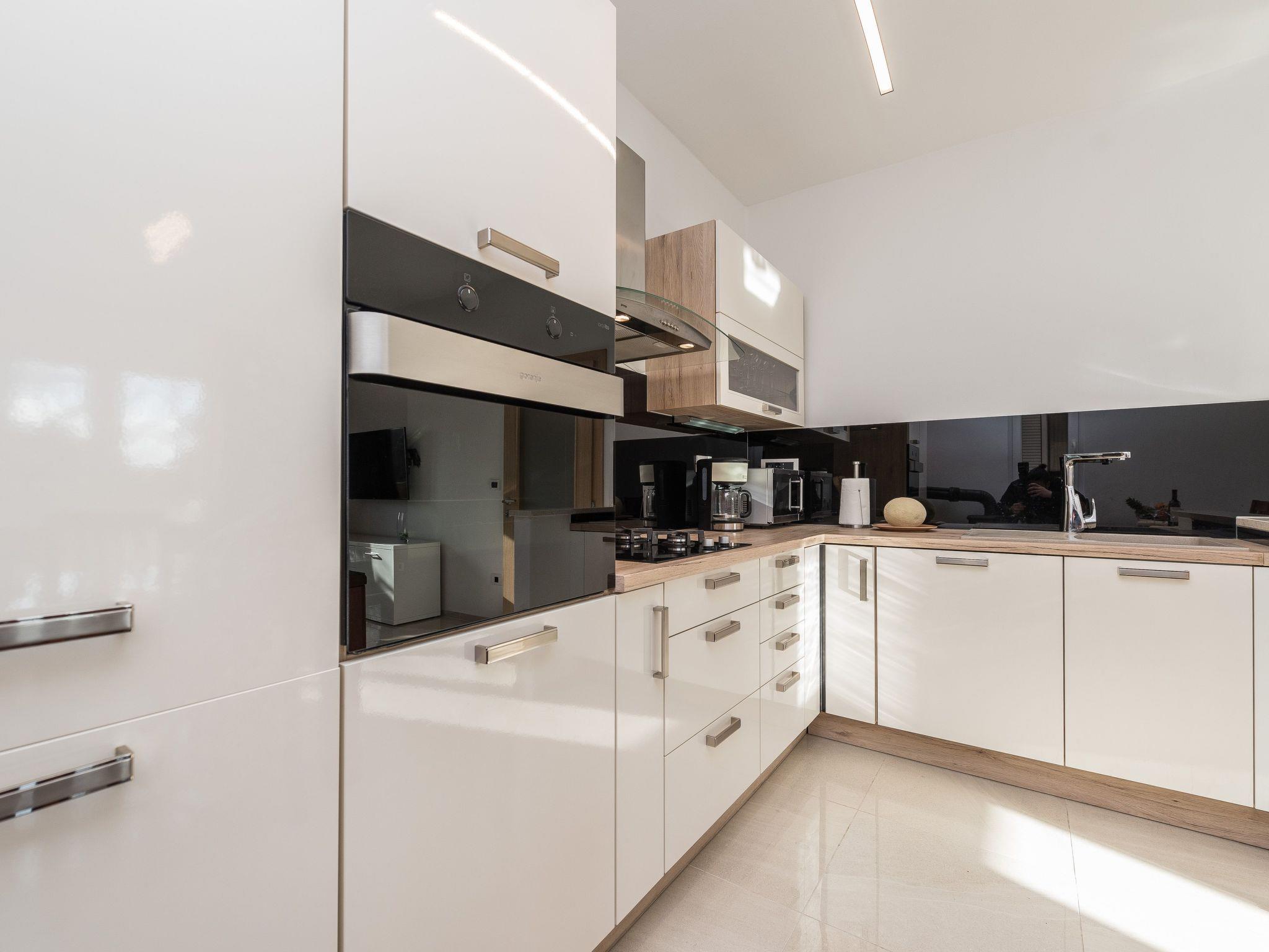 The ground floor is about 110 m² in size and comprises of the following rooms: A living room with a kitchen and dining room, a flat screen TV and a double sofa bed which is able stretch in bed 1,6 m x 1,9 m Kitchen is a fully-equipped kitchen with an oven, microwave, coffee machine and a dining area. There is also a three bedroom next to it, which two of them includes a double bed and third one is equipped with two single beds 0,9 m x 2,0 m. Two rooms is also equipped with bathroom/toilet in there, and there is also another one bathroom/toilet. Each room has flat screen TV, and all space in the house is air cooled, with inner units in each sleeping room and daily room. House is pretty comfortable.