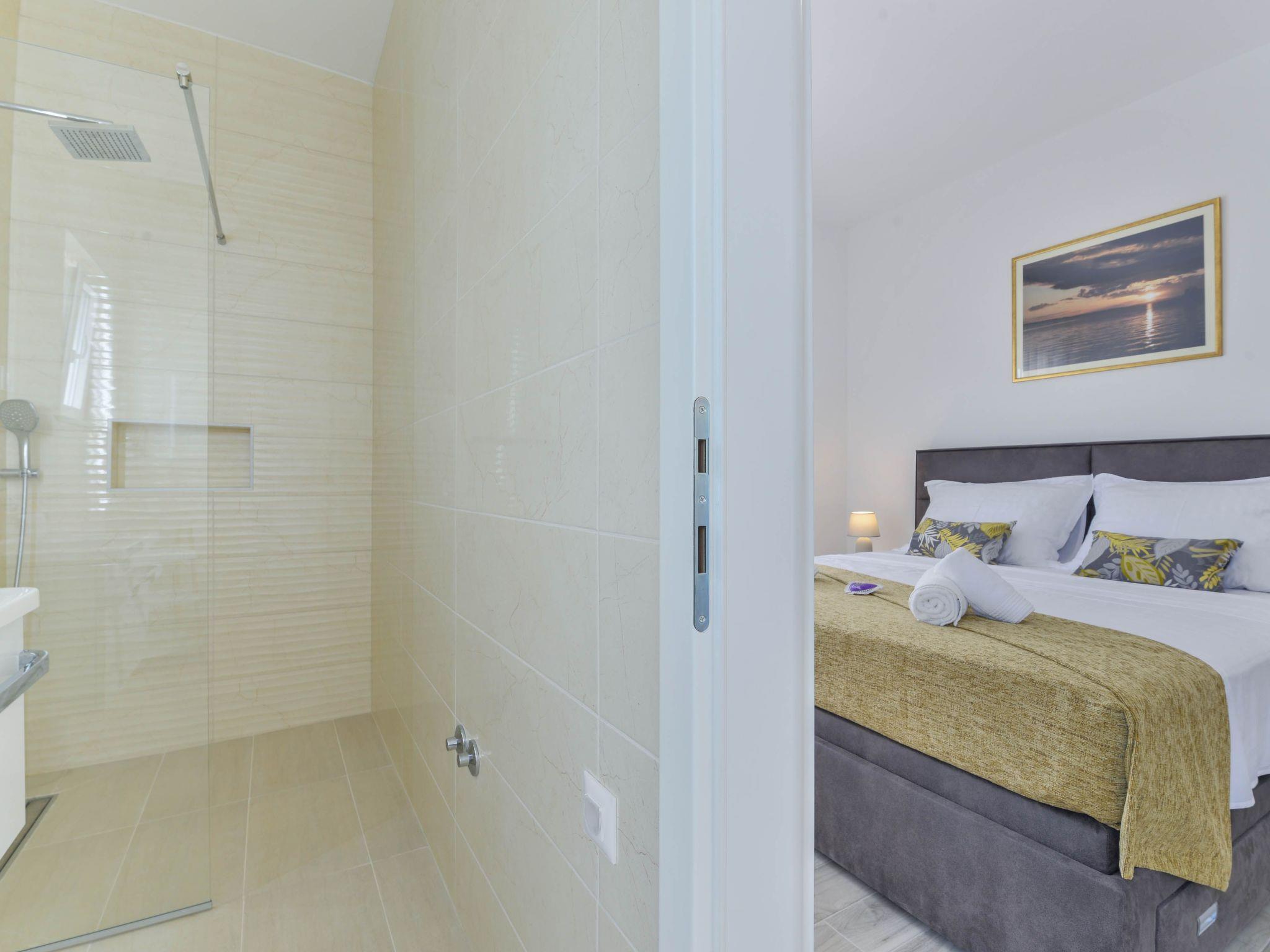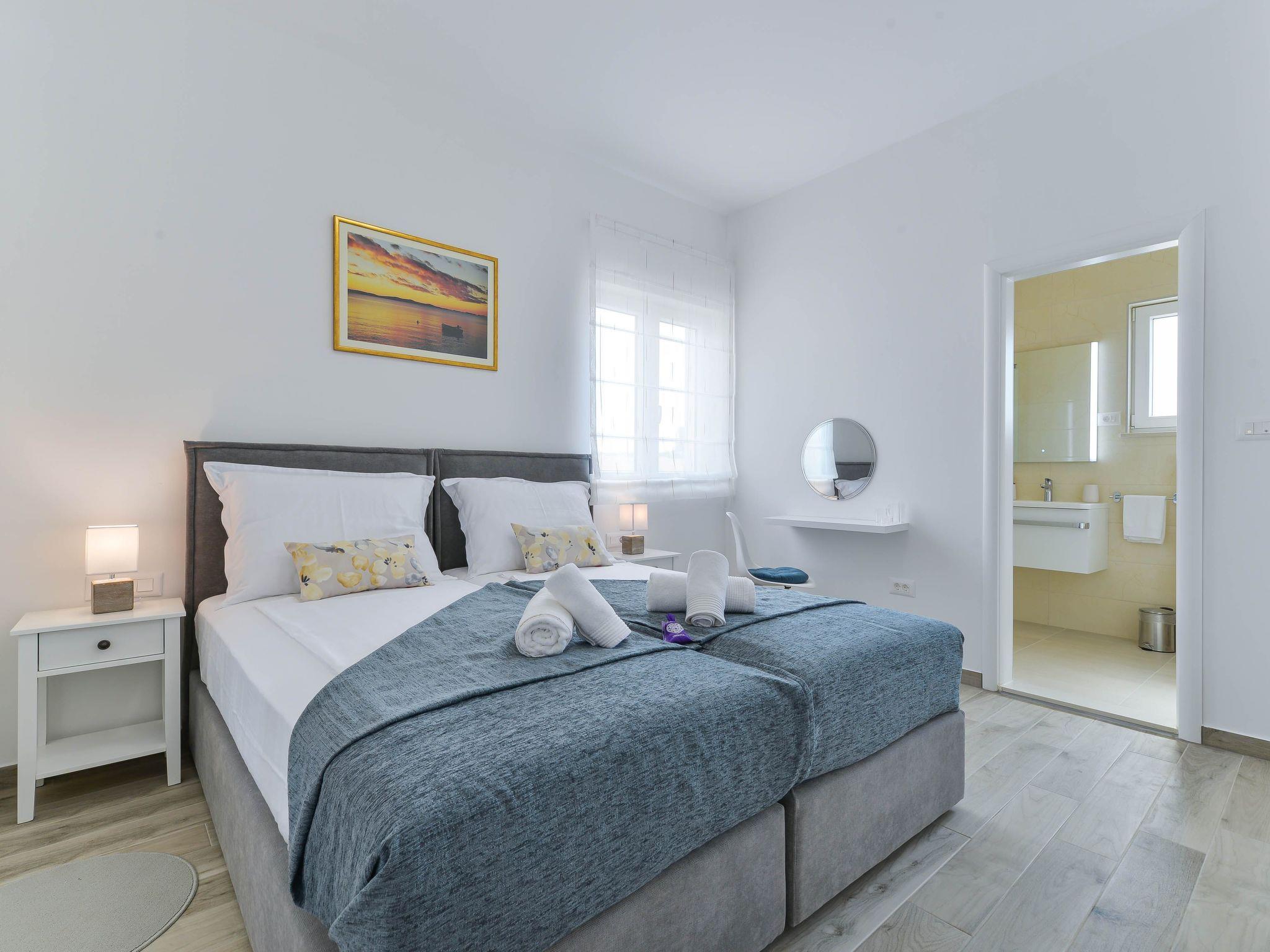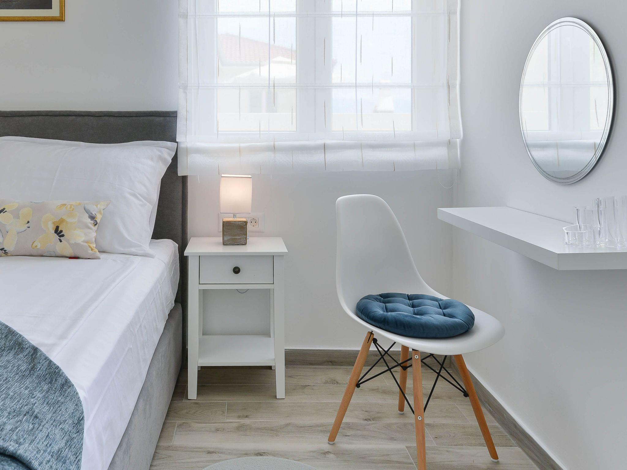 A spacious villa Regina with plenty of natural light can host up to eight people. It contains four comfortable bedrooms, three of which have a fully equipped private bathroom, and the fourth room has a bunk bed. In addition to spacious rooms with TVs, guests will enjoy a living room with large balcony windows, a well-equipped kitchen, and a spacious dining room. The true pearl of this villa is the spacious and fenced garden, which is synonymous with an oasis of peace - guests can relax in the sun on comfortable deckchairs with morning coffee from the machine and enjoy the heated pool from where they can watch their children playing on the trampoline. They also have a large parasol at their disposal so that they can relax in the shade, protecting themselves from the strong sun. In the garden, there is a barbecue where you can grill fish bought in a fish market 200 m from the villa, and for other groceries, there is also a fruit shop, a butcher's shop, and a bakery. They can spend pleasant evenings in restaurants and cafes near the villa, or organize an evening of board games with friends on the terrace where they have complete privacy. The villa with all its functional facilities is ideal for vacations throughout the year and is in a quiet neighborhood. It also offers private parking in front of the entrance for three cars and good wi-fi.