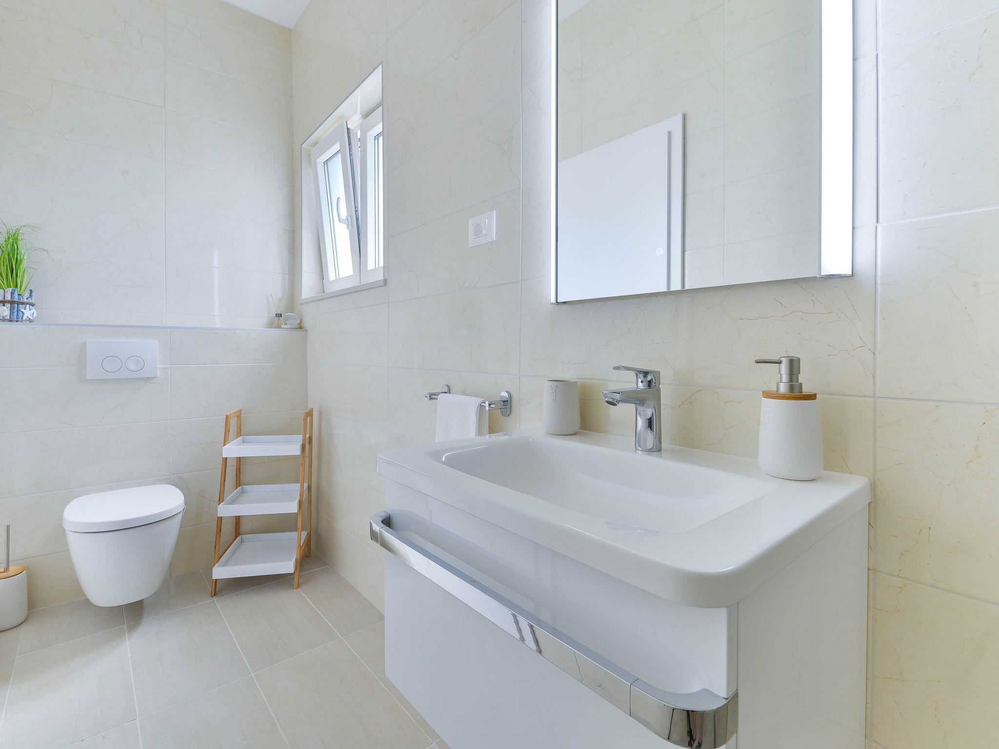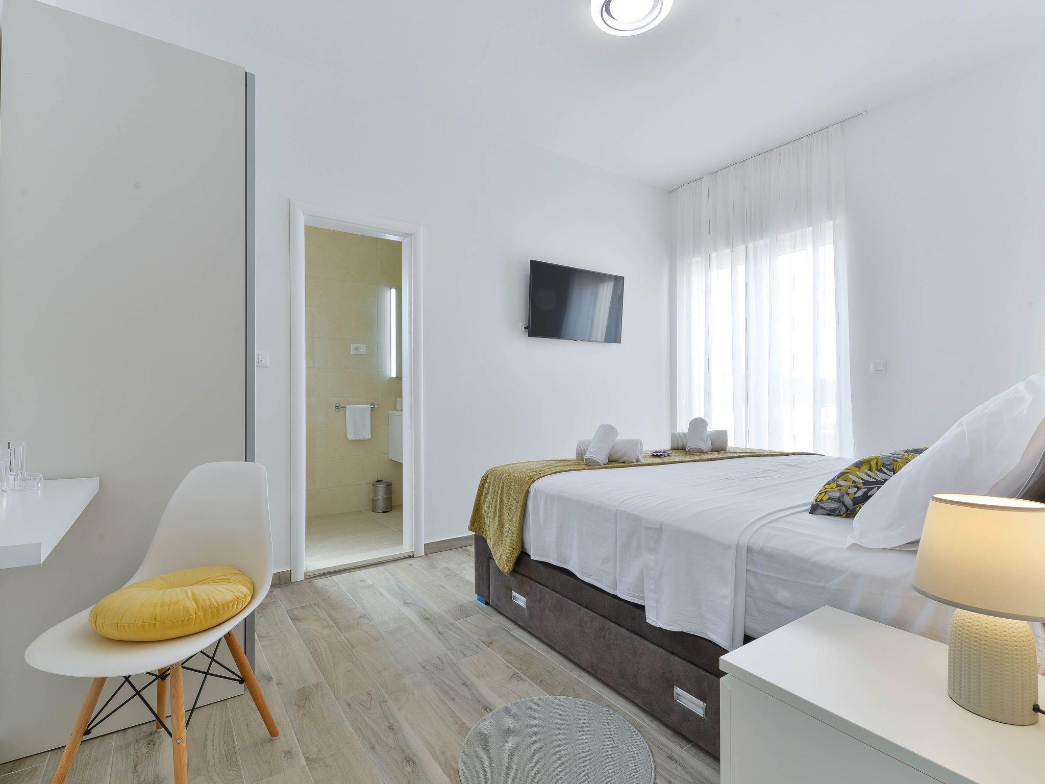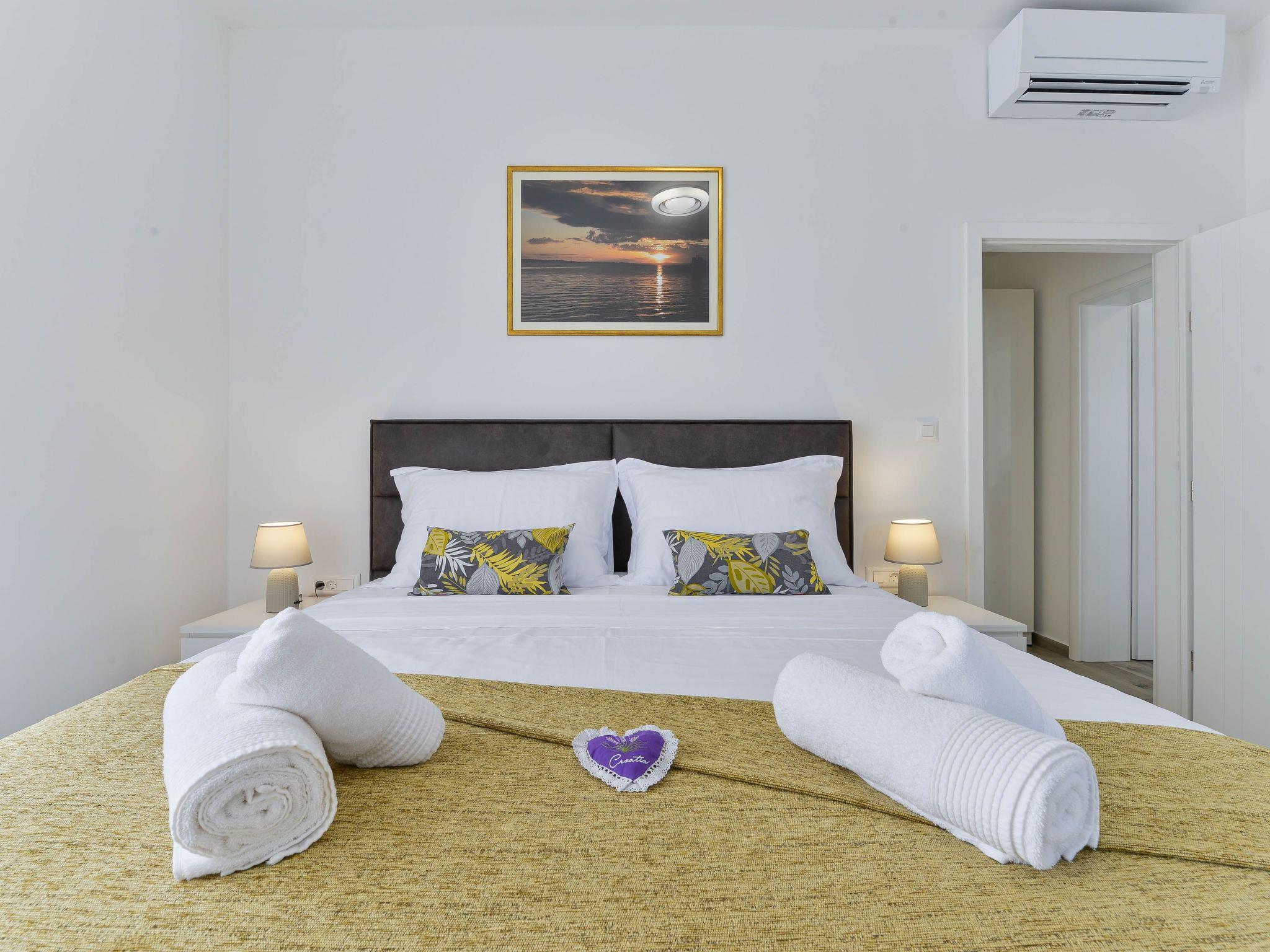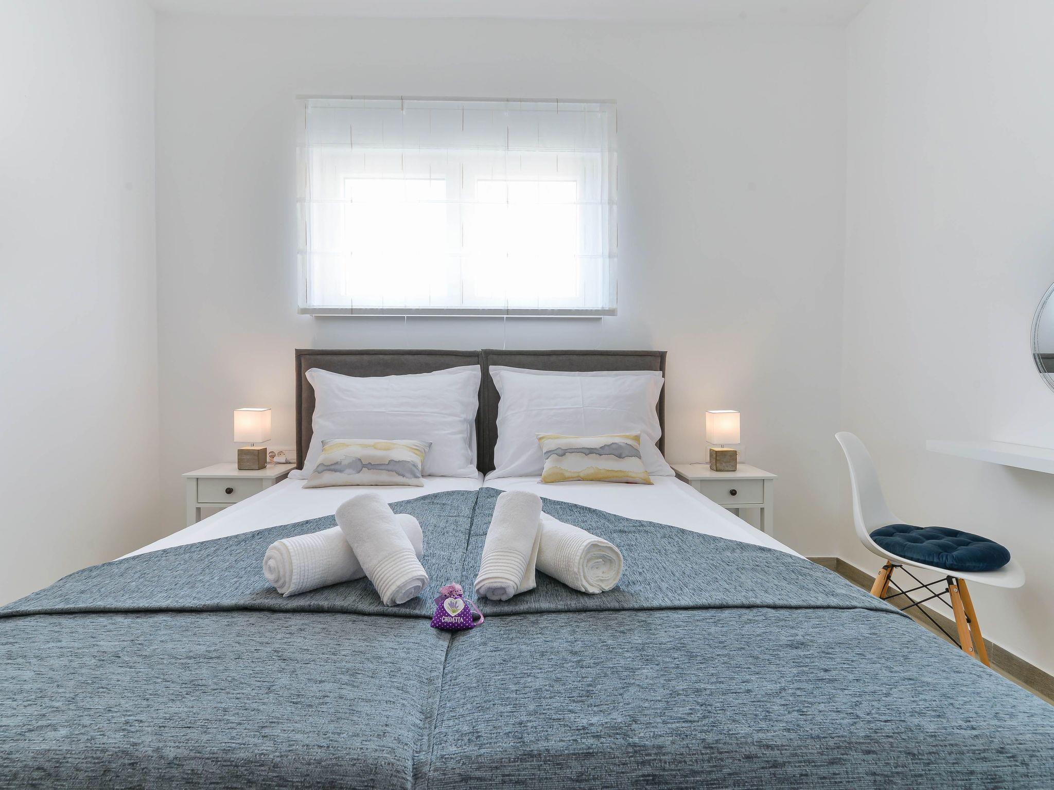 A spacious villa Regina with plenty of natural light can host up to eight people. It contains four comfortable bedrooms, three of which have a fully equipped private bathroom, and the fourth room has a bunk bed. In addition to spacious rooms with TVs, guests will enjoy a living room with large balcony windows, a well-equipped kitchen, and a spacious dining room. The true pearl of this villa is the spacious and fenced garden, which is synonymous with an oasis of peace - guests can relax in the sun on comfortable deckchairs with morning coffee from the machine and enjoy the heated pool from where they can watch their children playing on the trampoline. They also have a large parasol at their disposal so that they can relax in the shade, protecting themselves from the strong sun. In the garden, there is a barbecue where you can grill fish bought in a fish market 200 m from the villa, and for other groceries, there is also a fruit shop, a butcher's shop, and a bakery. They can spend pleasant evenings in restaurants and cafes near the villa, or organize an evening of board games with friends on the terrace where they have complete privacy. The villa with all its functional facilities is ideal for vacations throughout the year and is in a quiet neighborhood. It also offers private parking in front of the entrance for three cars and good wi-fi.