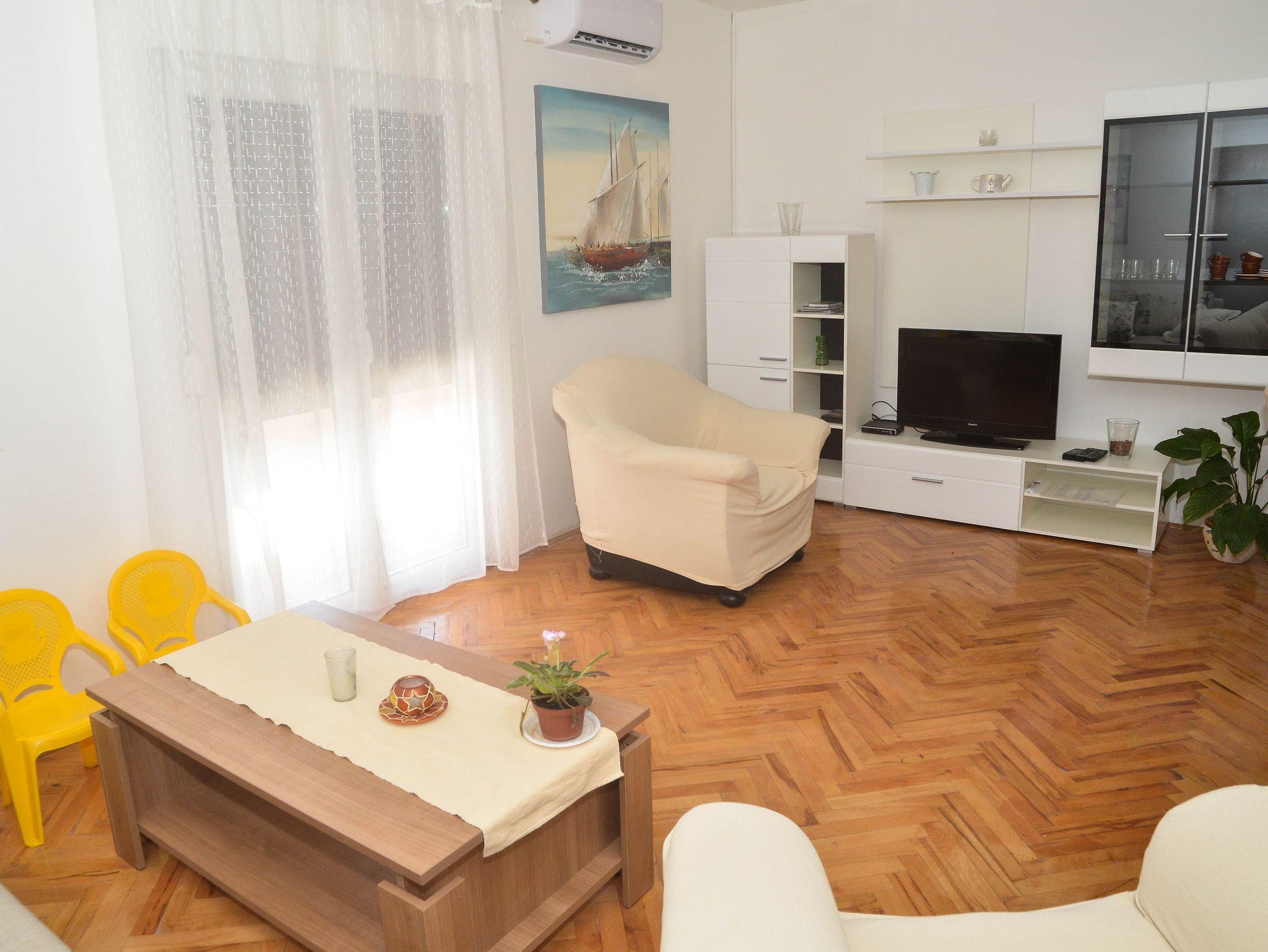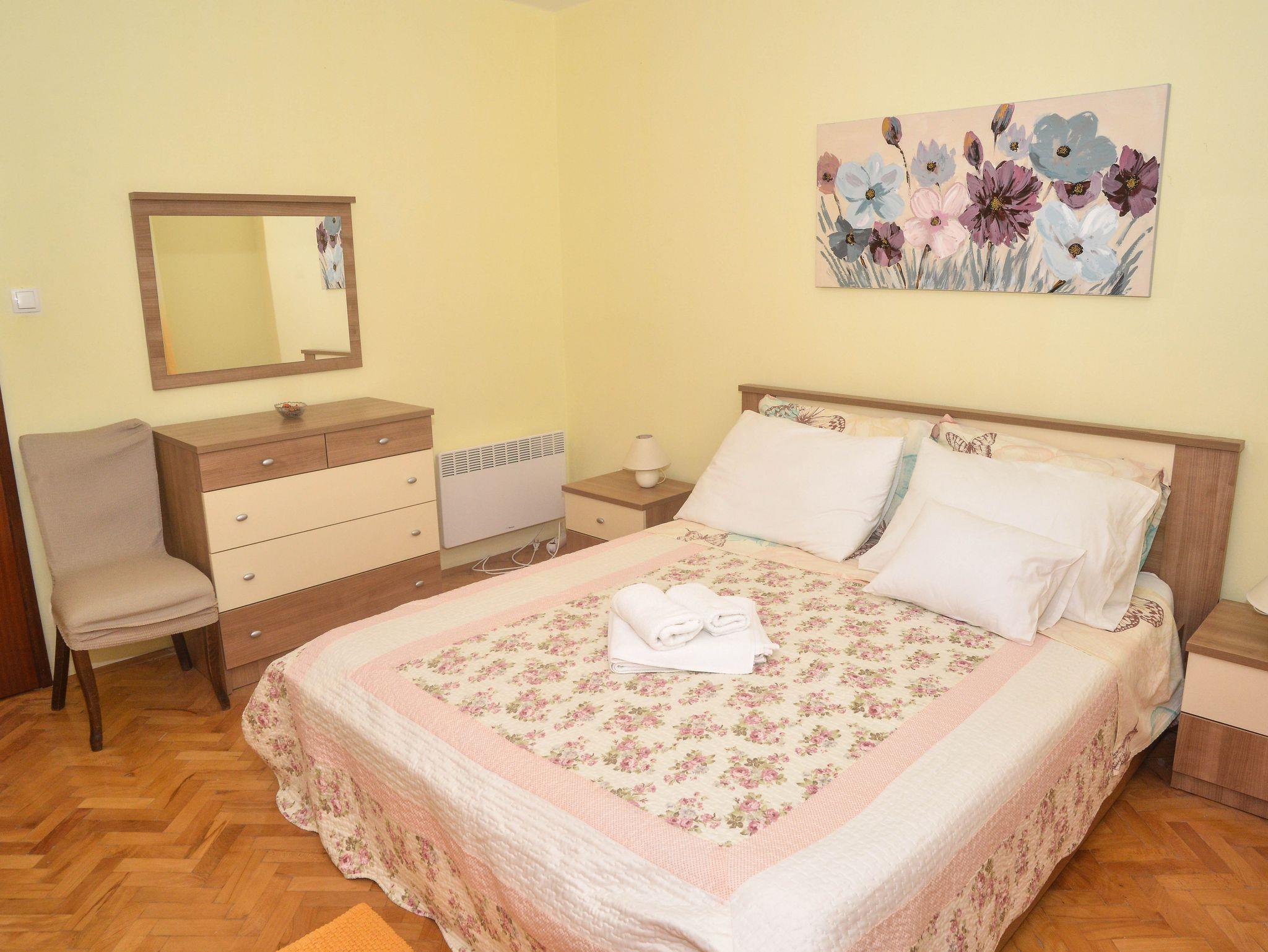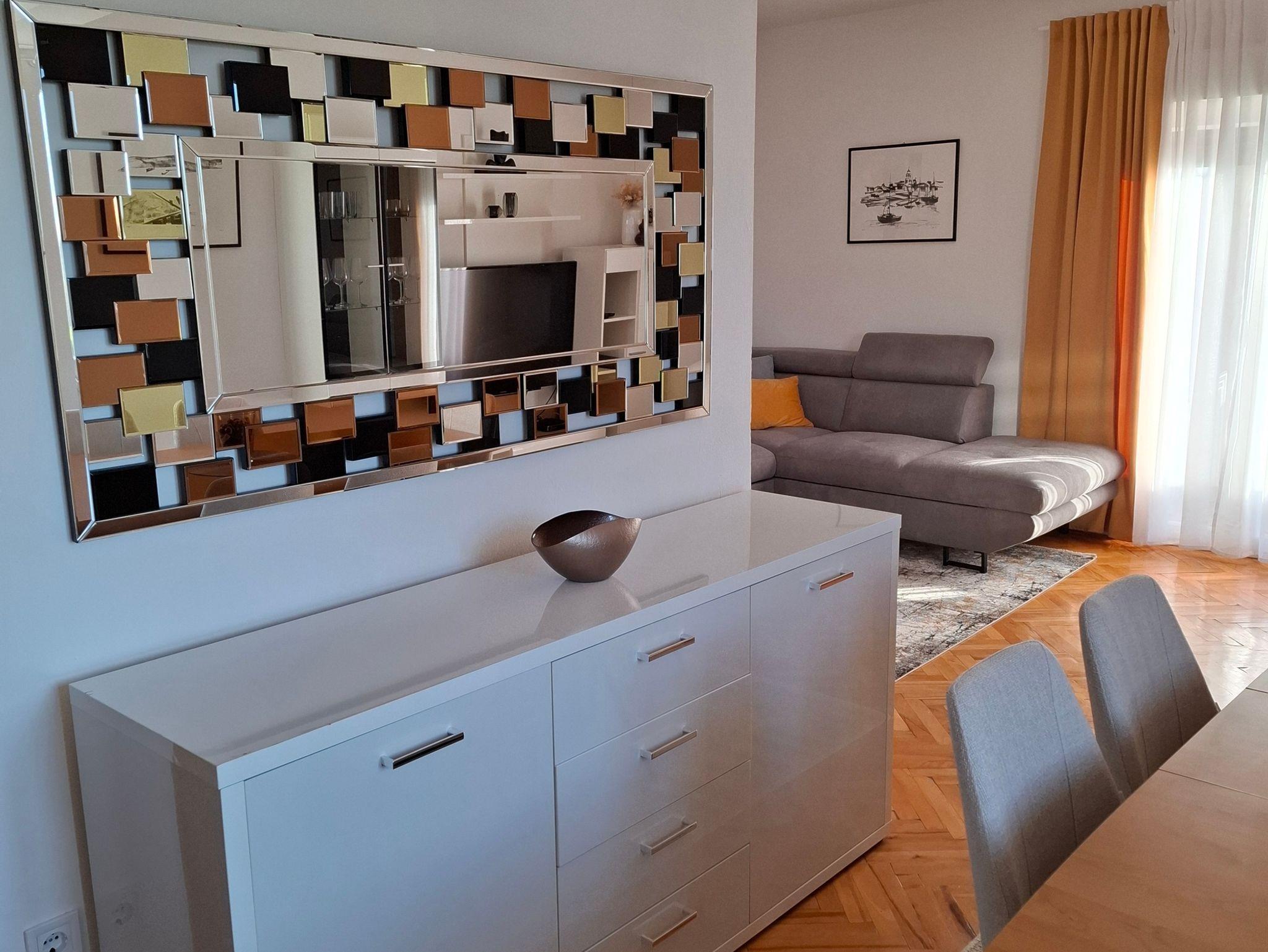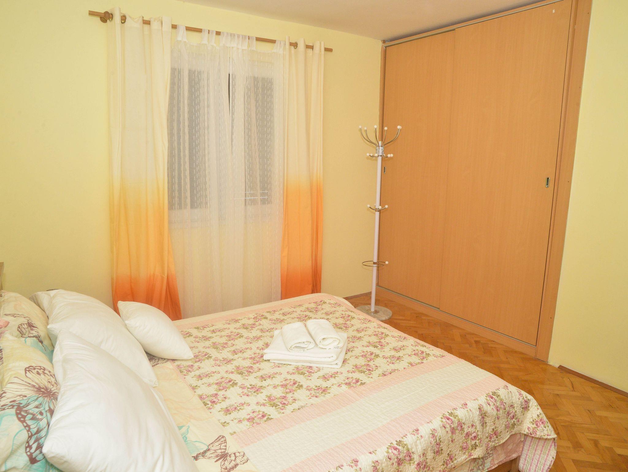 Ferienwohnung bietet Platz für 8 Gäste. Die Betten sind in Schlafzimmern, die es 3 gibt, und in Wohnzimmer, innerhalb einer Gesamtfläche von 102m2, angeordnet. Die Gäste haben eine eigene Terrasse zur Verfügung, auf der sie in warmen Sommernächten genießen können. Für vollen Genuss und Entspannung gibt es einen privaten Grill für Gäste dieser Unterkunft. Während ihres Aufenthalts können Gäste das gemeinsam zur Nutzung stehende Schwimmbad benutzen. IM PREIS INBEGRIFFEN: Kurtaxe, Endreinigung, Klimatisierung, Pool, Parkplatz, Internet, Kinderbett, Bügeleisen, Bügelbrett, Föhn, Sonnenschirm. VERBINDLICHE ZUSÄTZLICHE KOSTEN: Aufzahlung für Kurzaufenthalte (prozentualer Zuschlag pro Nächtigungsanzahl: 30% - 1, 20% - 2, 10% - 3). Die Verfügbarkeit zusätzlicher Dienstleistungen in Ihrem reservierten Termin und die Preise derselben (falls nicht aufgeführt) müssen im Voraus überprüft werden. Zusätzliche Dienstleistungen die in der Zahlungsaufforderung nicht aufgeführt sind werden direkt beim Vermieter bezahlt, angenommen der Gast nutzt auch diese. Ermäßigung auf den Grundpreis: Gratistag 14=13 (bei einem Aufenthalt von 14 Tagen oder mehr erhalten Sie einen Gratistag für den Aufenthalt bis 31.12.26).