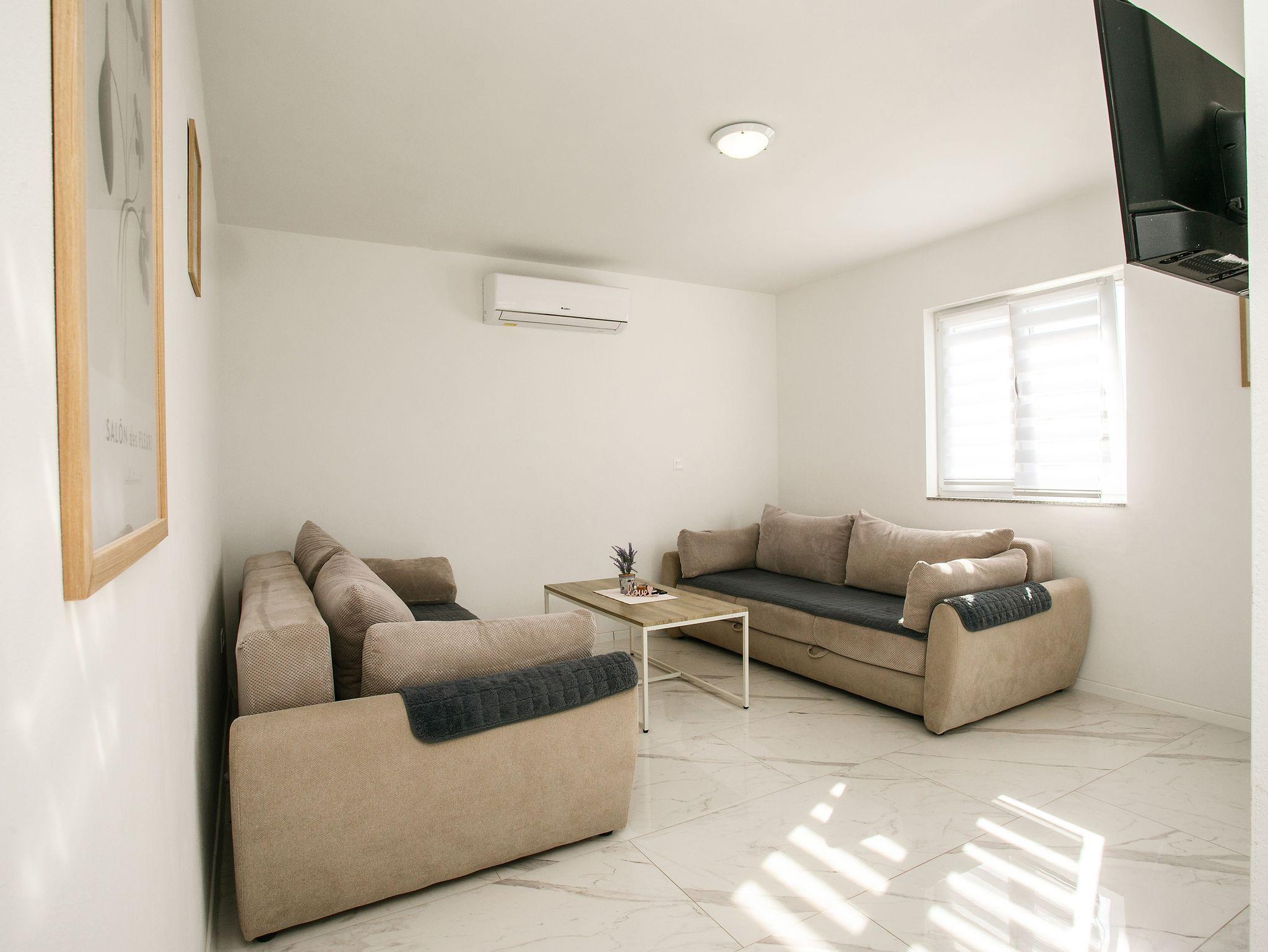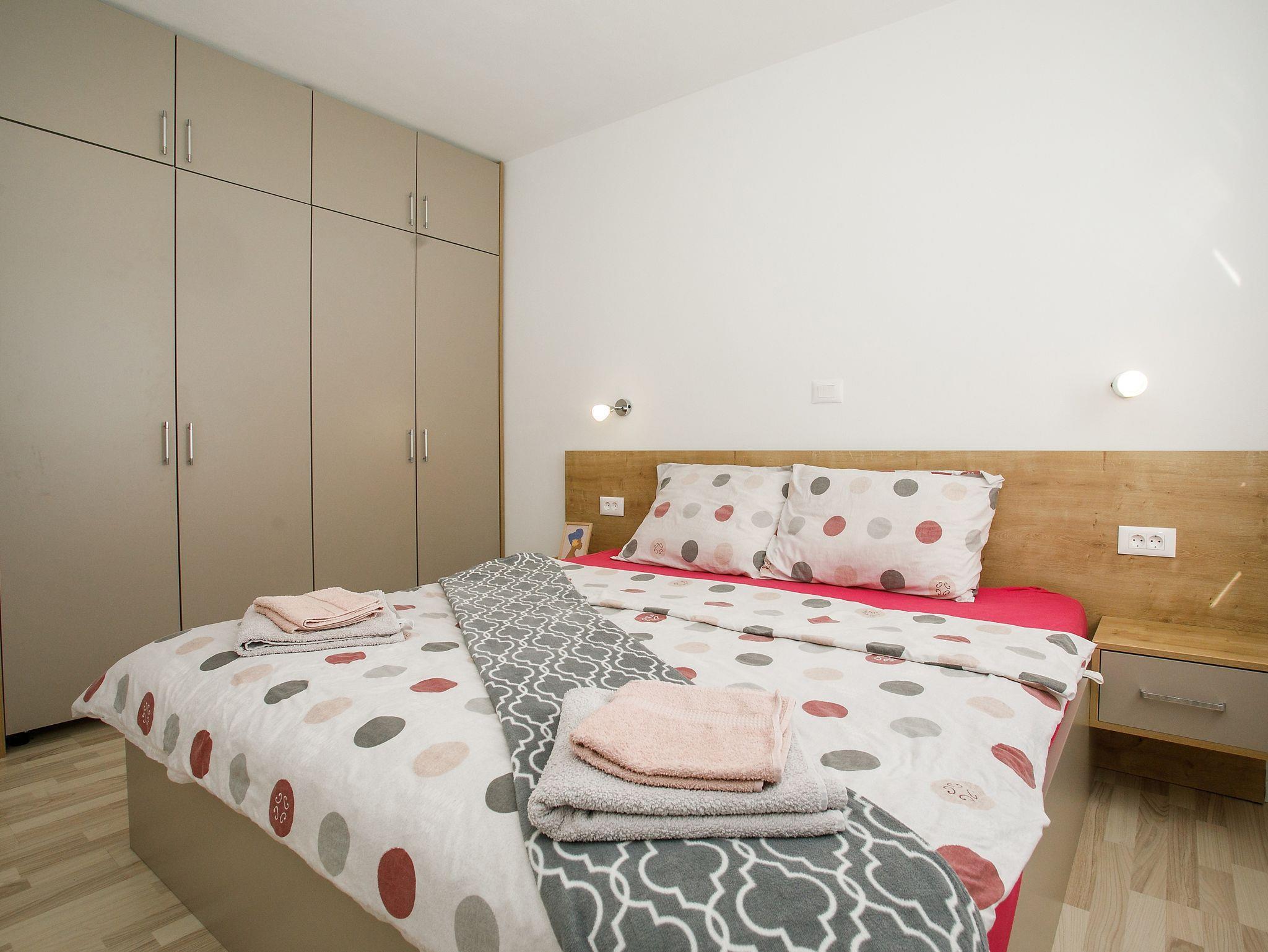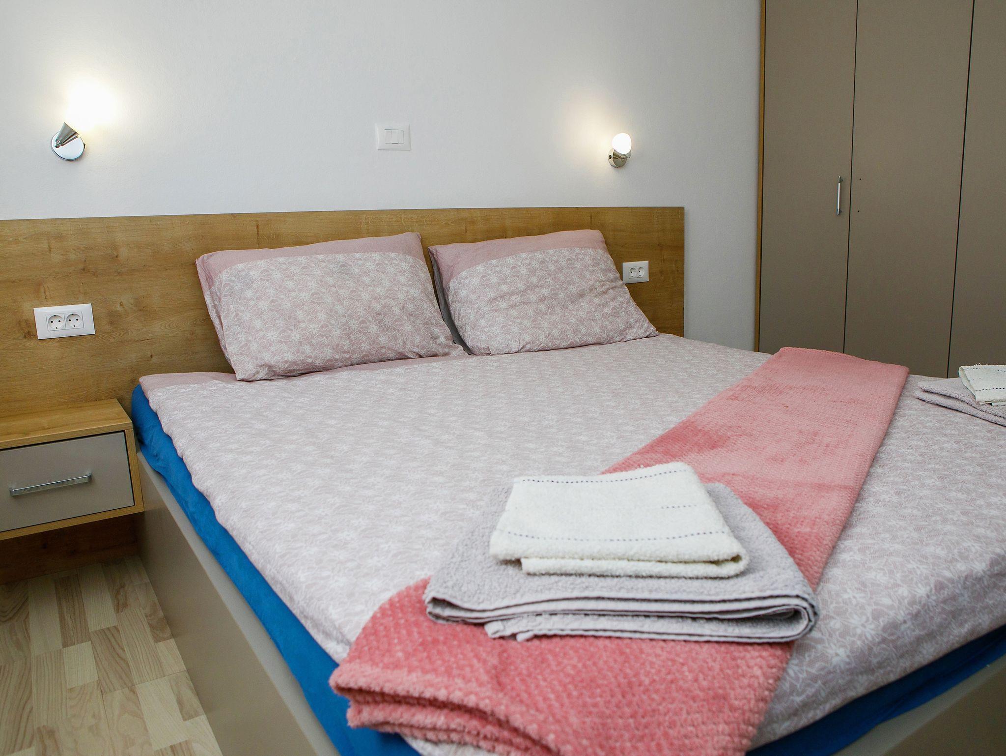 Ferienwohnung bietet Platz für 6 Gäste. Die Betten sind in Schlafzimmern, die es 2 gibt, und in Wohnzimmer, innerhalb einer Gesamtfläche von 74m2, angeordnet. Die Gäste haben eine eigene Terrasse zur Verfügung, auf der sie in warmen Sommernächten genießen können. Es ist erlaubt, Speisen auf dem Gemeinschafts-Grill vorzubereiten. Während ihres Aufenthalts können Gäste das gemeinsam zur Nutzung stehende Schwimmbad benutzen. IM PREIS INBEGRIFFEN: Kurtaxe, Endreinigung, Klimatisierung, Pool, Parkplatz, Internet, Wäschewaschen, Kinderbett, Bügeleisen, Bügelbrett, Föhn. Die Verfügbarkeit zusätzlicher Dienstleistungen in Ihrem reservierten Termin und die Preise derselben (falls nicht aufgeführt) müssen im Voraus überprüft werden. Zusätzliche Dienstleistungen die in der Zahlungsaufforderung nicht aufgeführt sind werden direkt beim Vermieter bezahlt, angenommen der Gast nutzt auch diese. Ermäßigung auf den Grundpreis: Gratistag 14=13 (bei einem Aufenthalt von 14 Tagen oder mehr erhalten Sie einen Gratistag für den Aufenthalt bis 31.12.26).