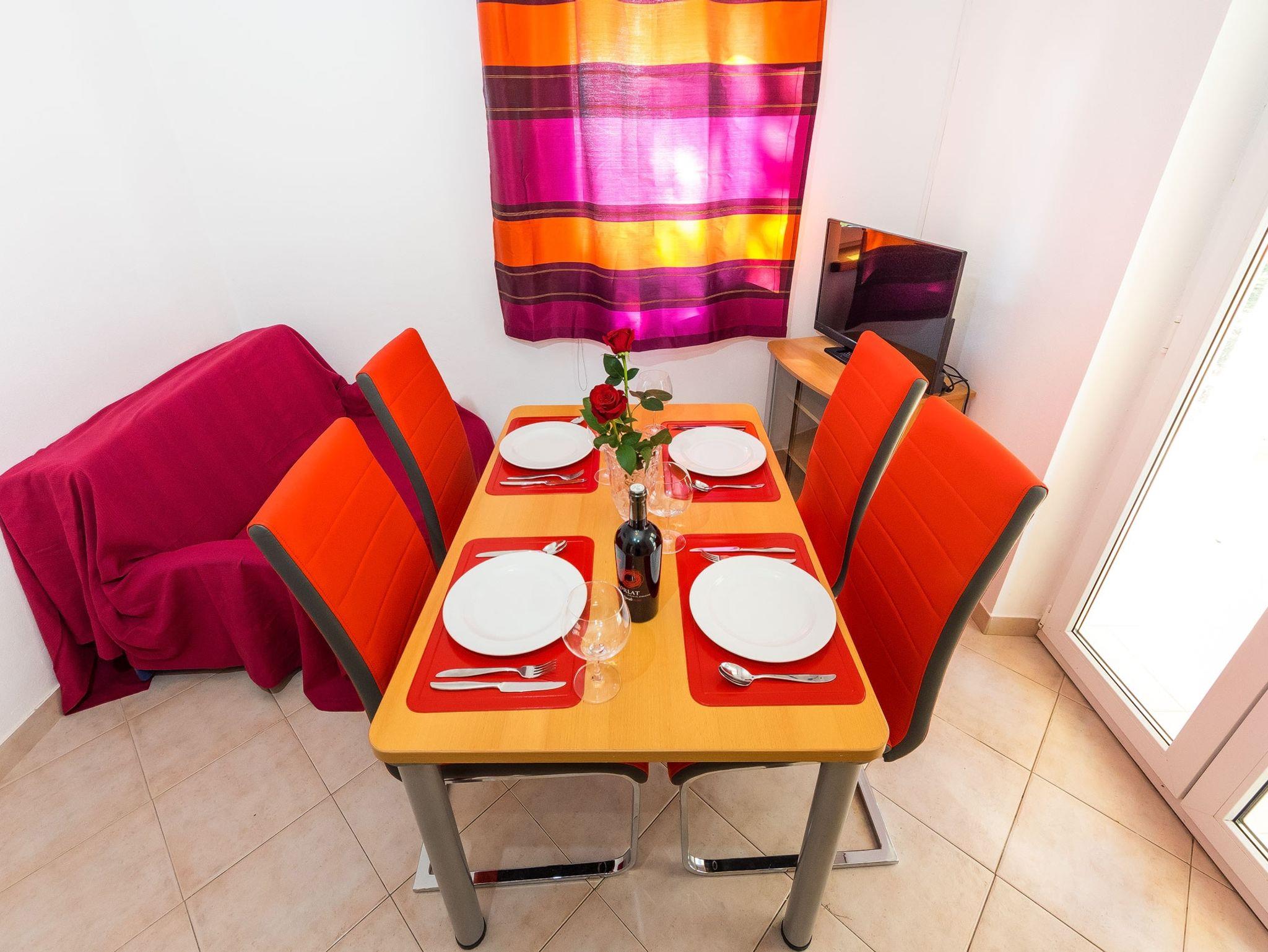 Ferienwohnung bietet Platz für 4 Gäste. Die Betten sind in Schlafzimmern, die es 1 gibt, und in Esszimmer, innerhalb einer Gesamtfläche von 30m2, angeordnet. Die Gäste haben eine eigene Terrasse zur Verfügung, auf der sie in warmen Sommernächten genießen können. Das Apartment bietet Meerblick. Es ist erlaubt, Speisen auf dem Gemeinschafts-Grill vorzubereiten. IM PREIS INBEGRIFFEN: Kurtaxe, Endreinigung, Klimatisierung, Parkplatz, Internet, Wäschewaschen, Kinderbett, Bügeleisen, Bügelbrett, Föhn, Sonnenschirm, Liegestühle. VERBINDLICHE ZUSÄTZLICHE KOSTEN: Aufzahlung für Kurzaufenthalte (prozentualer Zuschlag pro Nächtigungsanzahl: 30% - 1, 20% - 2, 10% - 3). UNVERBINDLICHE ZUSÄTZLICHE KOSTEN: Zusatzbett (8,00 € pro Nacht). Die Verfügbarkeit zusätzlicher Dienstleistungen in Ihrem reservierten Termin und die Preise derselben (falls nicht aufgeführt) müssen im Voraus überprüft werden. Zusätzliche Dienstleistungen die in der Zahlungsaufforderung nicht aufgeführt sind werden direkt beim Vermieter bezahlt, angenommen der Gast nutzt auch diese.