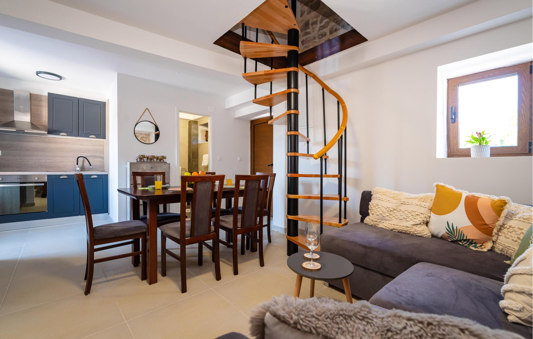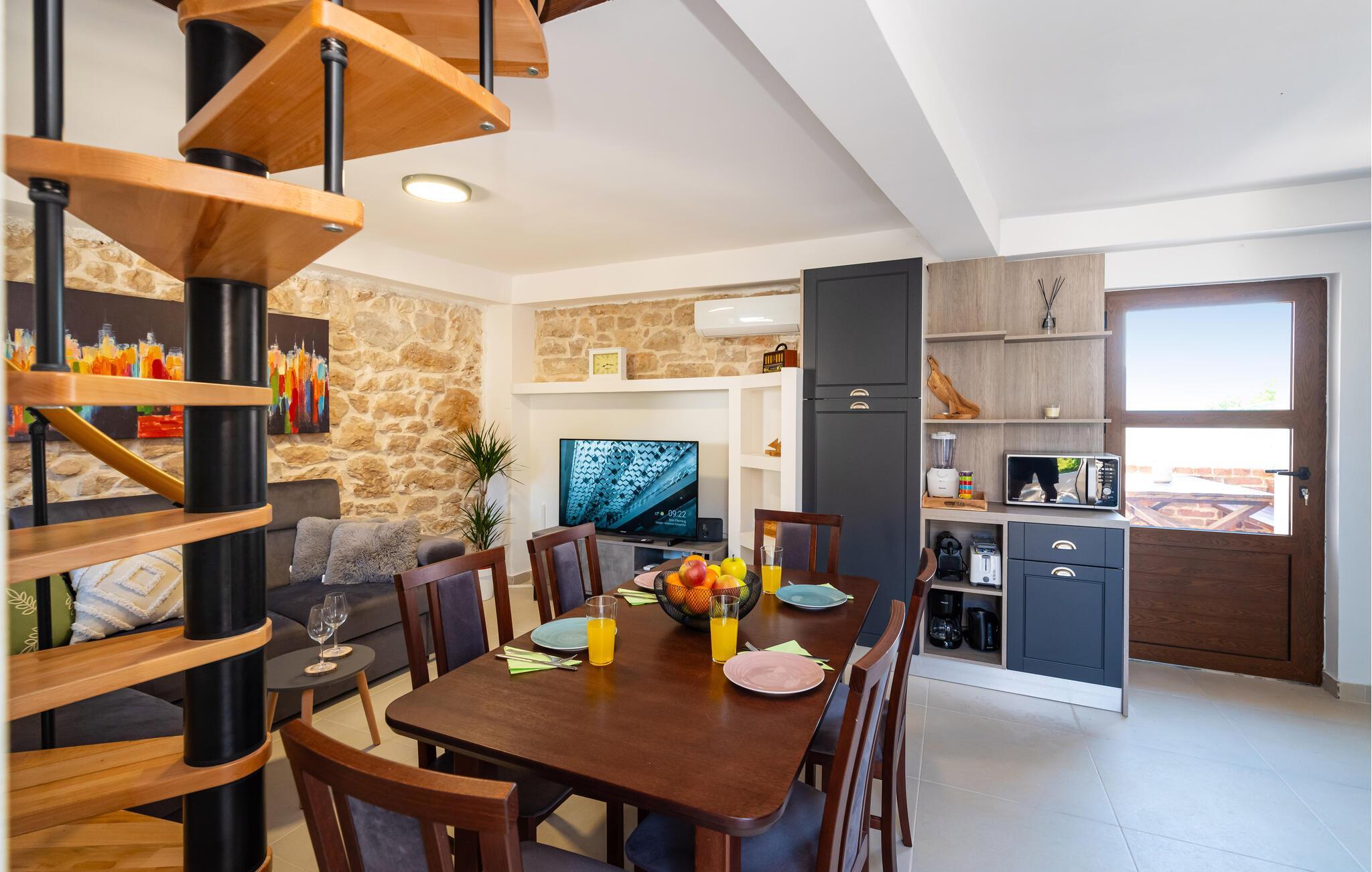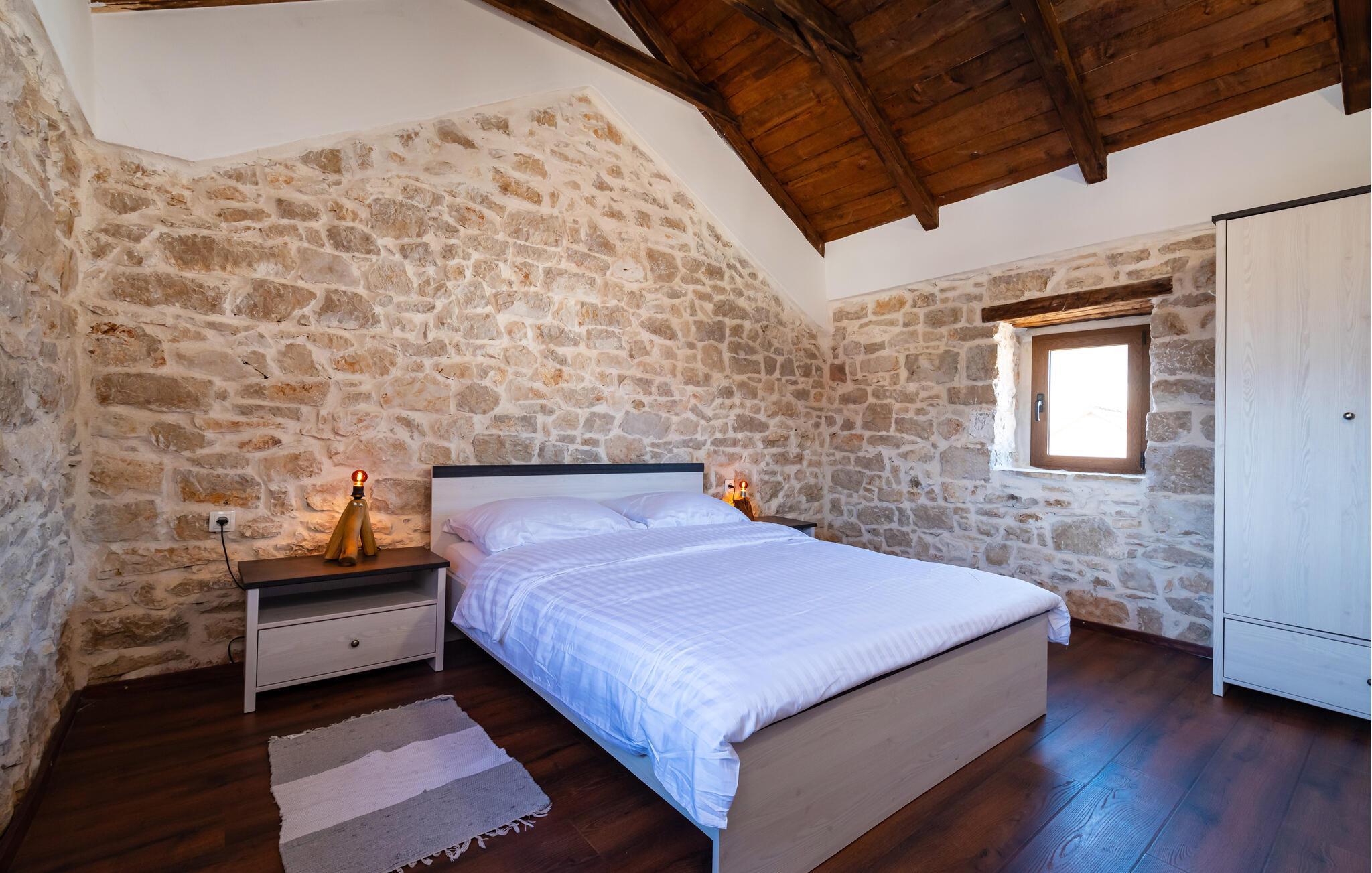 Huset er flot og komortabelt indrettet og byder på en gennemtænkt kombination af rustikke stenvægge og moderne faciliteter. En vindeltrappe fører op til øverste etage, hvor I finder to soveværelser med et højt gavlloft.