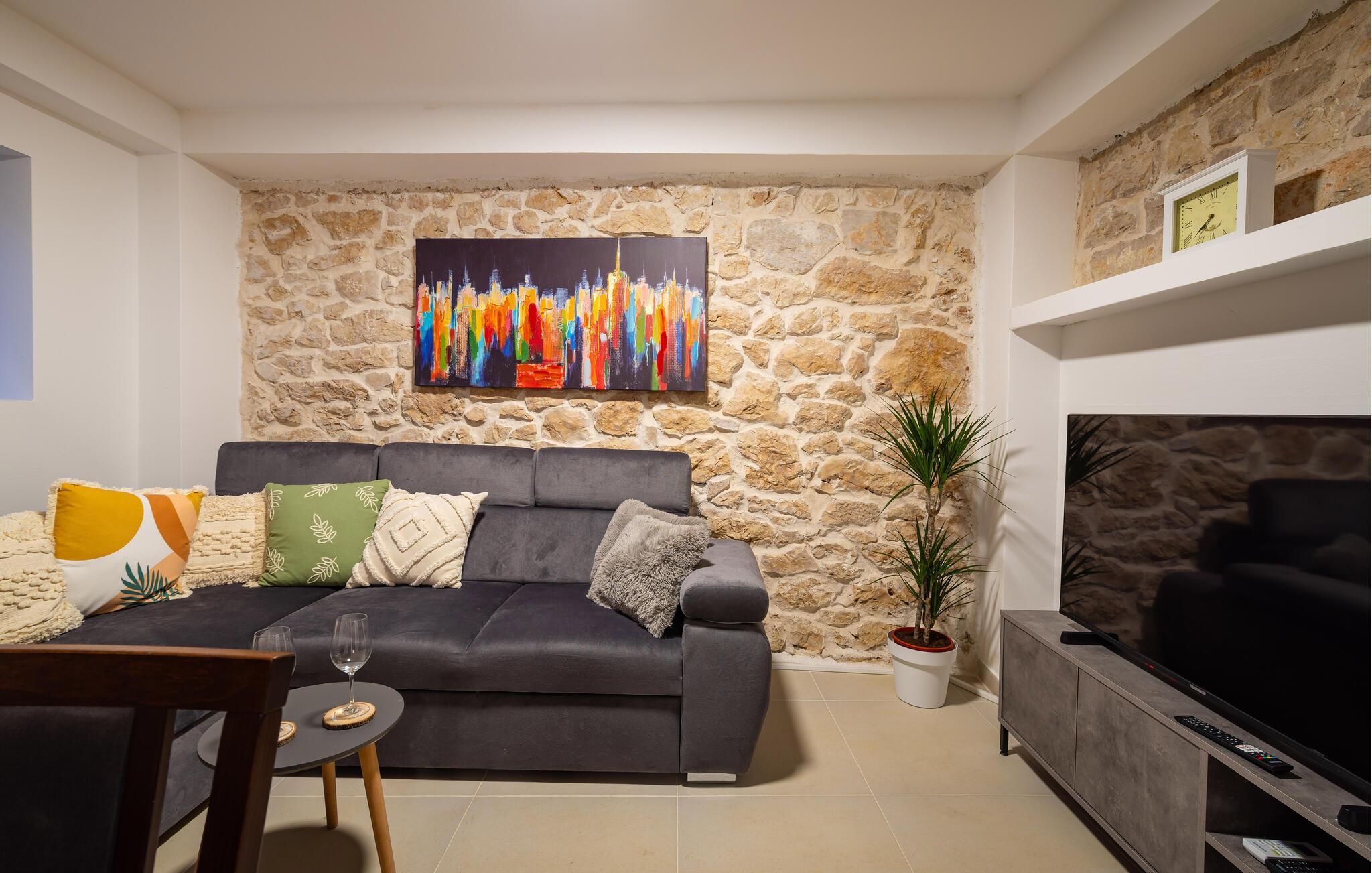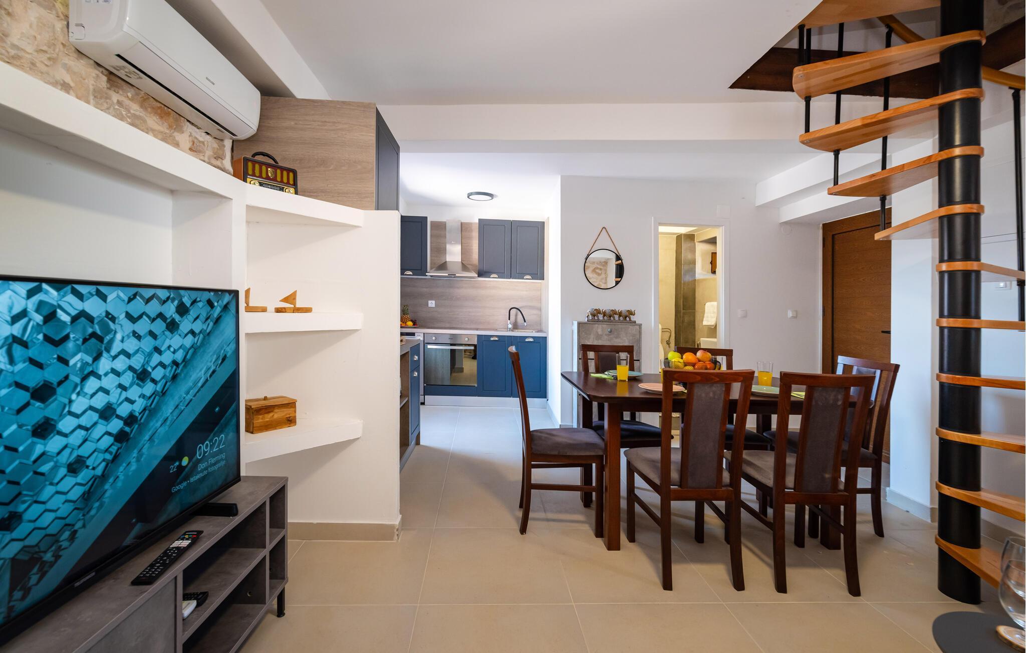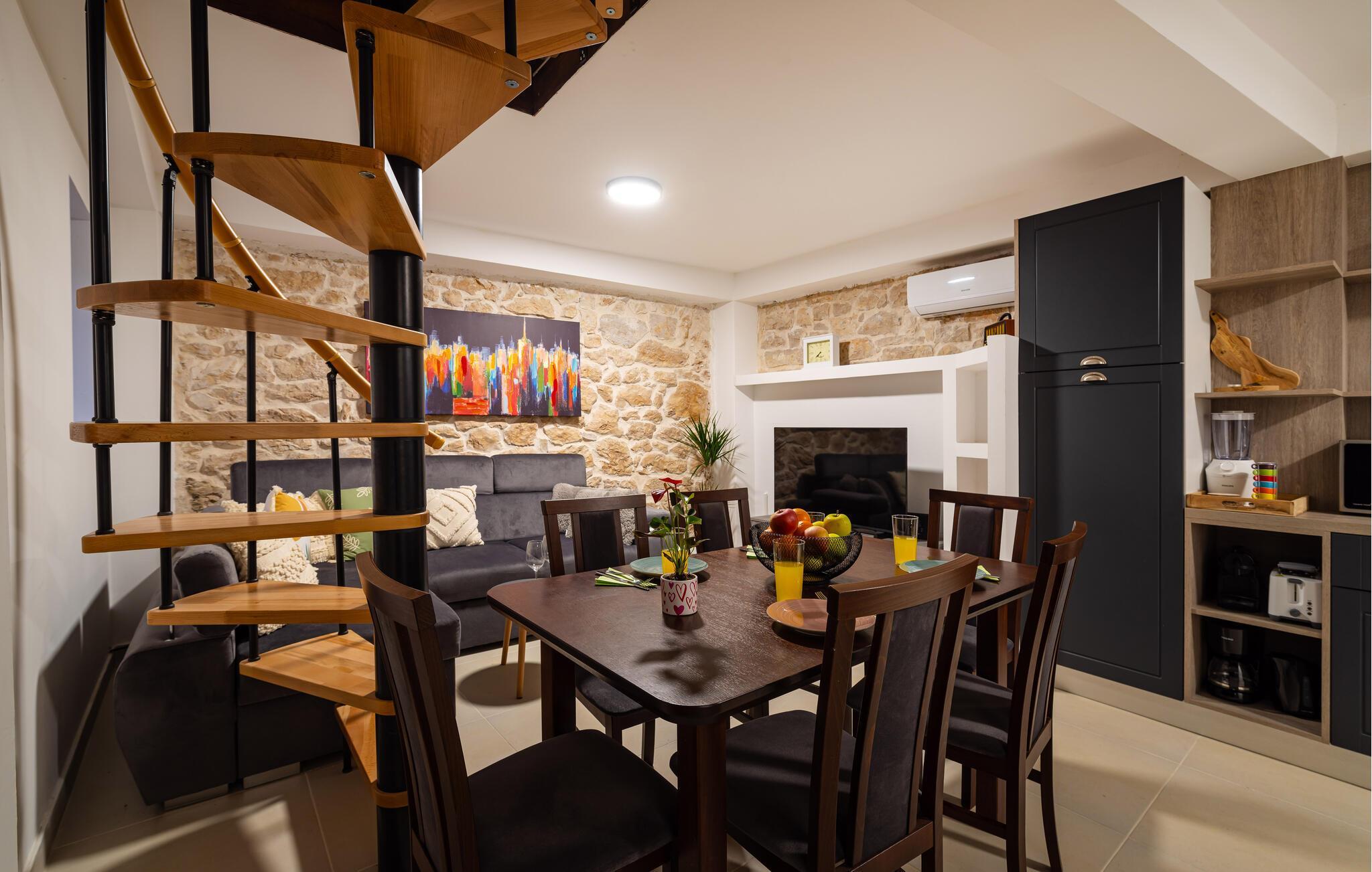 Huset er flot og komortabelt indrettet og byder på en gennemtænkt kombination af rustikke stenvægge og moderne faciliteter. En vindeltrappe fører op til øverste etage, hvor I finder to soveværelser med et højt gavlloft.