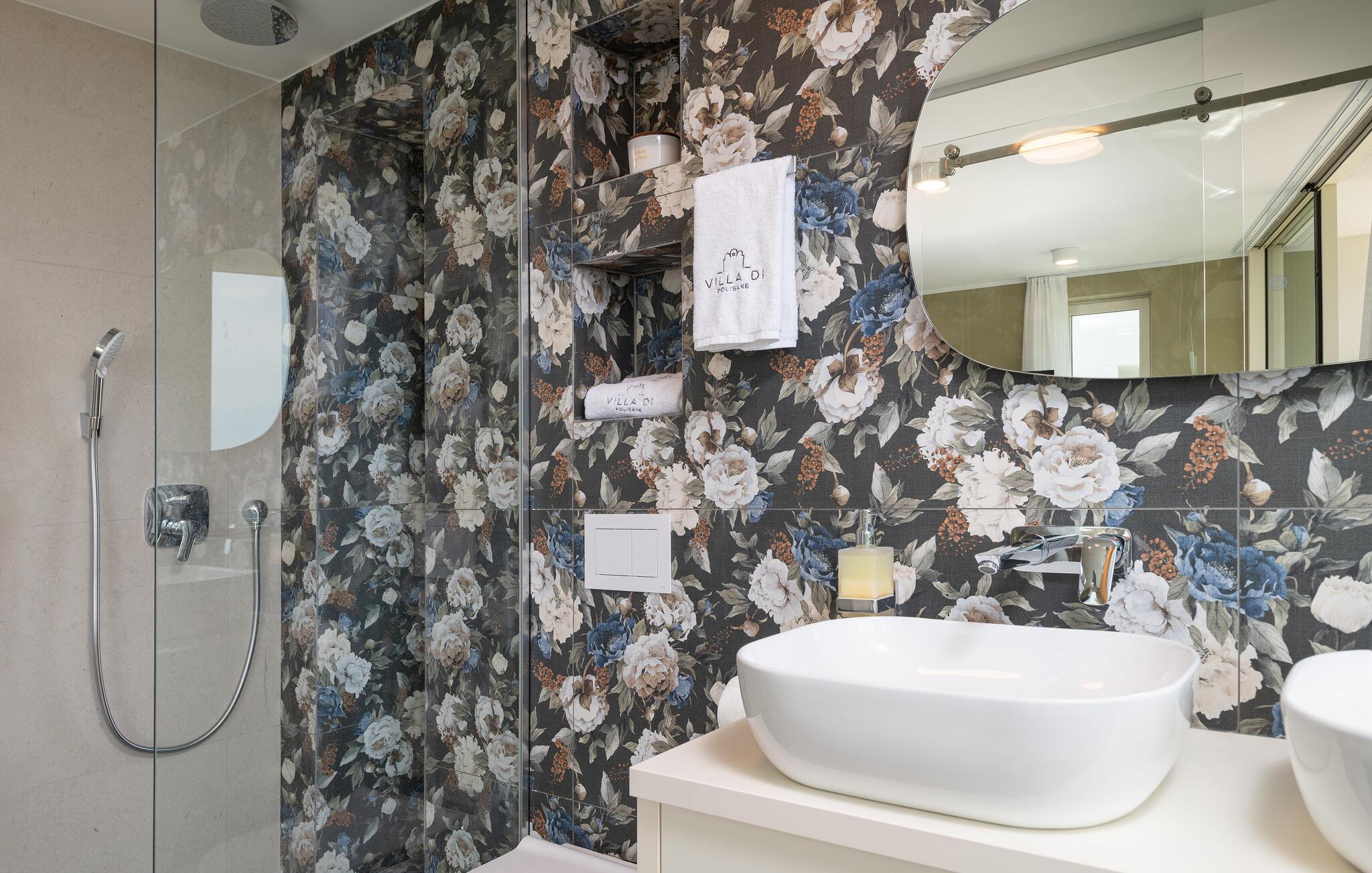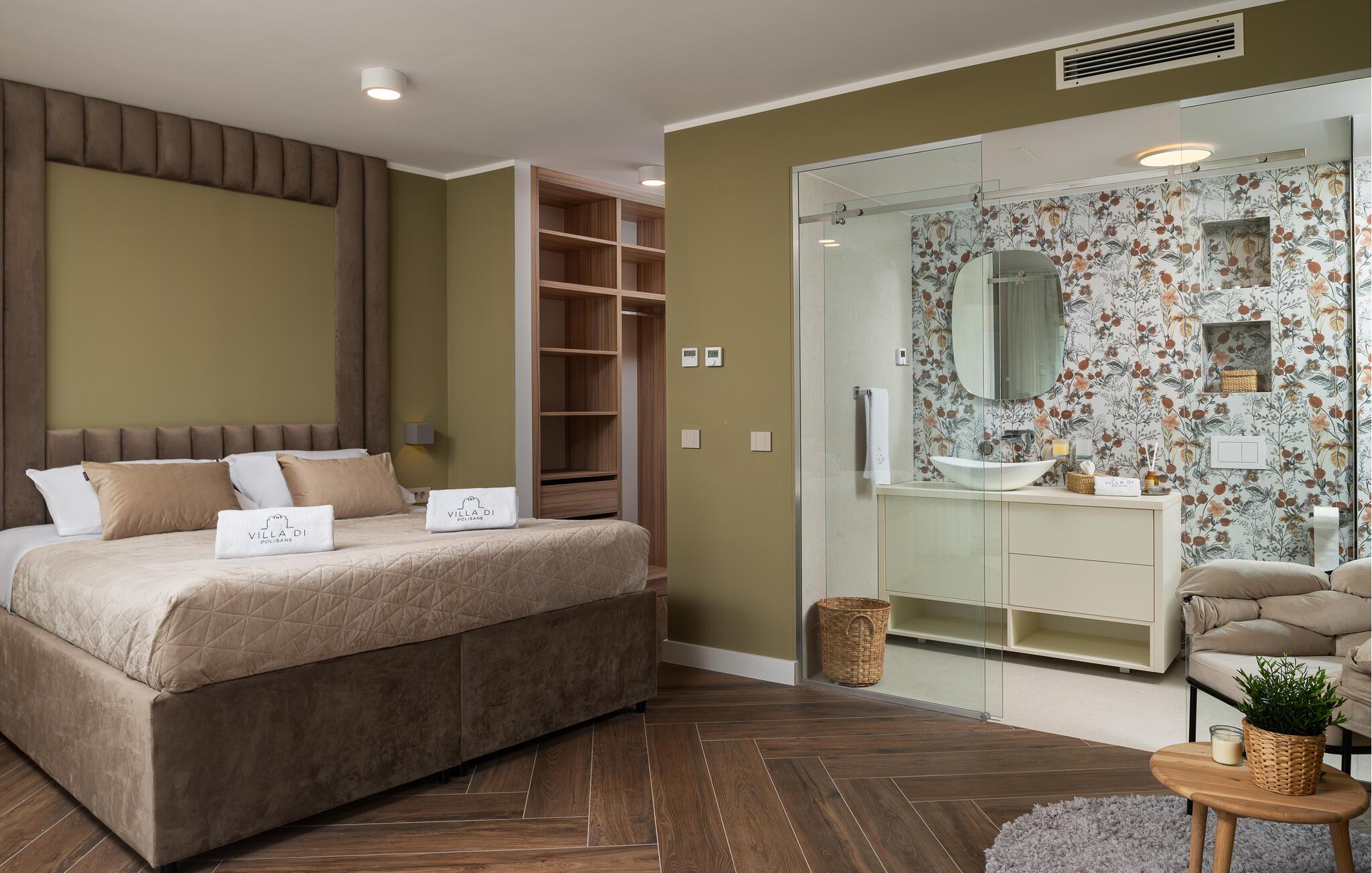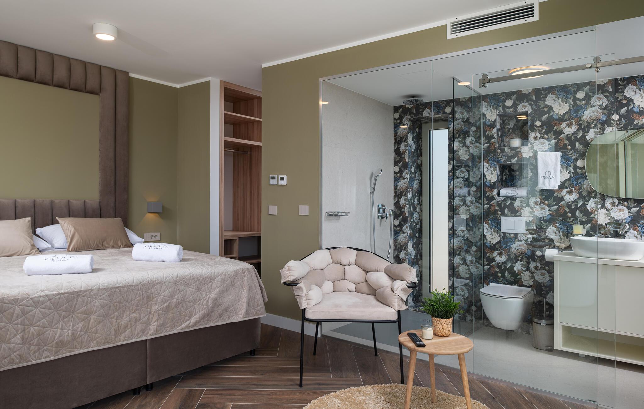 Dette moderne hus ligger i rolige omgivelser og byder jer velkommen med sin spændende arkitektur, der afspejler stilen fra de lokale kirker. Stilfulde designermøbler, natursten og varme trænuancer skaber en elegant, men indbydende atmosfære indenfor, der får jer til at føle jer hjemme. Det rummelige spa-område med sauna og spabad tilbyder den perfekte afslapning, og I kan nyde hyggelige aftener i villaens konoba (taverna).