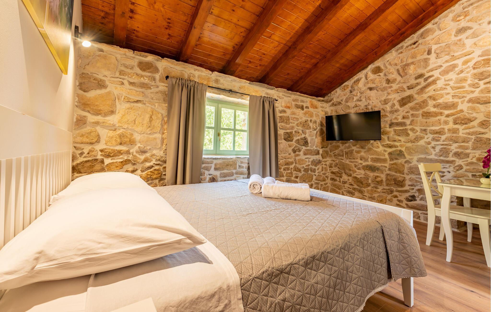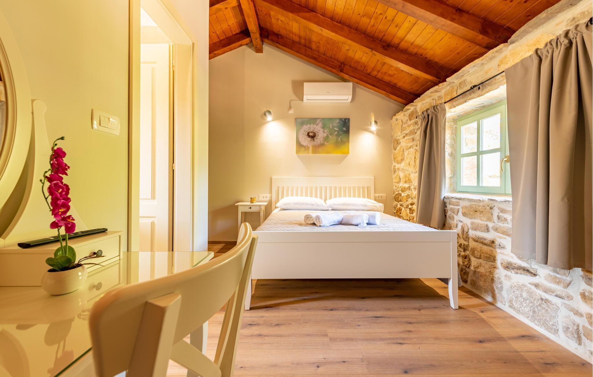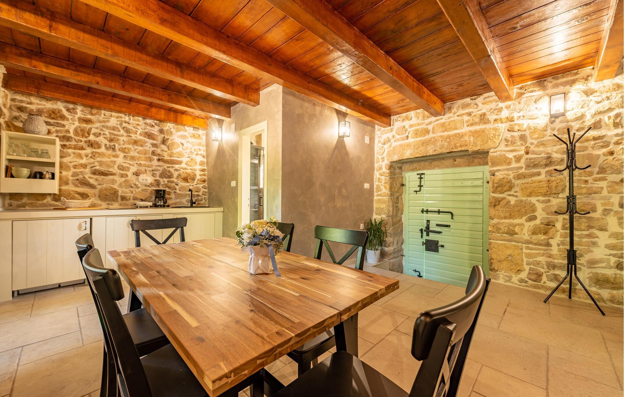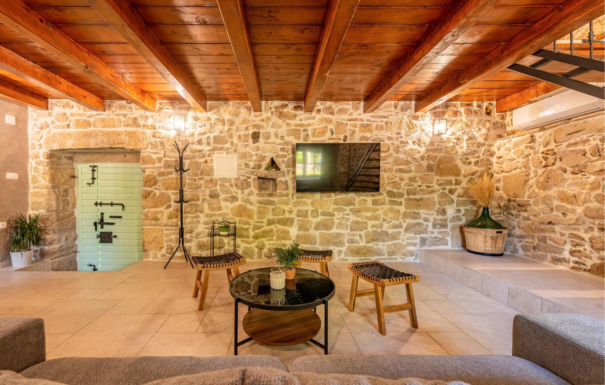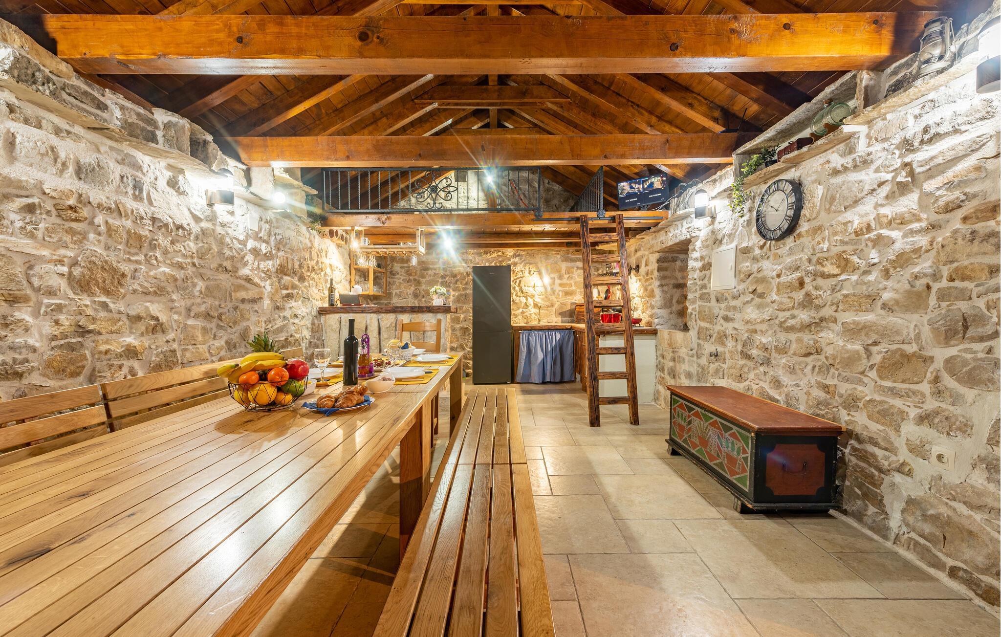 Indretningen er virkelig flot og kombinerer de rustikke stenvægge og trælofter med god, moderne komfort og et veludstyret køkken, der er med til at gøre jeres ferie helt og aldeles ubekymret fra det øjeblik, I stiller kufferterne.