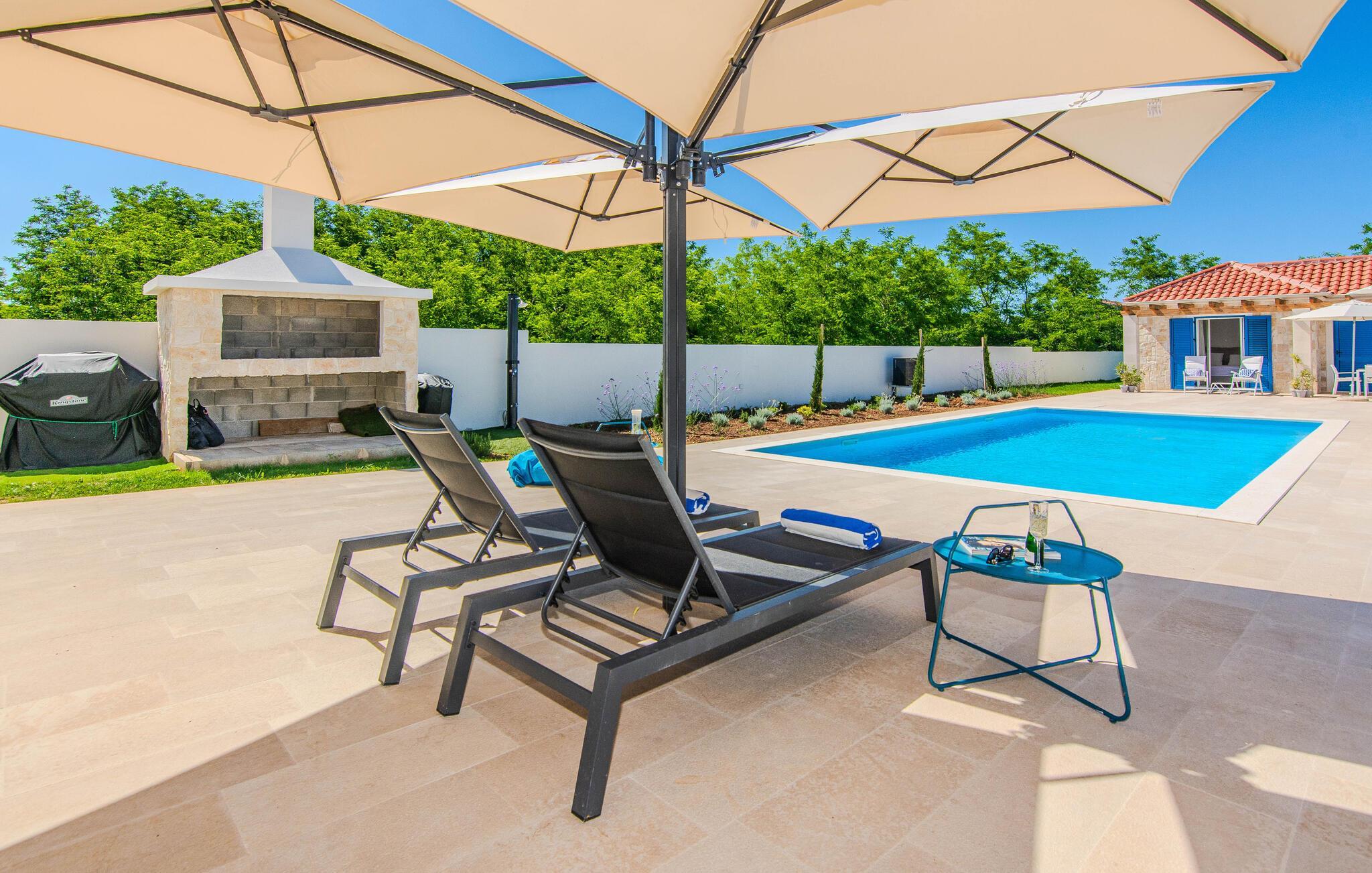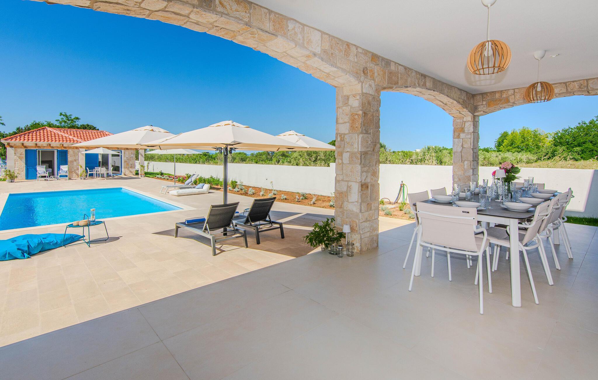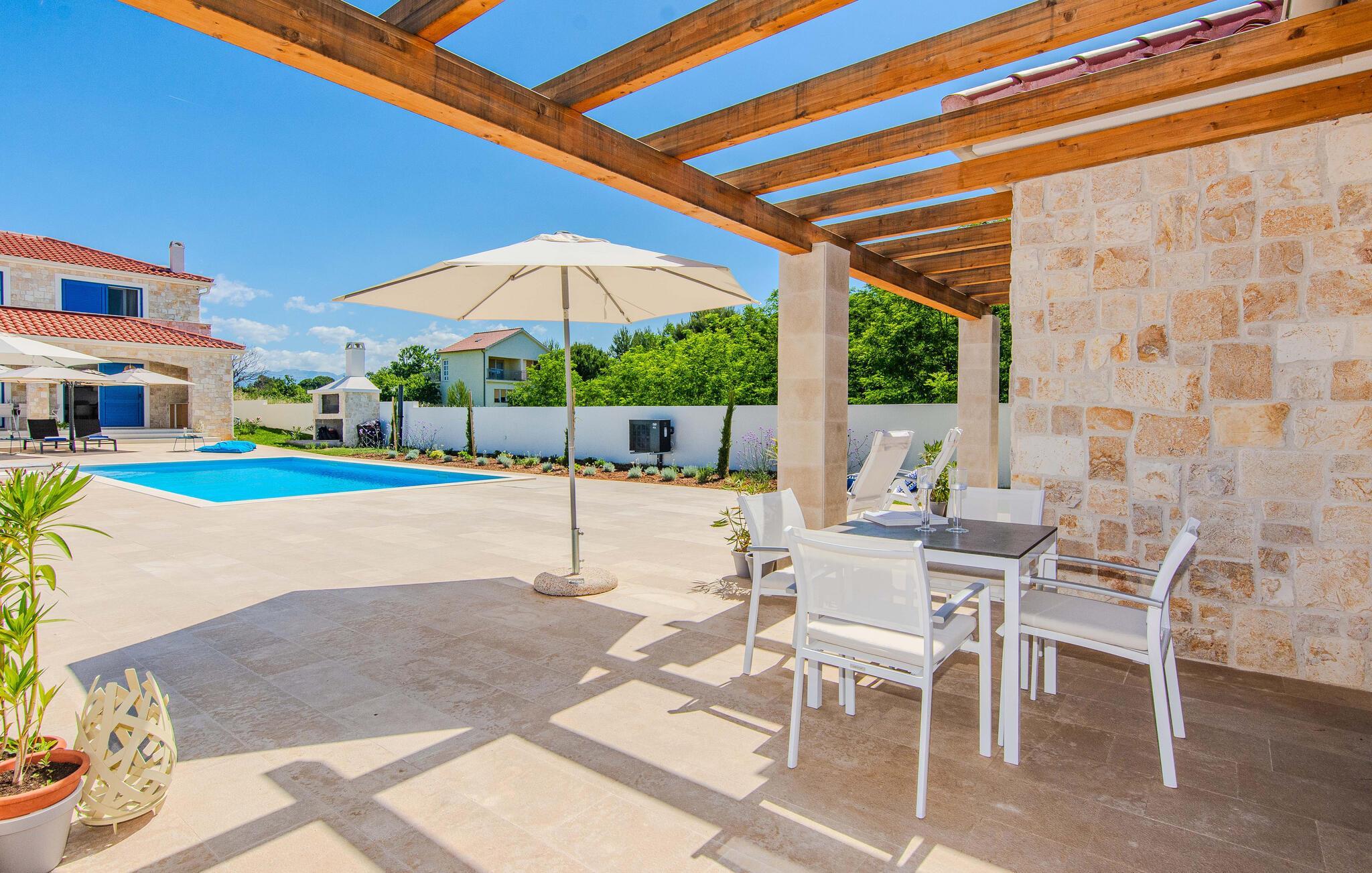 Hop ind i den rummelige pool og slap af på de komfortable liggestole eller nyd morgenmaden i det overdækkede udendørsområde med udsigt over middelhavslandskabet. Den smagfuldt designede stenfacade og de karakteristiske skodder giver huset en charmerende, dalmatisk karakter. Trampolinen i haven sørger for sjov hoppesjov for de små feriegæster.