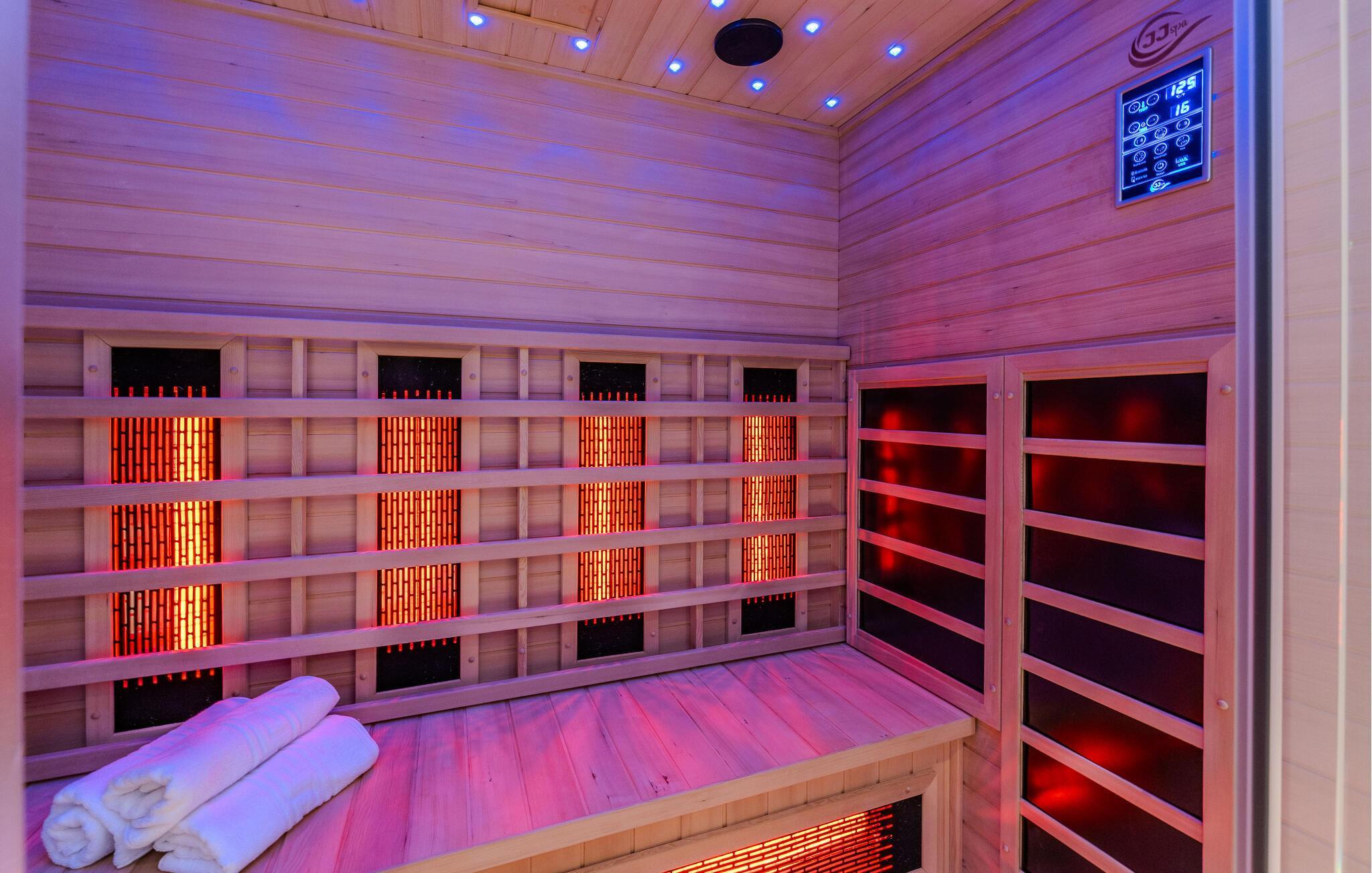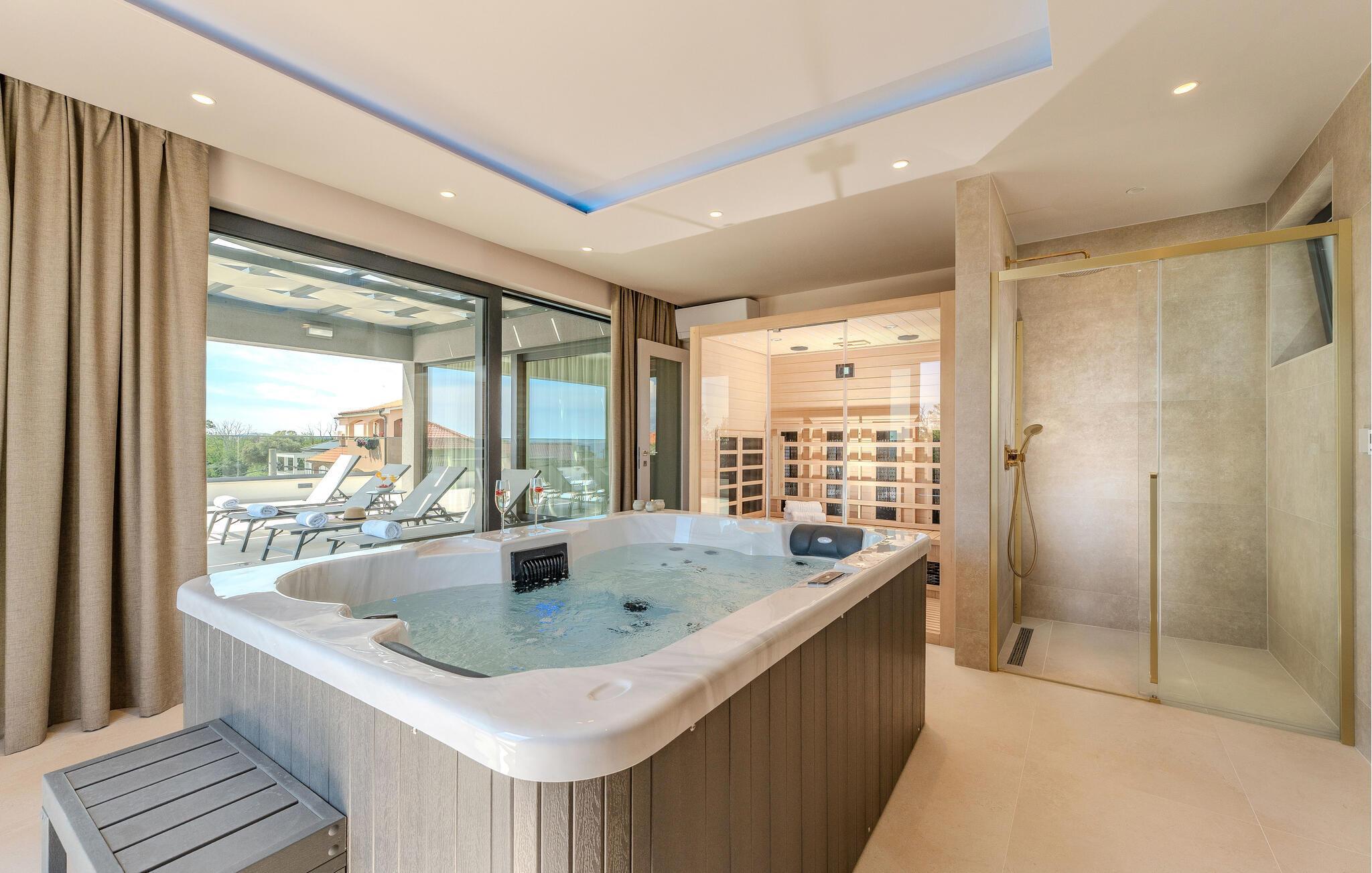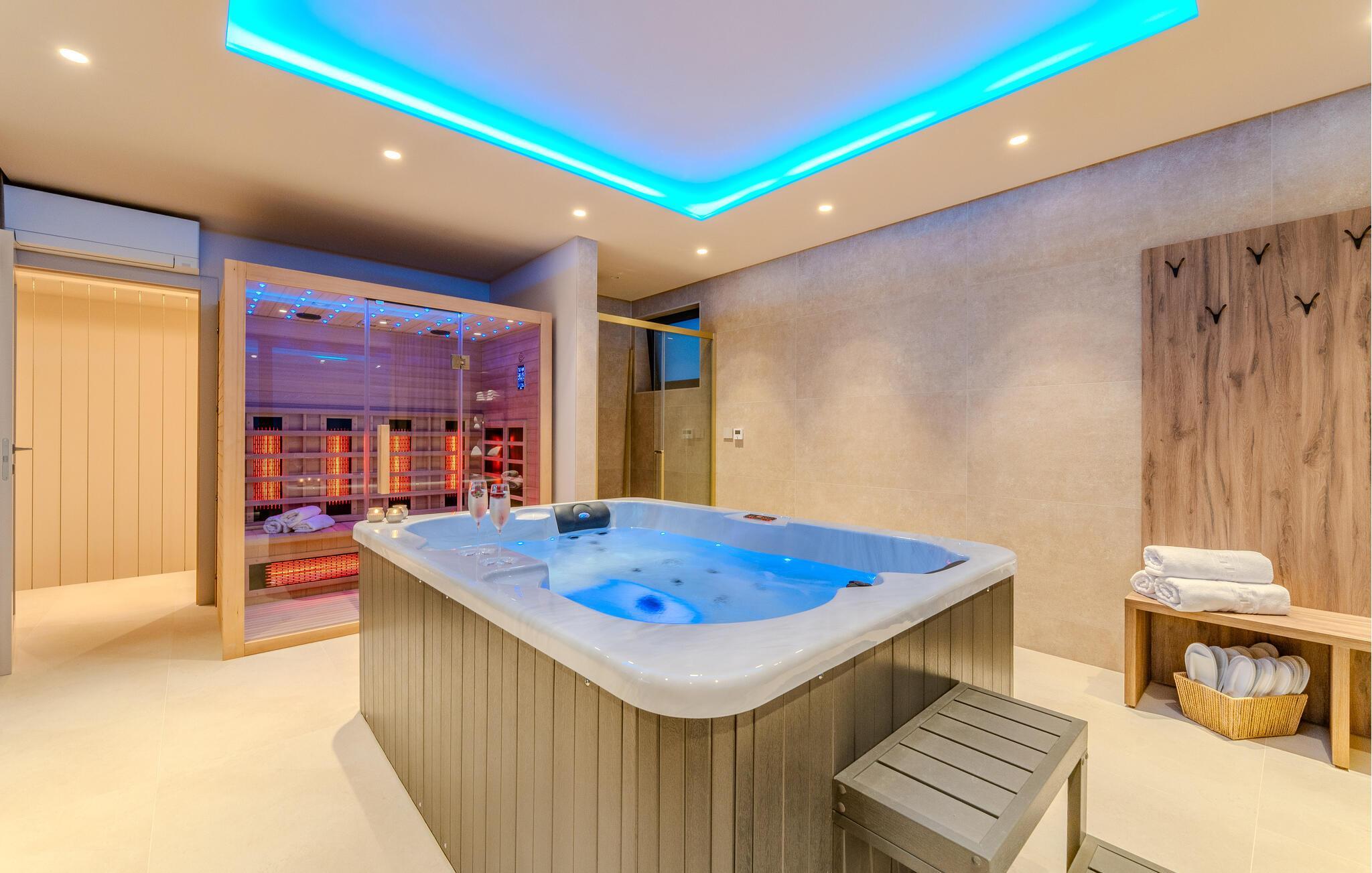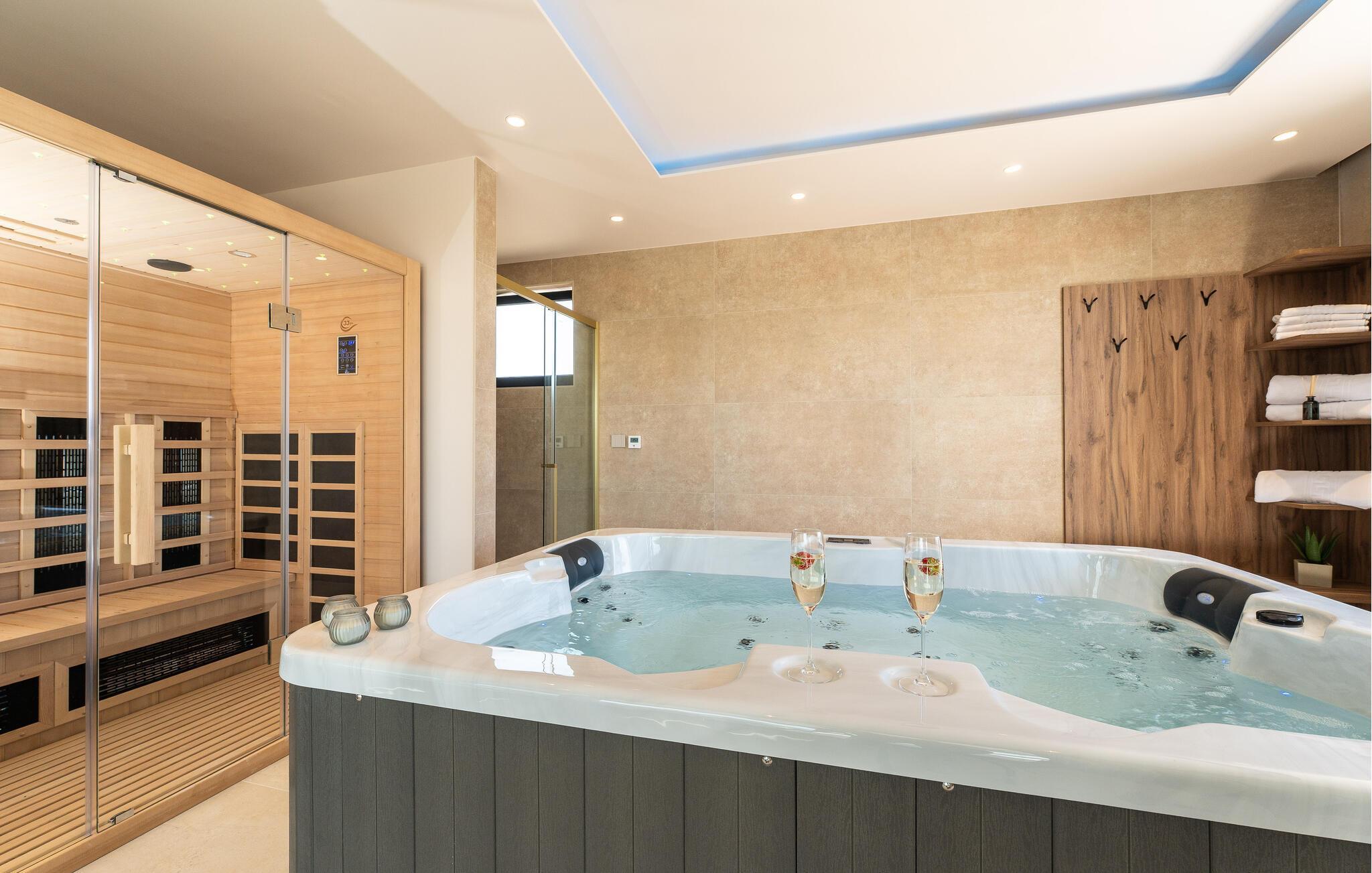 Begynd dagene med en afslappende dukkert i poolen og nyd en lækker morgenmad på den skyggefulde terrasse. Forkæl jer selv med afslapning i saunaen eller spabadet på øverste etage, mens I kigger ud over det nærliggende hav og lad batterierne op på de behagelige liggestole.