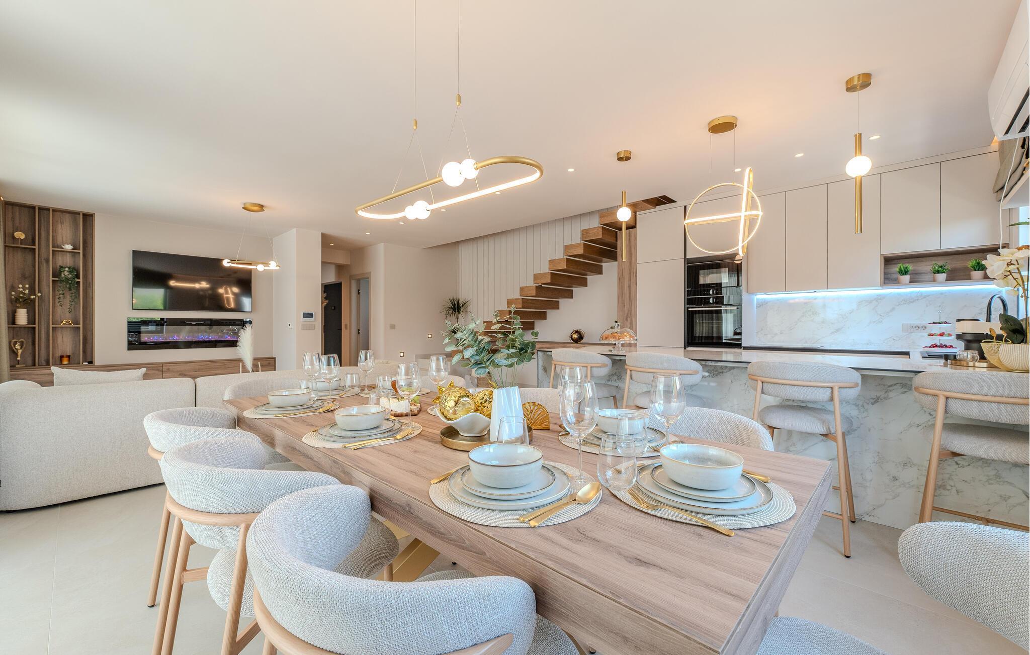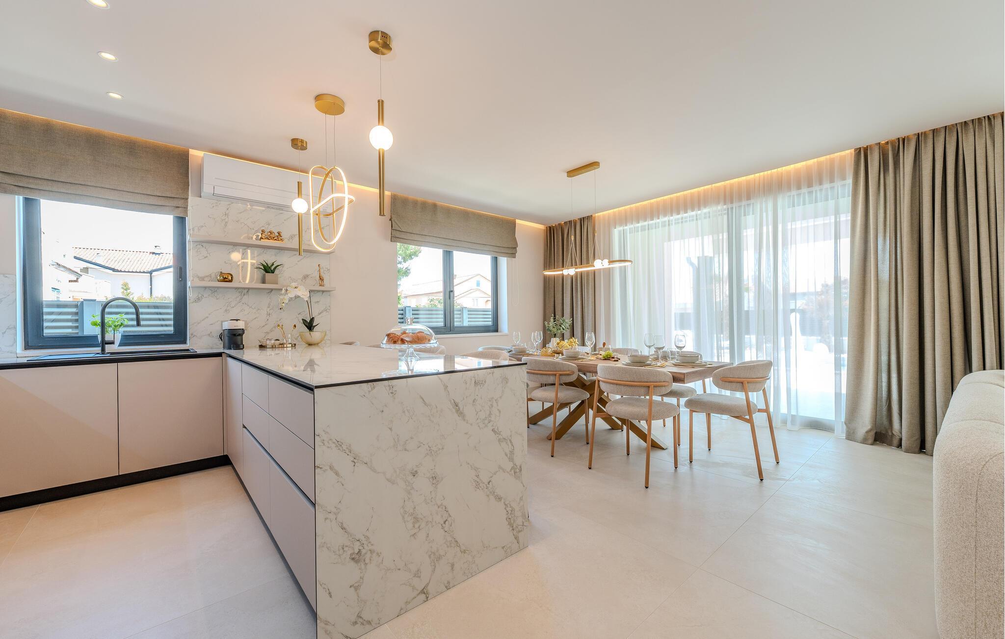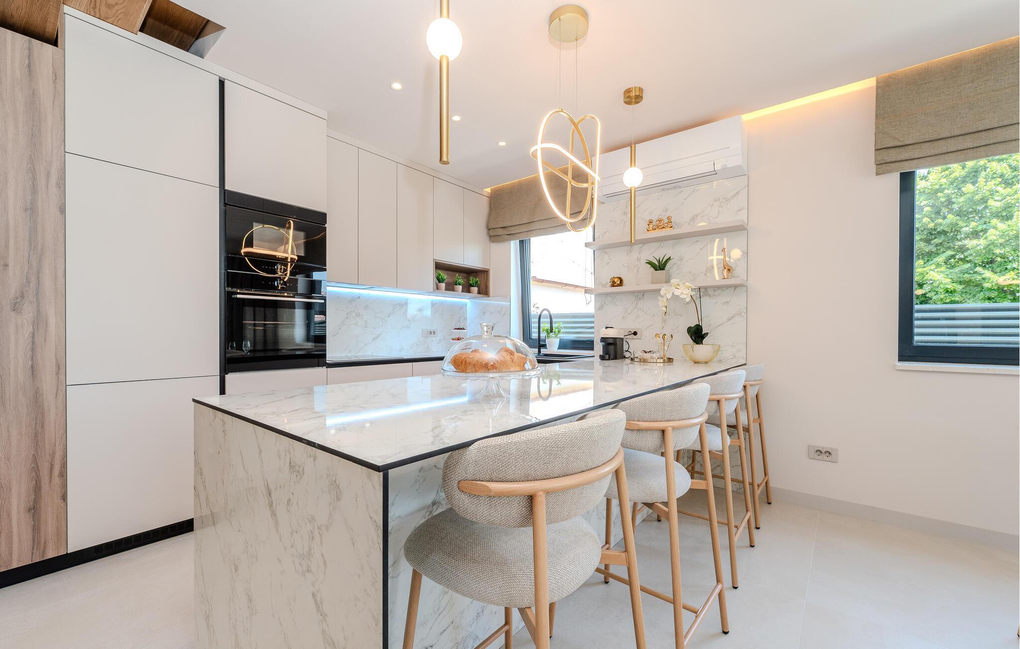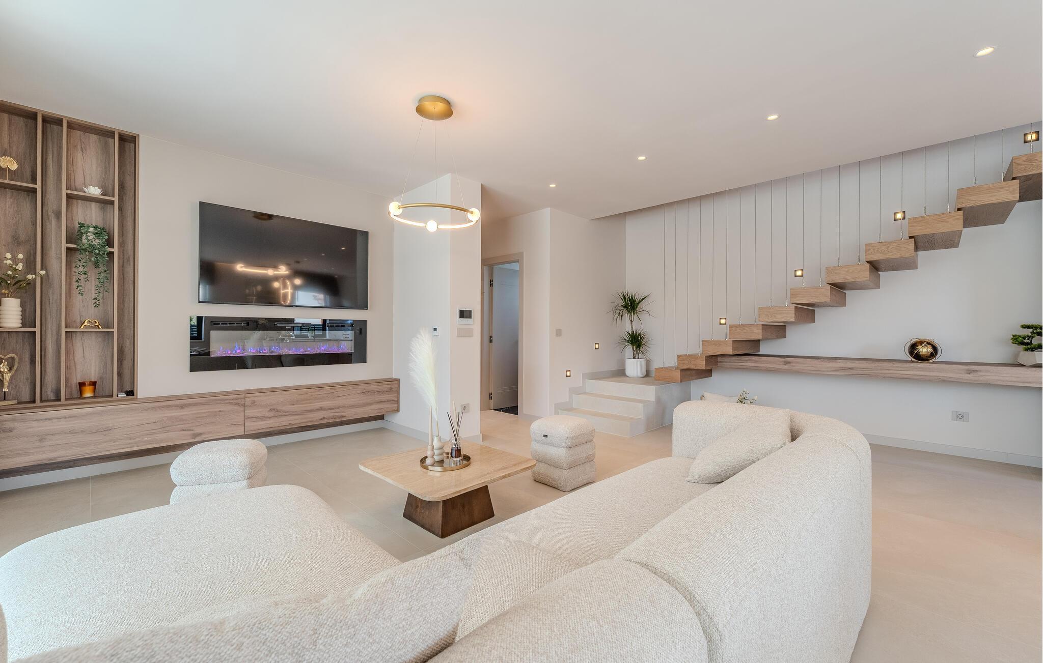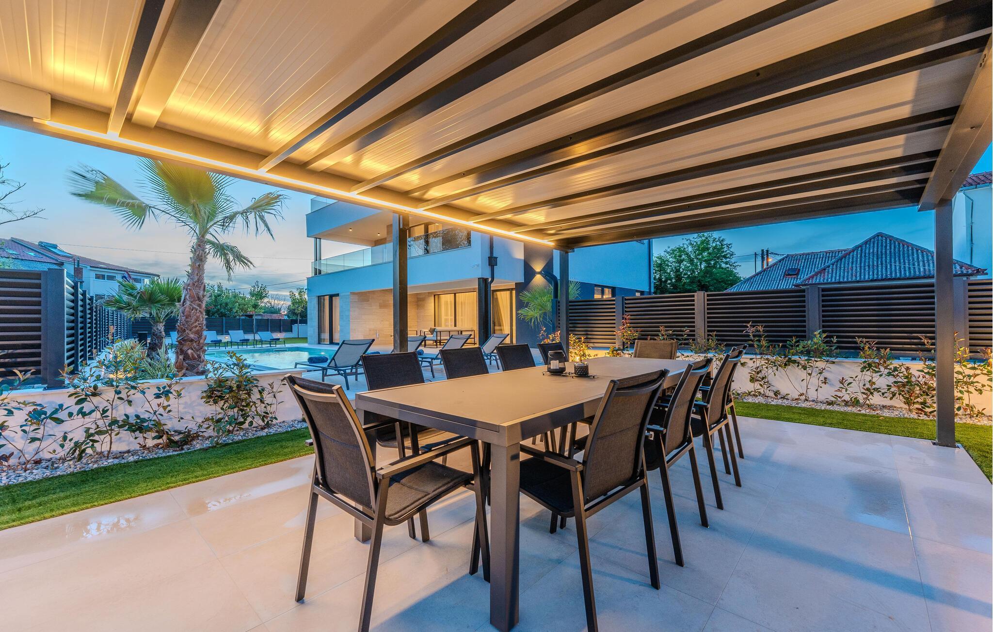 Denne moderne luksusvilla forkæler jer med et lyst, stilfuldt og eksklusivt interiør samt adskillige komfortable ekstrafunktioner. Server et glas vin, mens I tilbereder kulinariske lækkerier i det åbne køkken, og fejr jeres tid sammen med stemningsfulde måltider i den elegante, åbne opholdsstue. Sæt jer i den komfortable designersofa, og stream jeres yndlingsserier.