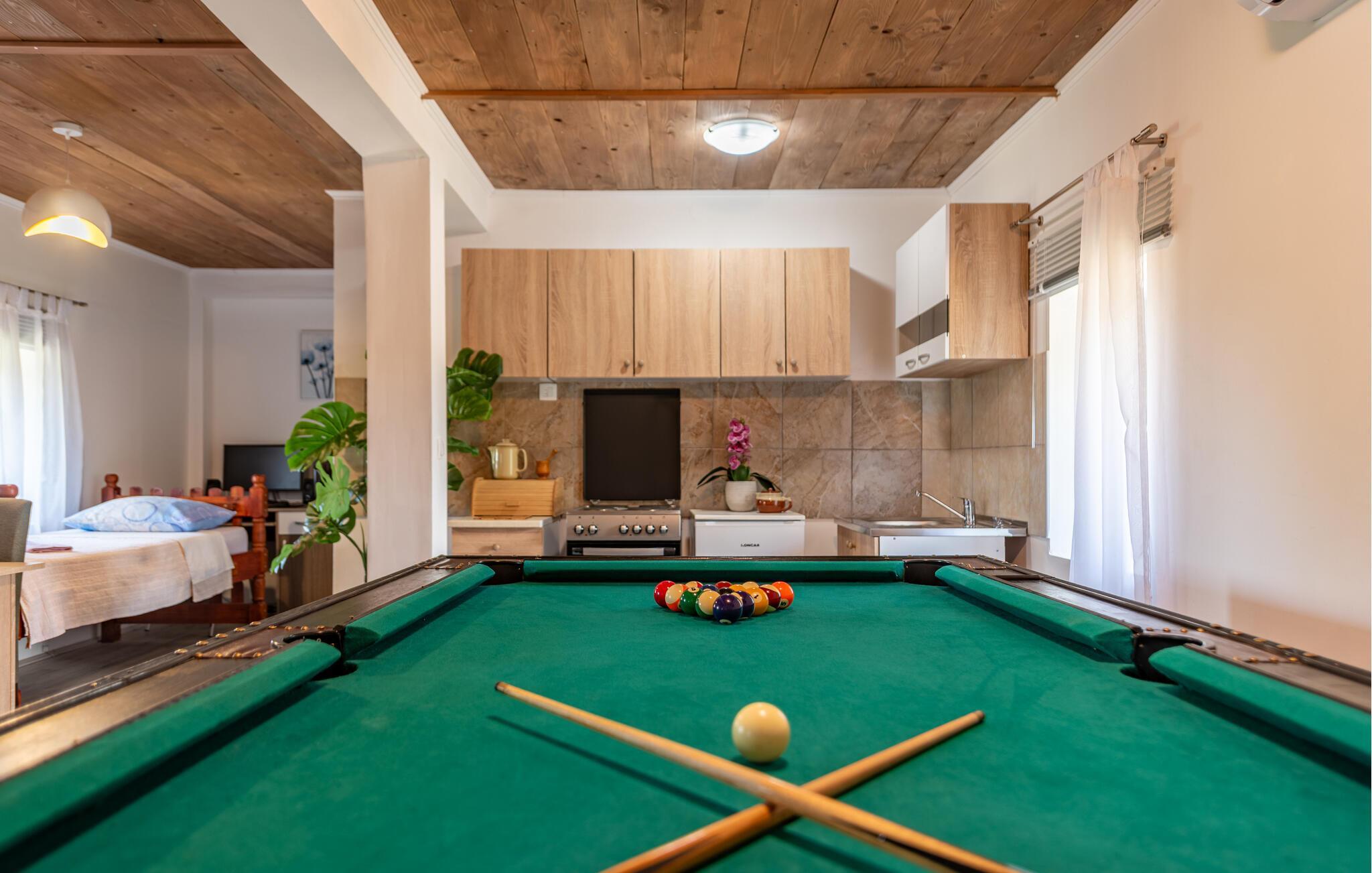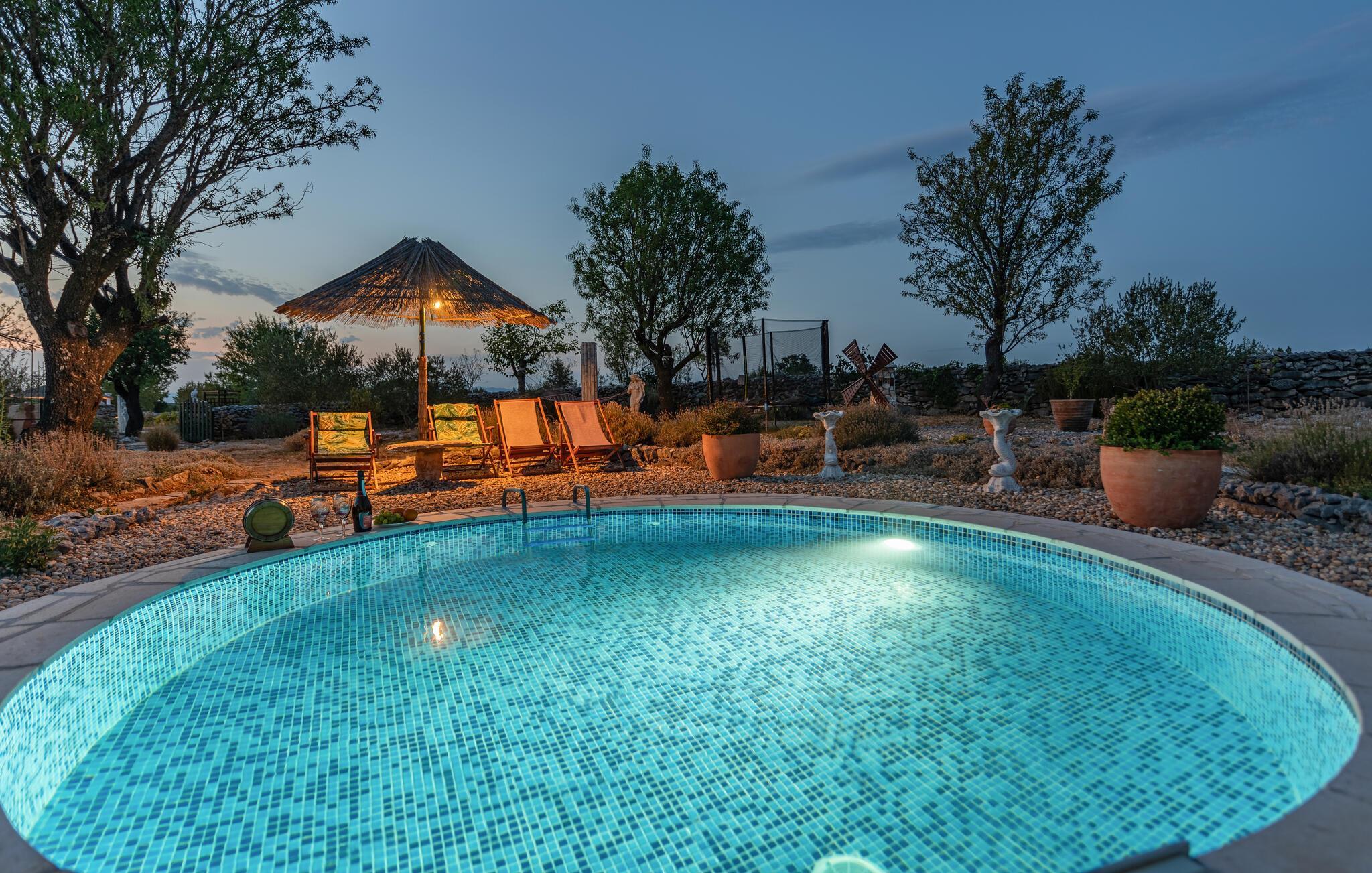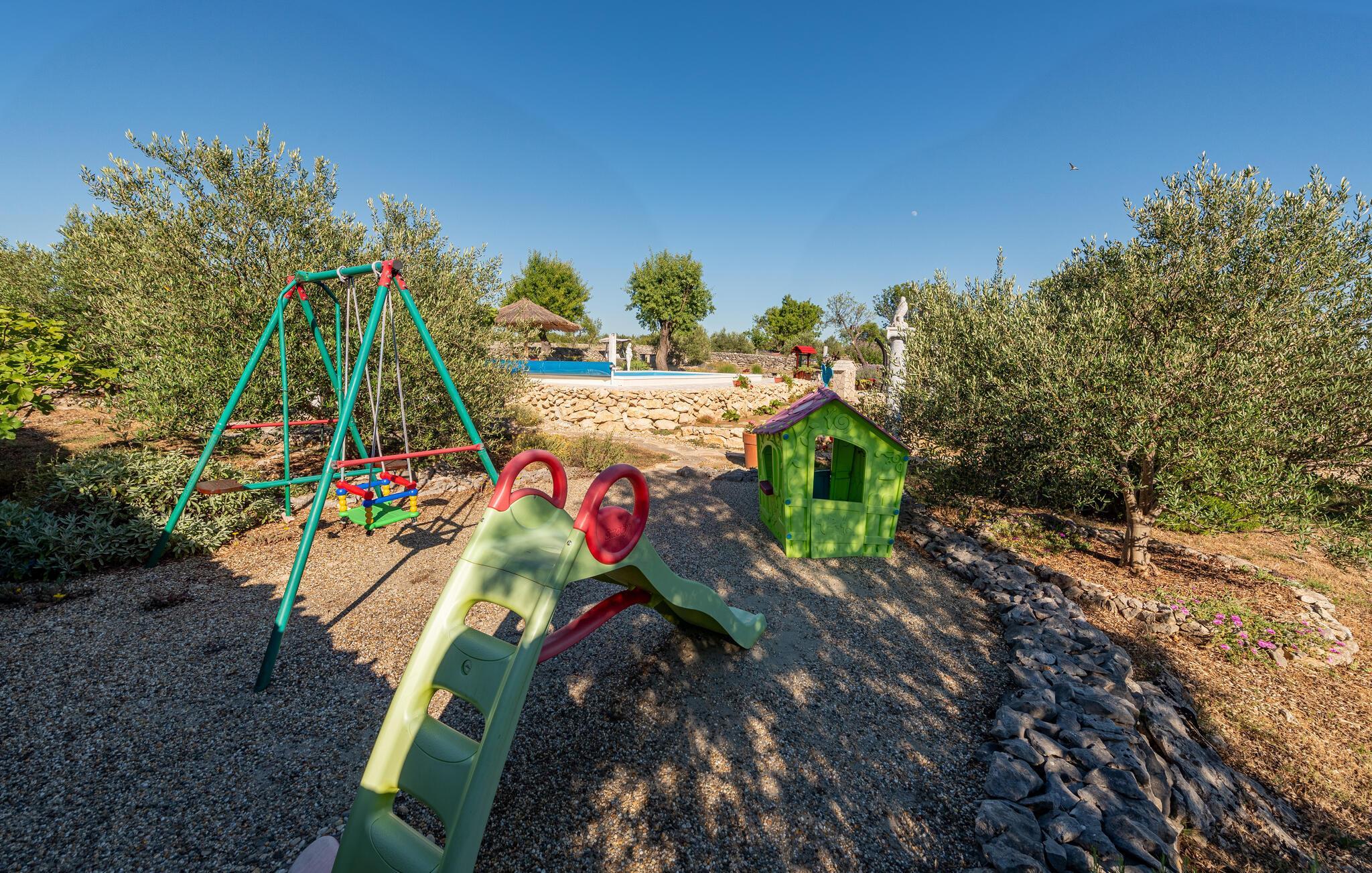 Huset består af to lejligheder, der er forbundet med en udvendig trappe, så det er velegnet til to familier. I husets stueetage ligger køkkenet og stuen, som indbyder til madlavning og hygge. Træd direkte ud på terrassen med en dampende kop kaffe om morgenen. Senere kan I slappe af på bagsiden af huset i den rummelige gårdsplads, hvor de to swimmingpools vil være et hit hos hele familien. Her er både en stor pool og en mindre, som er velegnet til børn. Ejeren bor på nabogrunden, som I også er velkomne til at bruge, hvis I f.eks. vil bruge bocciabanen.