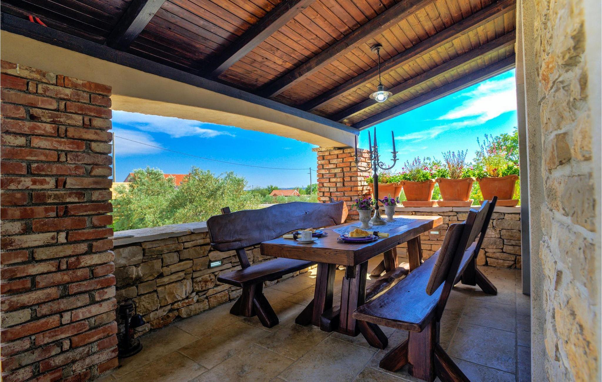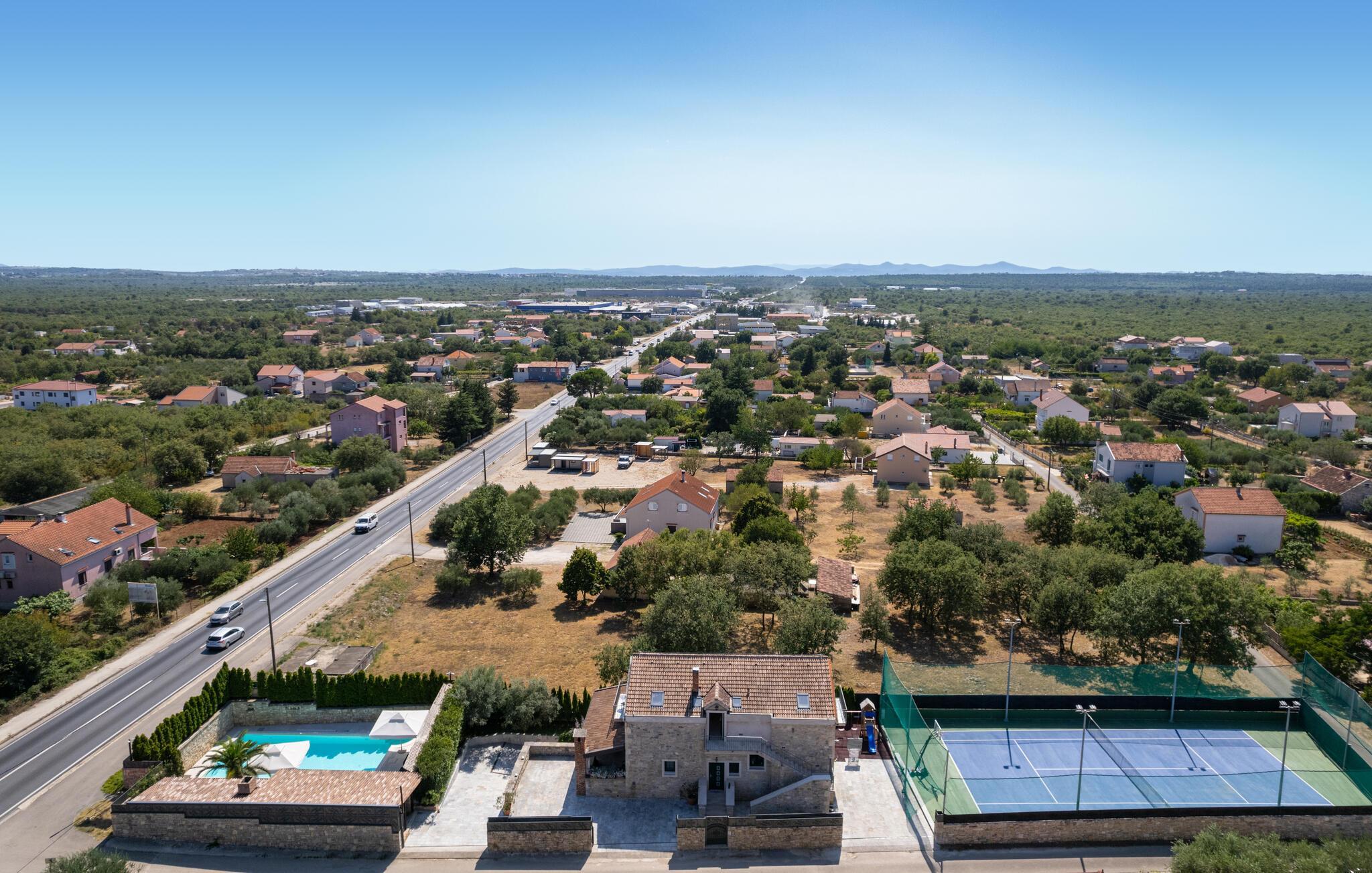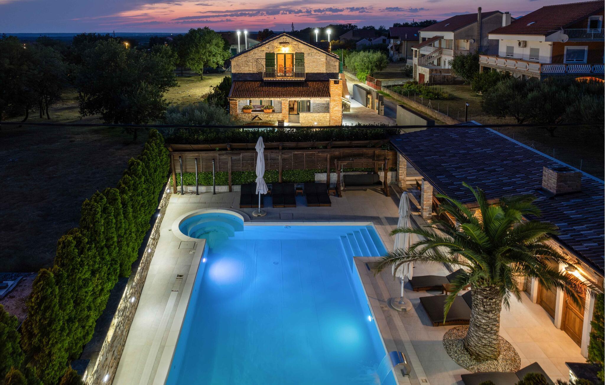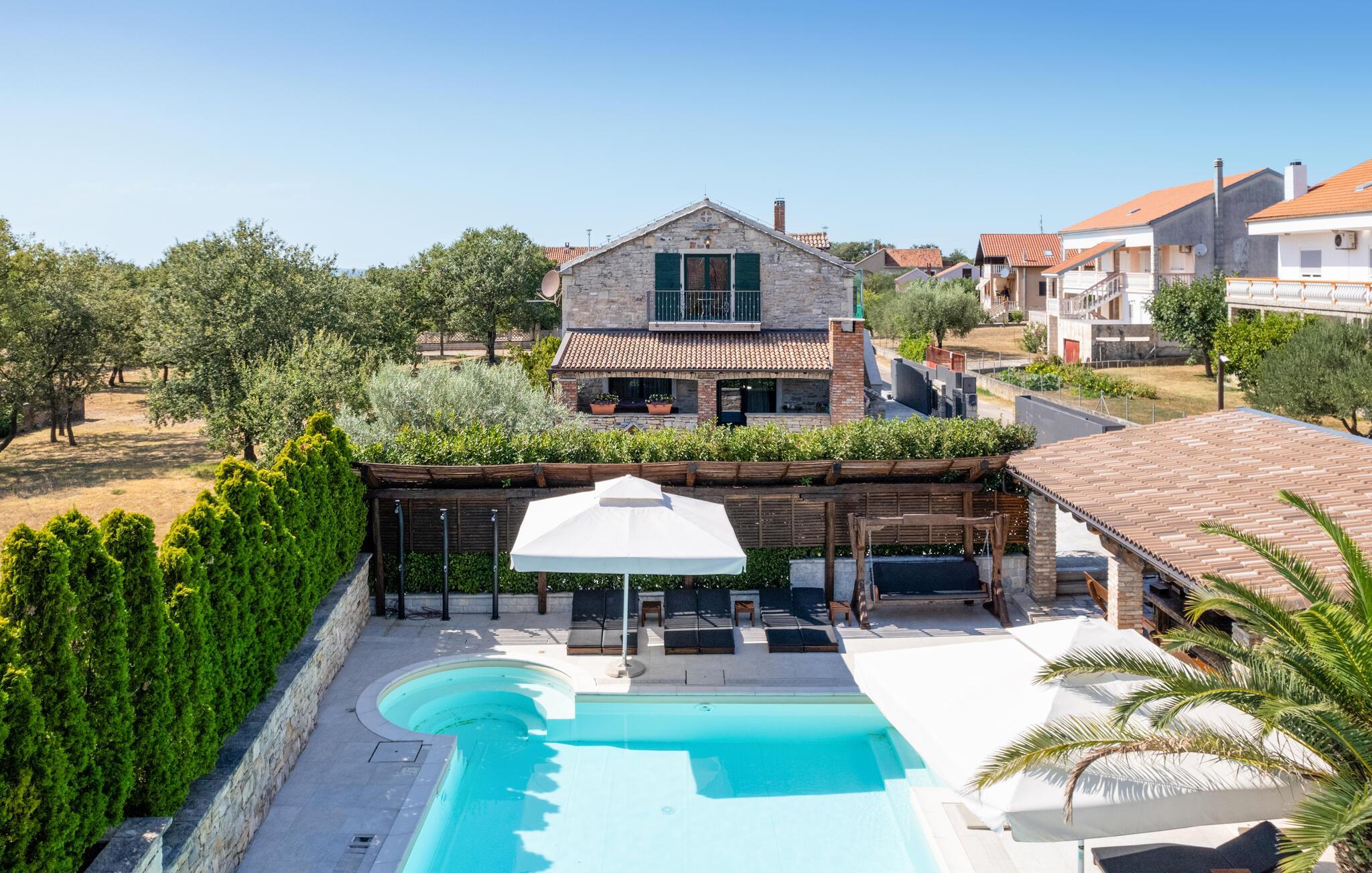 Villa Culina er en smuk villa, som er perfekt til store grupper: Villaen kan rumme op til 14 personer i tre lejligheder. Placeringen af ??villaen er perfekt for dem, der ønsker at udforske byen Zadar. Byen Zadar ligger kun en kort køretur fra villaen. Der er en smuk, stor pool udenfor, hvor I kan forfriske jer eller svømme. Det indendørs område byder på nok sjov, så ingen keder sig - fuldt udstyret fitnesscenter, hvor I kan forbrænde kalorier med lækre Konoba-specialiteter. I Konoba er der en brændeovn til rådighed, som er ideel til hjemmebagt brød, men også til den lækre Peka eller tilberedning af forskellige kødretter. Villaen har i alt tre lejligheder. En treværelses lejlighed ligger i stueetagen. Yderligere to lejligheder er på første sal - den ene har to soveværelser og den anden lejlighed har et soveværelse. Villaen har Wi-Fi, har aircondition og byder på alt til en perfekt ferie med familien.