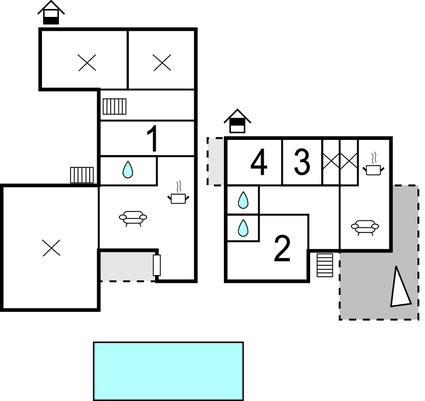 Opholdsstuen i stueetagen består af et soveværelse, badeværelse og stue med køkken, mens der ovenpå er tre soveværelser, to badeværelser og en stue med køkken og spiseplads.