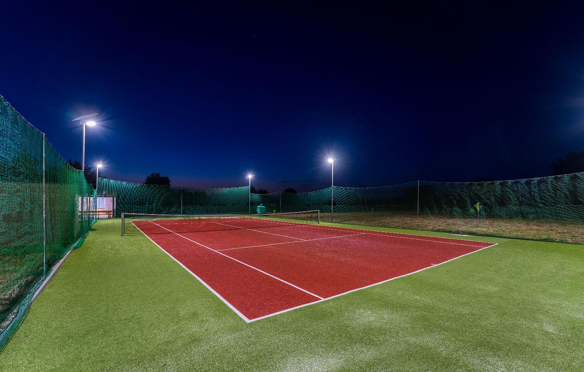 Nyd fred og privatliv i et moderne feriekompleks med tennisbane og pool.