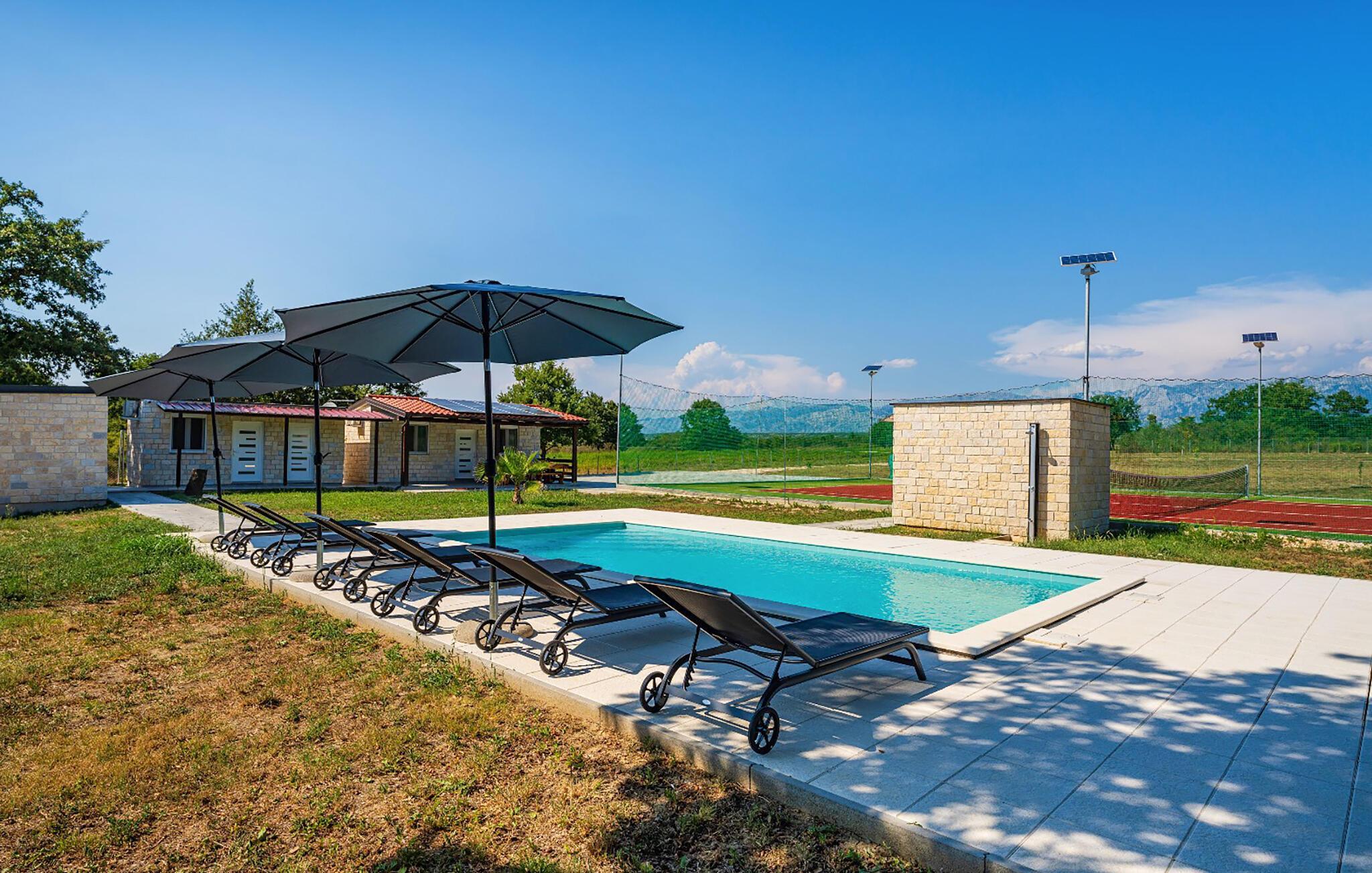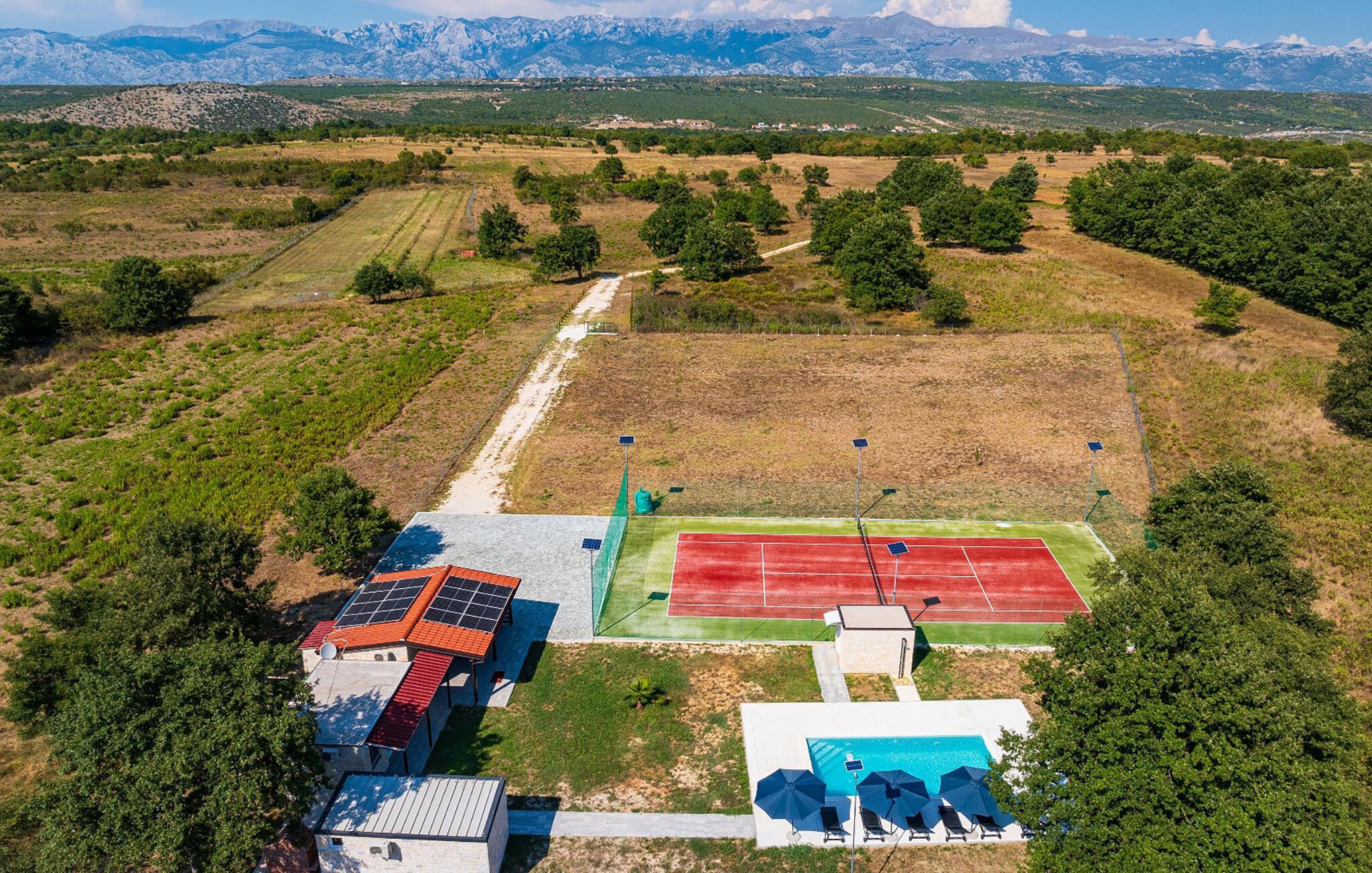 Dette individuelle feriehus i Posedarje består af tre separate bygninger og tilbyder jer derfor perfekt overnatning til familier eller par, der rejser sammen, men som også sætter pris på retreater. Det attraktivt møblerede interiør tilbyder jer alt hvad I behøver for et afslappende ophold. Højdepunkter er den rummelige pool og den moderne oplyste tennisbane, som er ideelle til både sportsaktiviteter og afslappende timer.