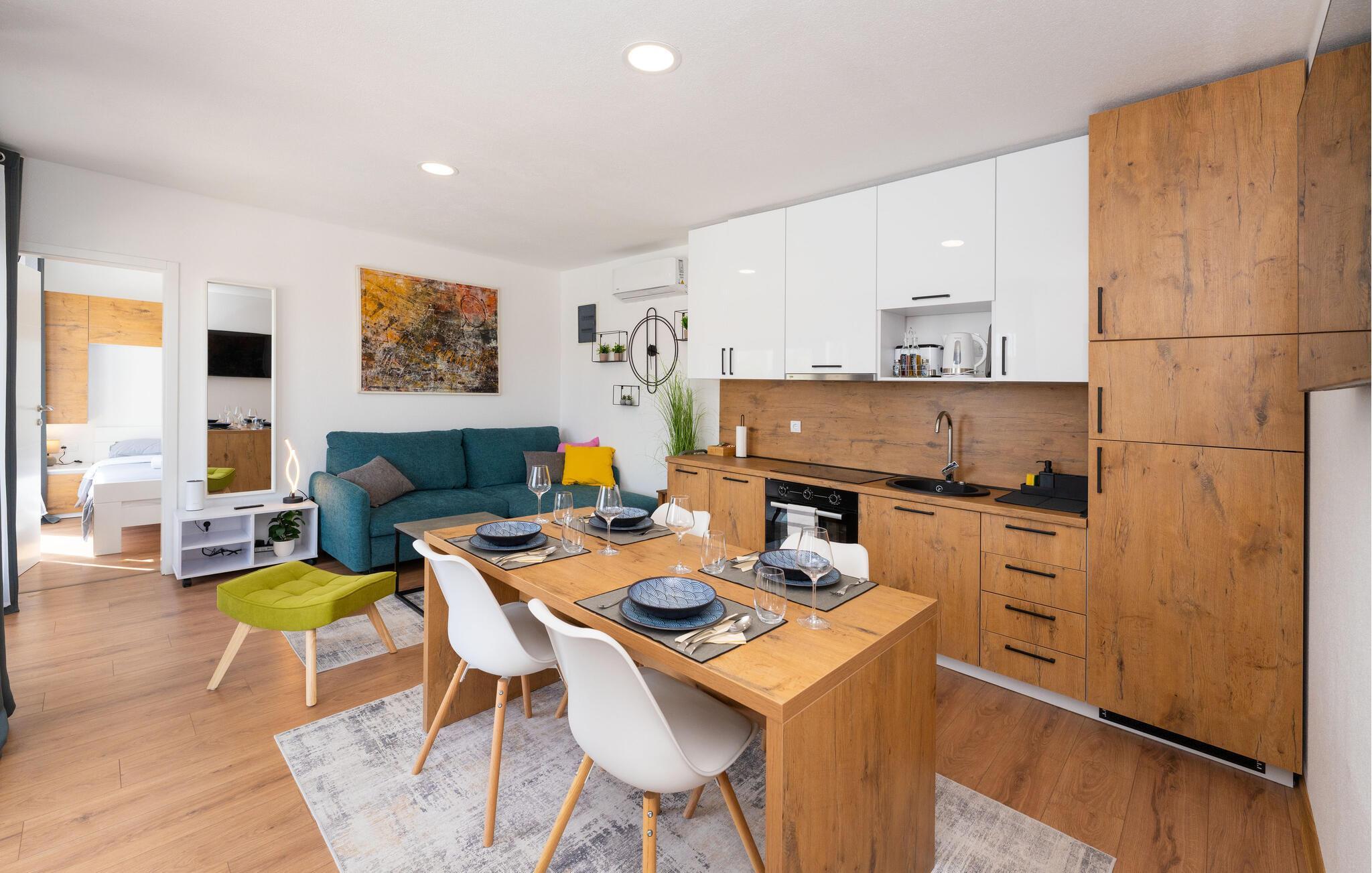 Kun en kort gåtur fra den smukke stenstrand kan I finde jer selv til rette i dette smagfuldt indrettede feriehus. Glæd jer til hyggelige madlavningsaftener i det åbne køkken, spis jeres måltider ved det indbydende spisebord, og om aftenen kan I streame en god serie eller slappe af med en bog i den hyggelige stue.