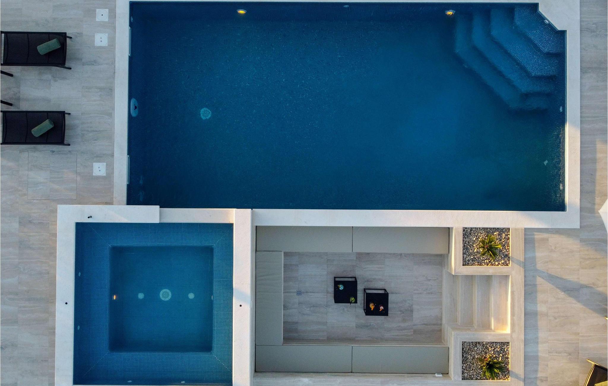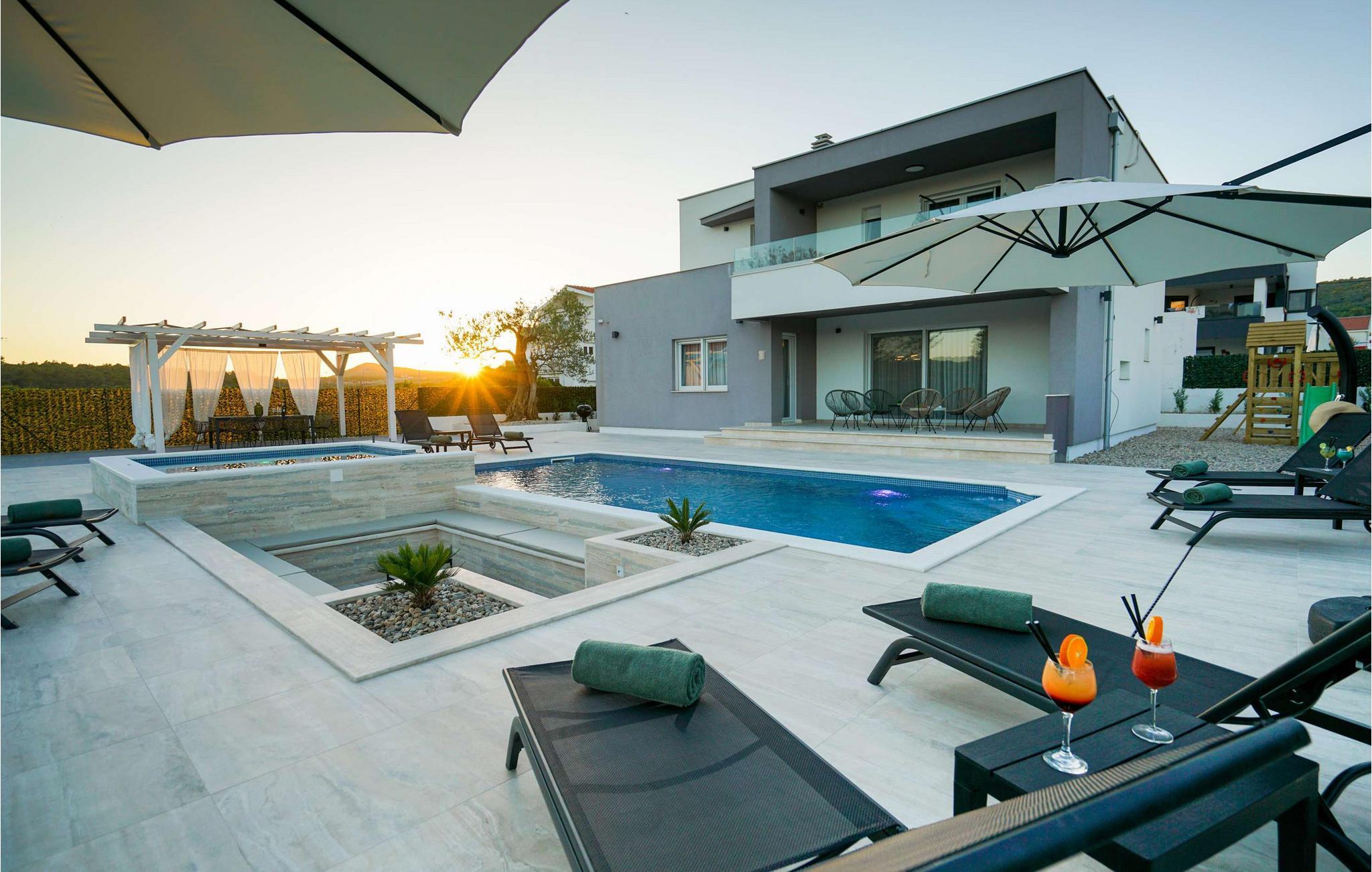 Slap af i hængestolene på terrassen og lad blikket vandre over haven. Tilbring hyggelige timer under den overdækkede pergola og nyd den særlige atmosfære i dette moderne udendørsområde. Slap af ved den oplyste pool og nyd den varme aftenluft, mens I svømmer eller slapper af på solsengene. Udnyt de elegant forsænkede siddeområder med små borde til at nyde en drink og afslutte aftenen perfekt.