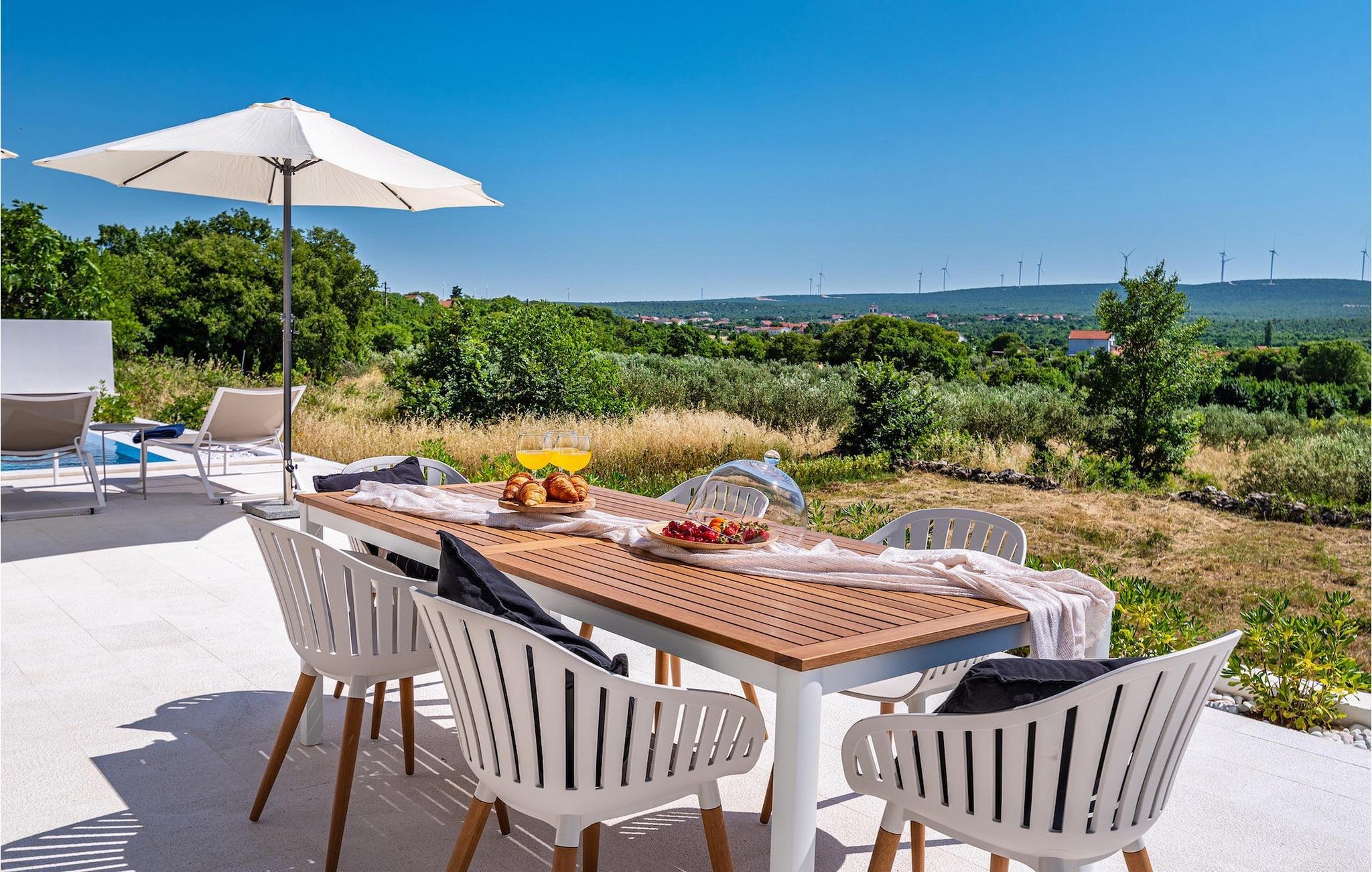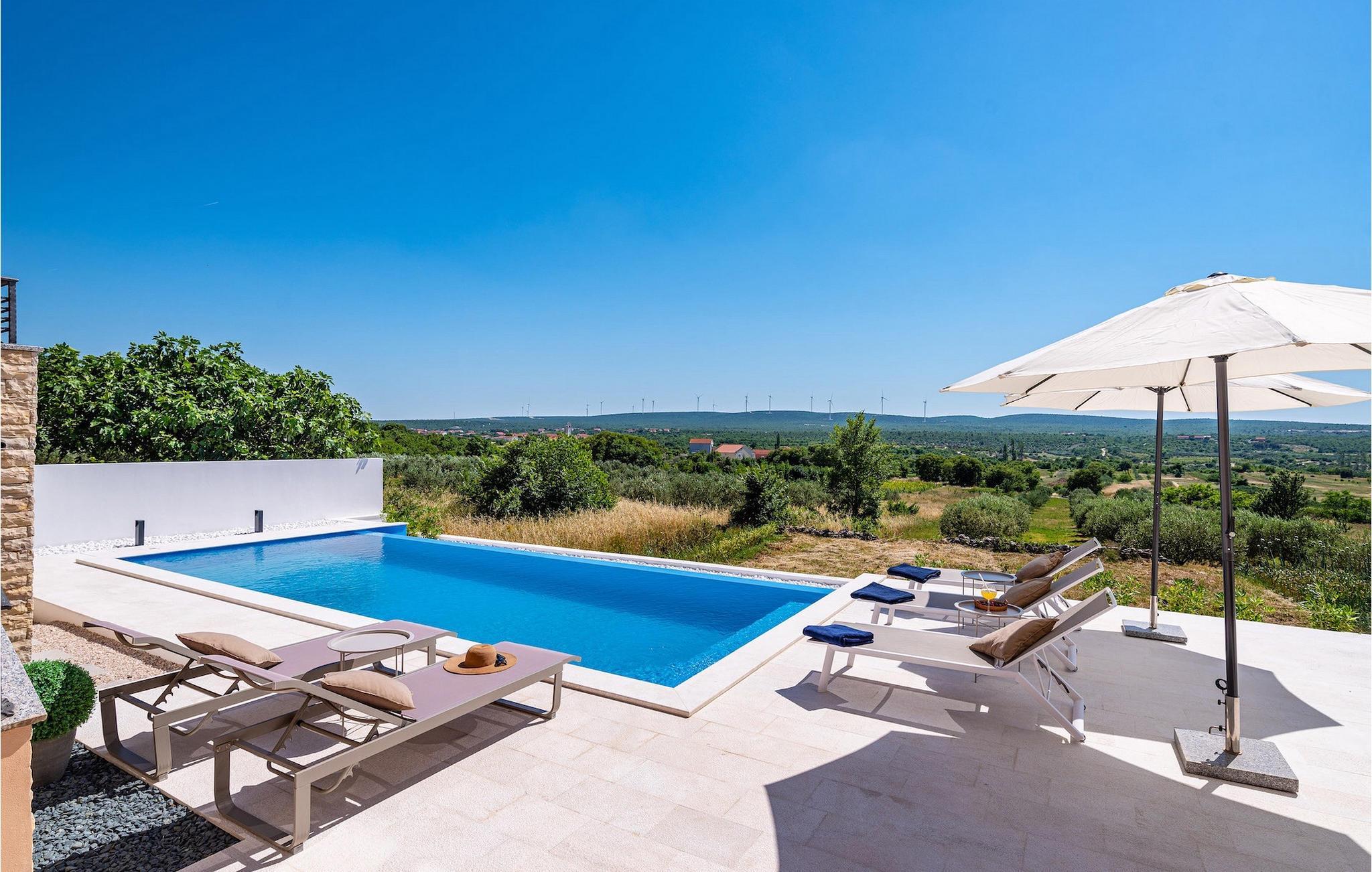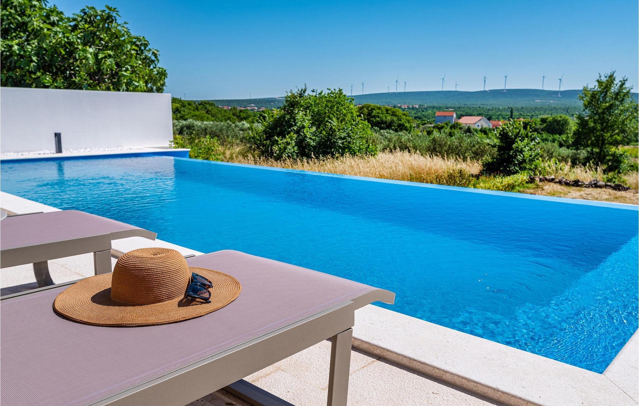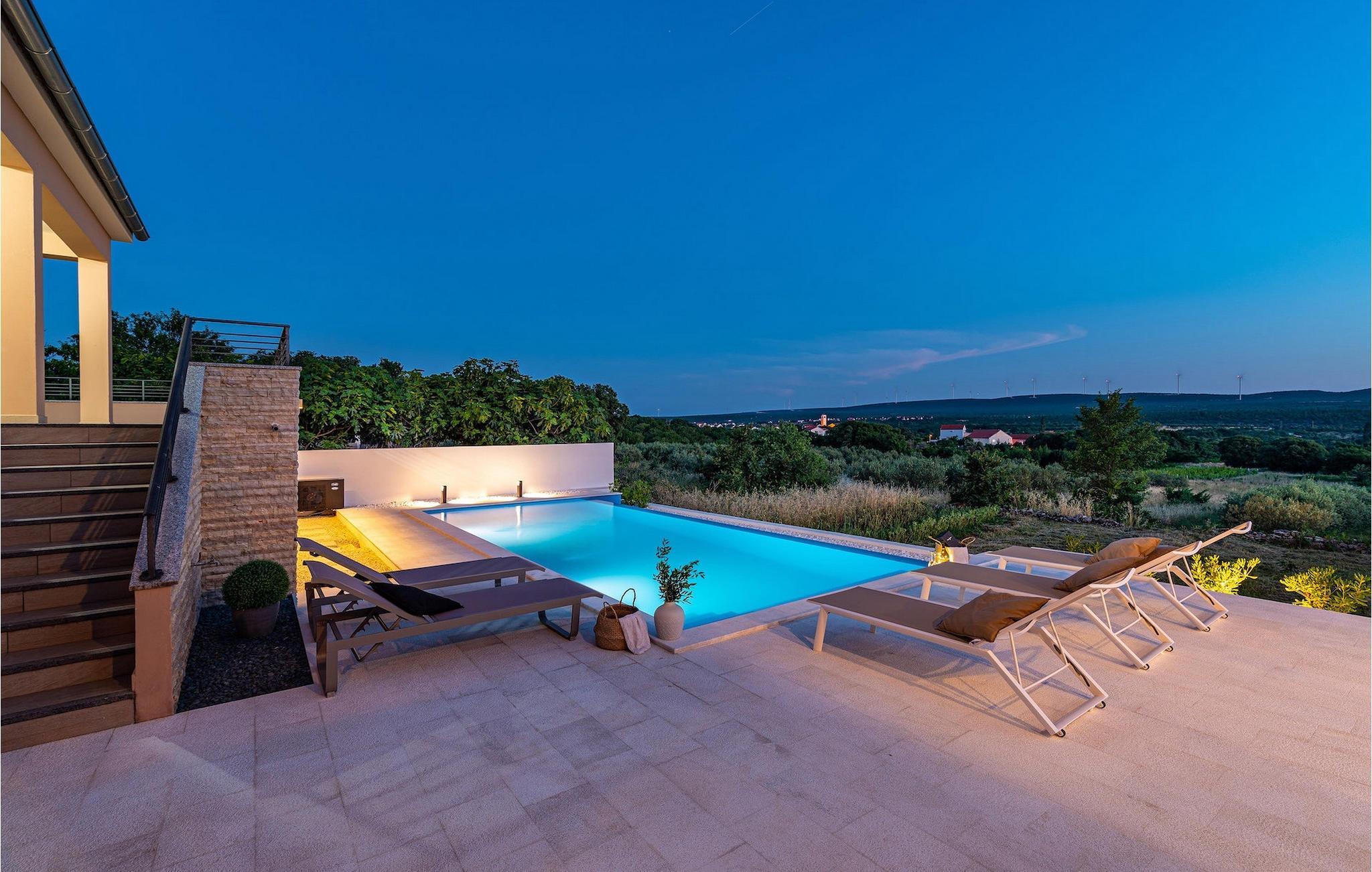 Når du ankommer til villaen, vil du først blive fortryllet af den fantastiske panoramaudsigt, før den forfriskende infinity-pool vil stjæle dit hjerte . Her vil du virkelig nyde den kroatiske sol! Komfortable liggestole er tilgængelige, så du kan slappe af i, og det veludstyrede sommerkøkken er ideelt til at afkøle forfriskende drinks eller tilberede lækre snacks på kulgrillen, mens børnene svømmer i poolen. Her findes også et separat badeværelse med toilet og bruser.