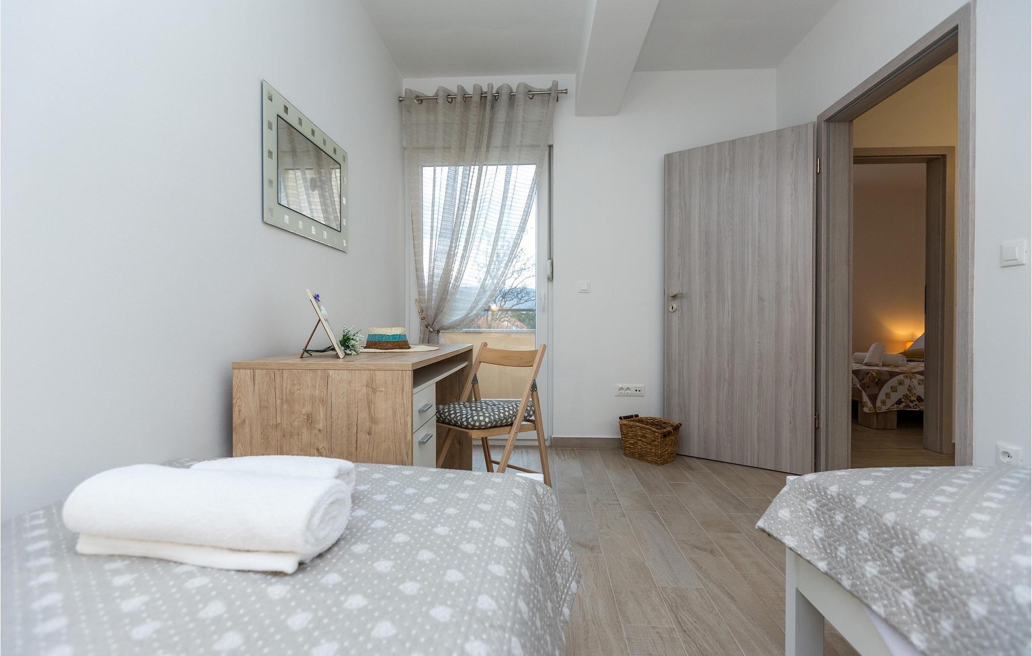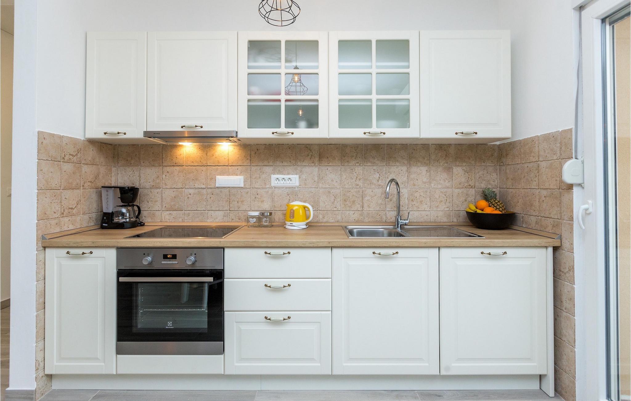 Eines der Apartments befindet sich im Erdgeschoss der Villa, wodurch die Villa für Familien mit Kindern geeignet ist. In dieser Wohnung gibt es ein Wohnzimmer, das eine heimelige Atmosphäre ausstrahlt, eine voll ausgestattete Küche, in der Sie gerne Ihre Köstlichkeiten zubereiten werden, sowie 2 Schlafzimmer, eins mit Doppelbett und eins mit zwei Einzelbetten, und ein gemeinsames Badezimmer.