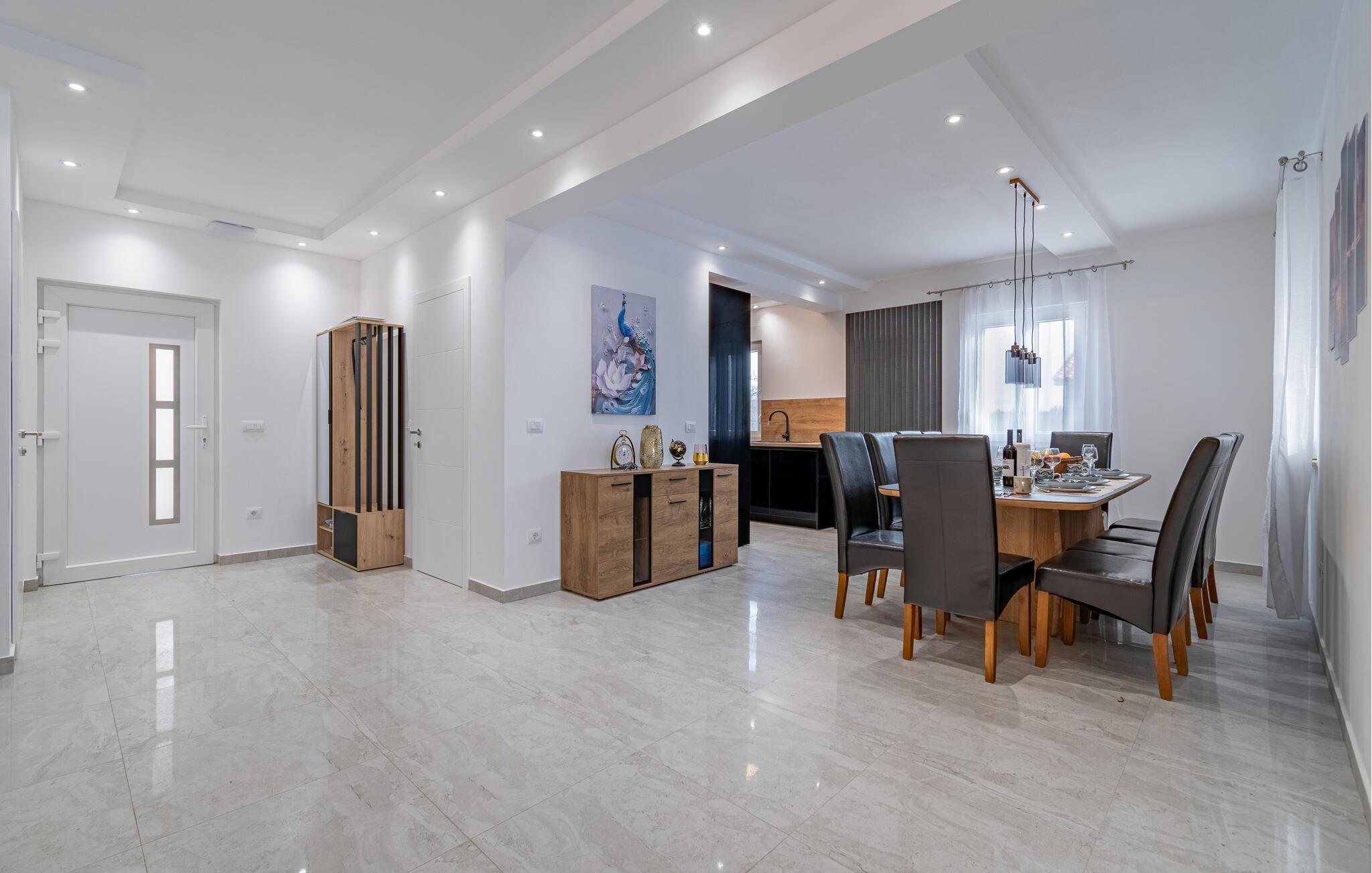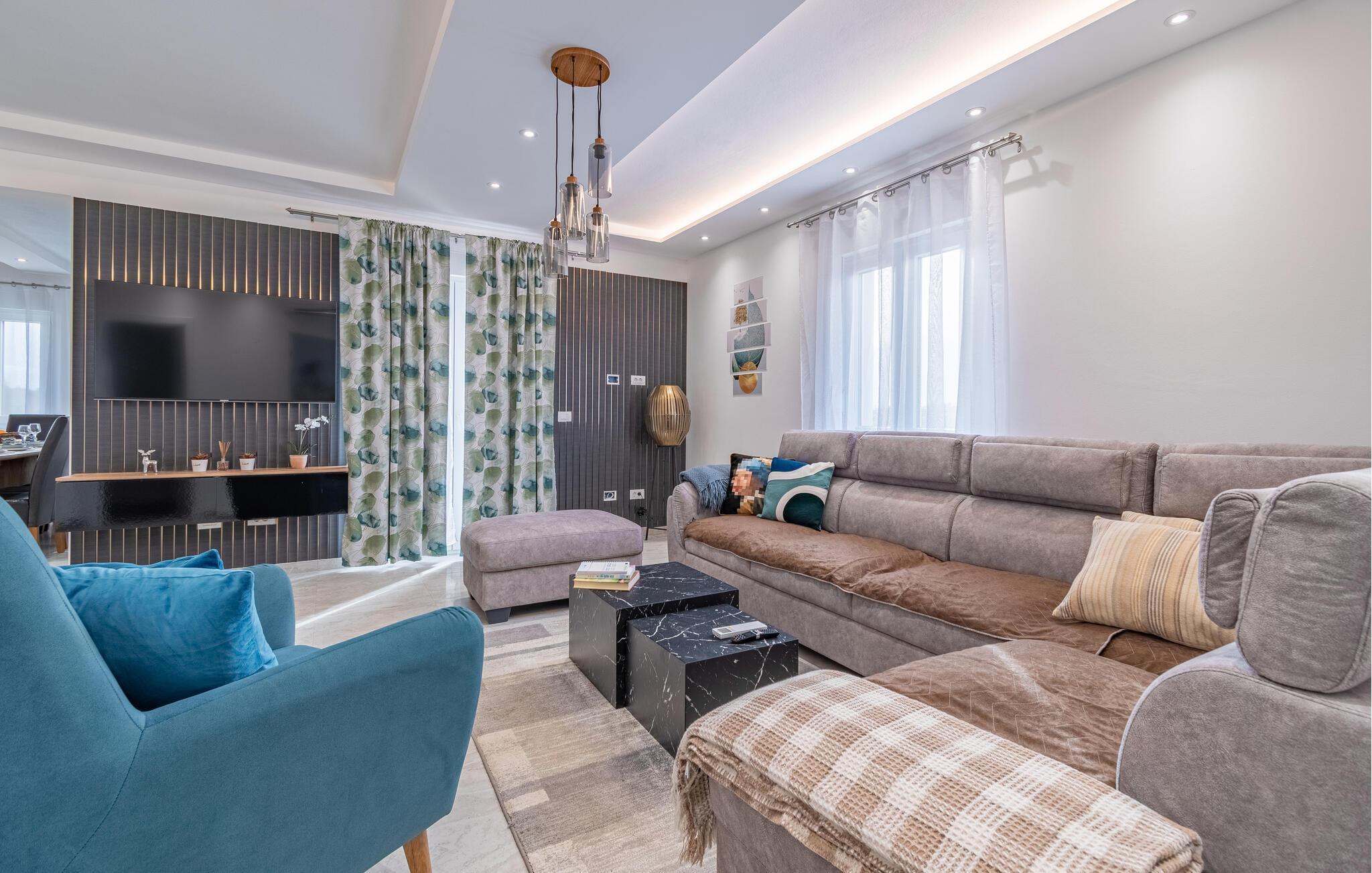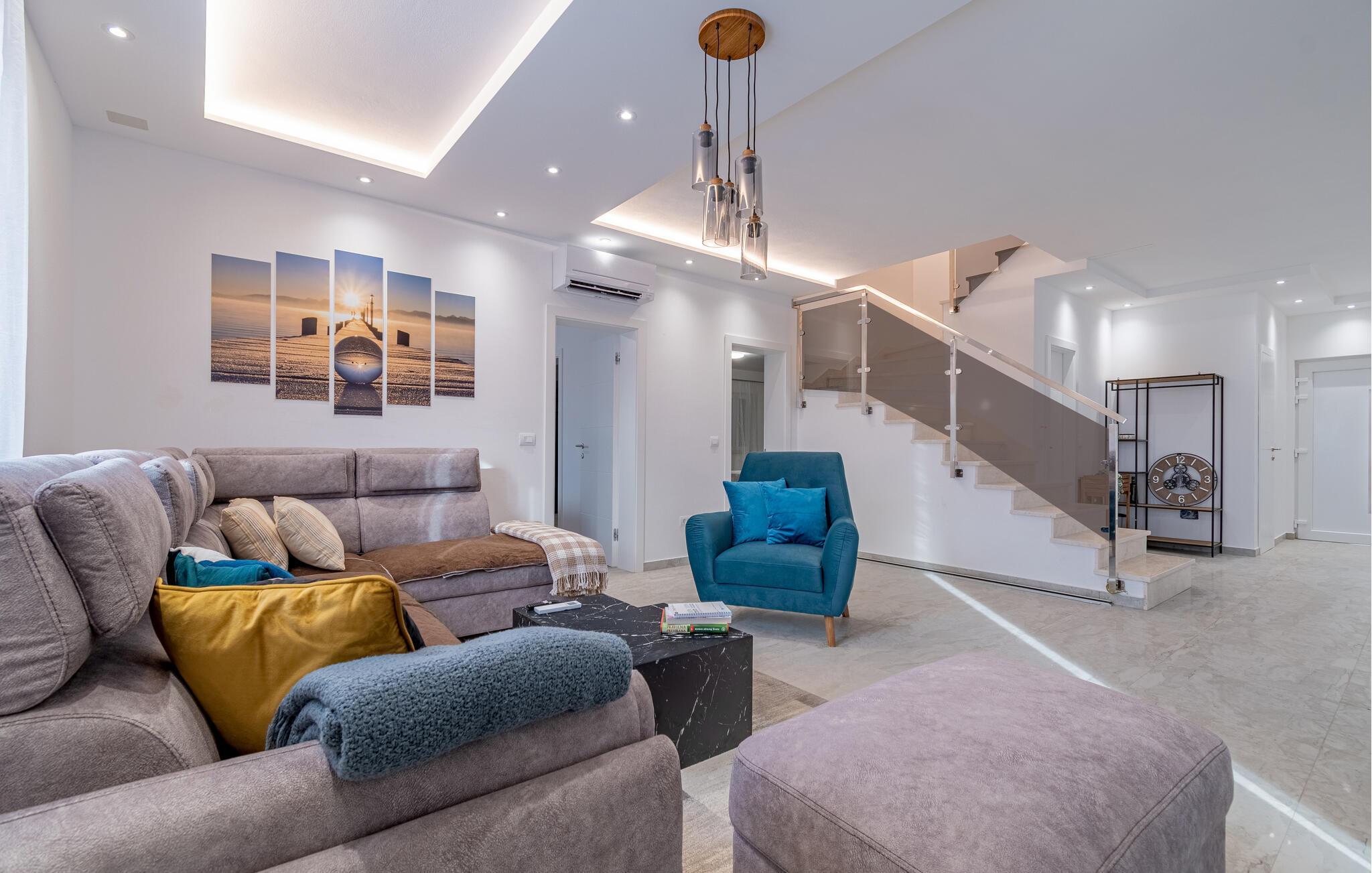 Dette herskabelige hjem med sine stilfulde møbler er perfekt til et fantastisk ophold. Interiøret, der er indrettet i pæne farver, udstråler varme og komfort. Slap helt af i den komfortable sofagruppe, nyd en eftermiddagslur, eller bladr i jeres ferielæsning. Tryl lækre måltider frem i det moderne køkken, inden I spiser med vennerne ved det store spisebord.