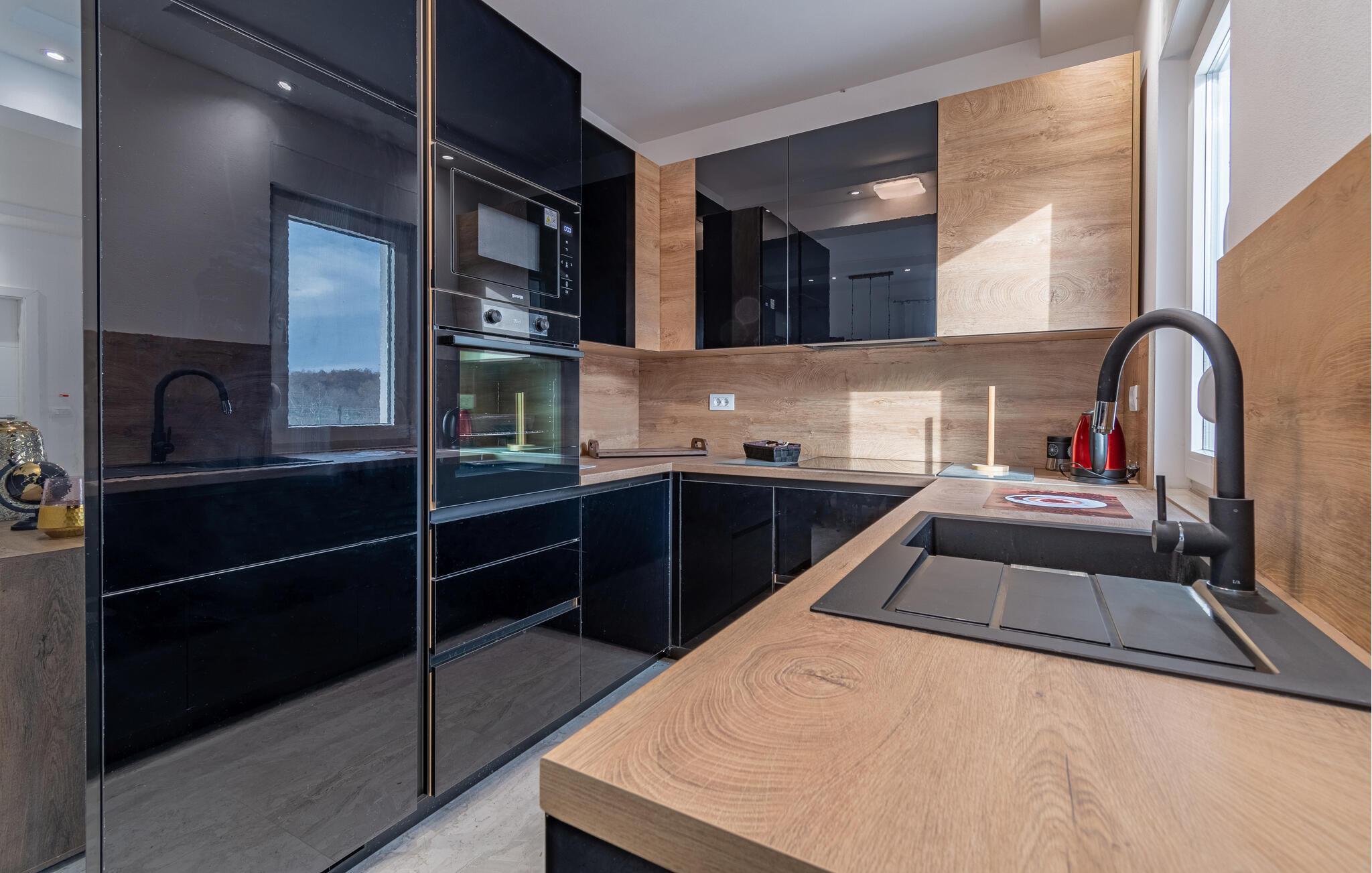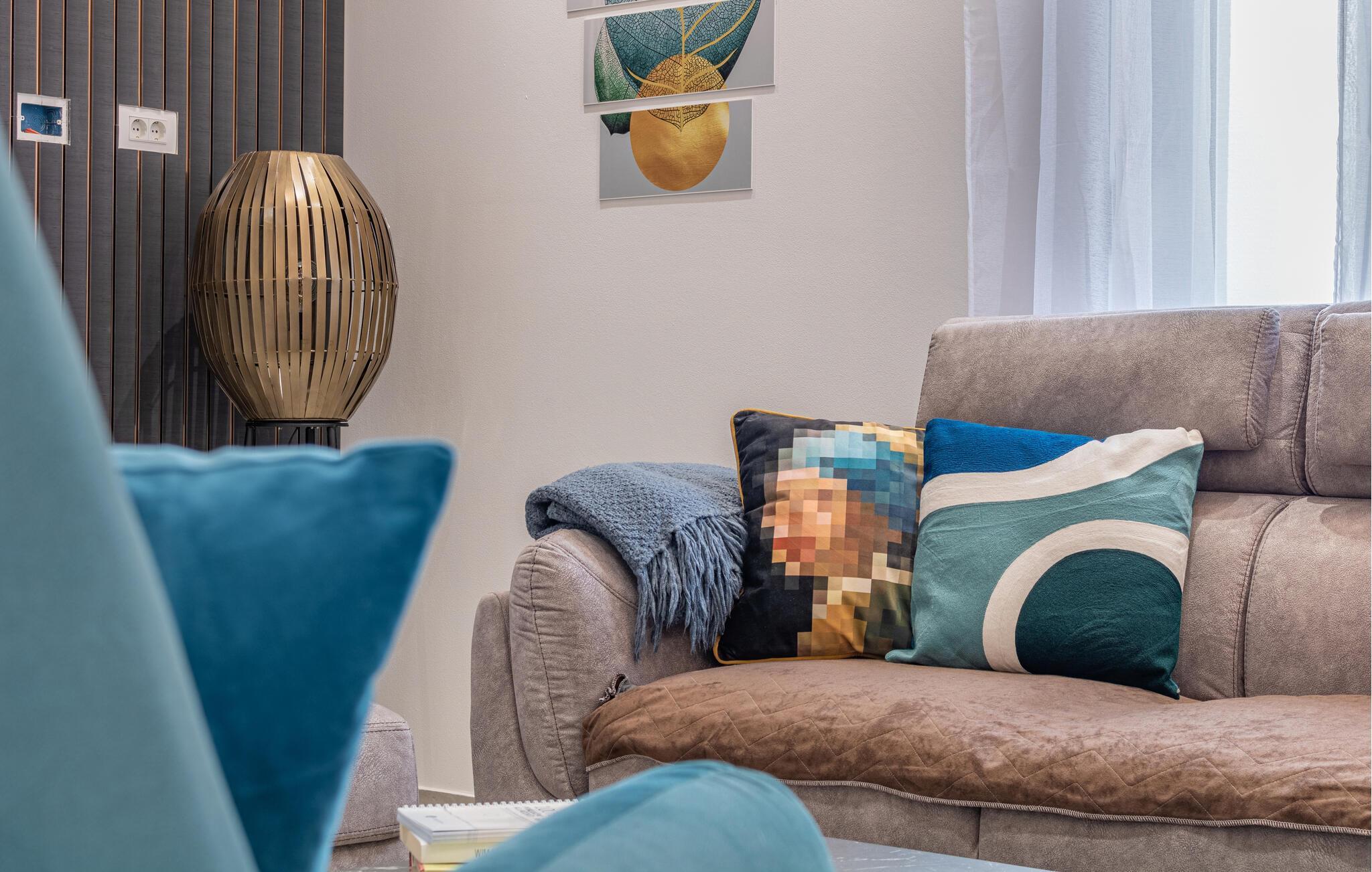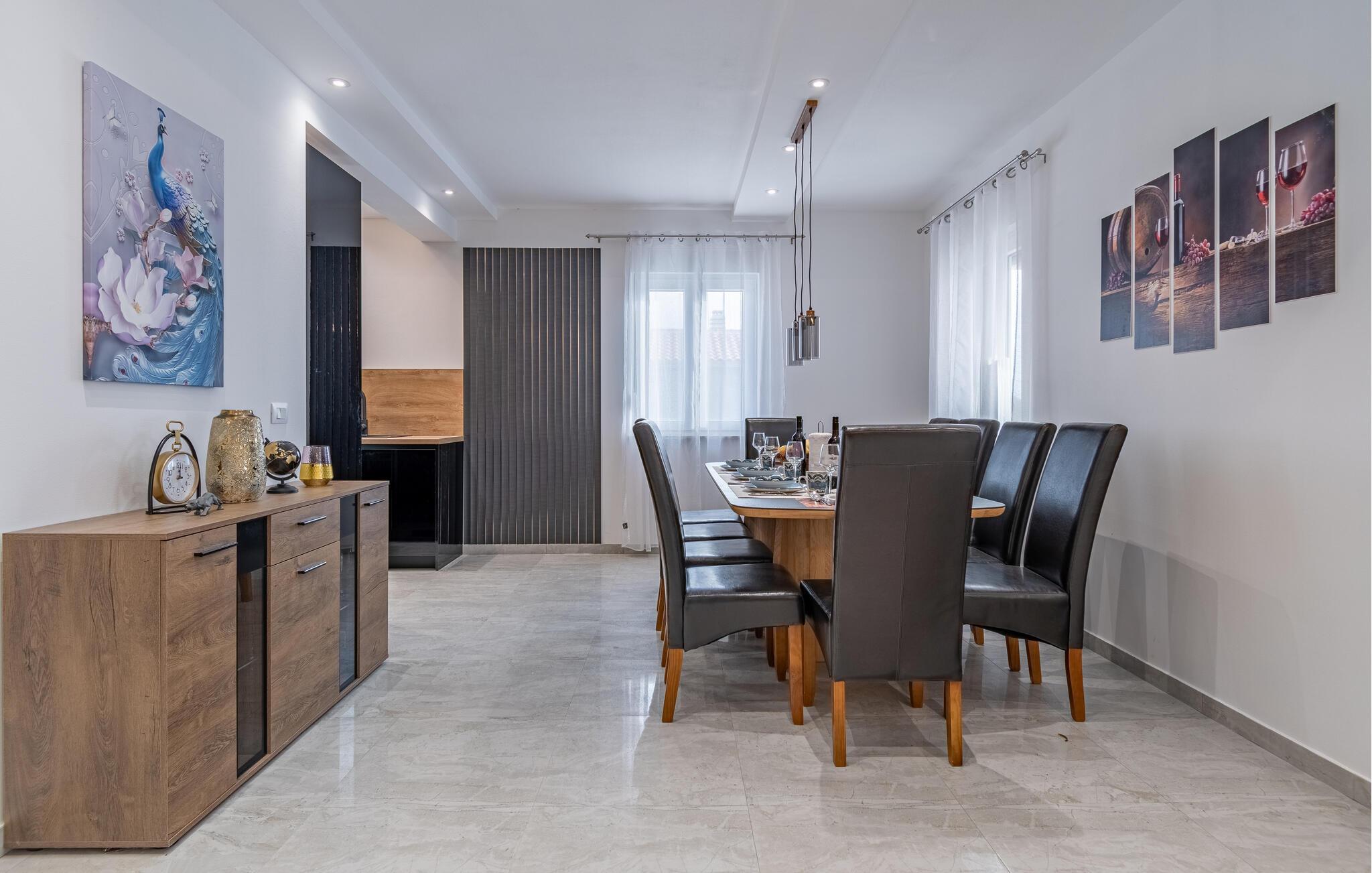 Dette herskabelige hjem med sine stilfulde møbler er perfekt til et fantastisk ophold. Interiøret, der er indrettet i pæne farver, udstråler varme og komfort. Slap helt af i den komfortable sofagruppe, nyd en eftermiddagslur, eller bladr i jeres ferielæsning. Tryl lækre måltider frem i det moderne køkken, inden I spiser med vennerne ved det store spisebord.