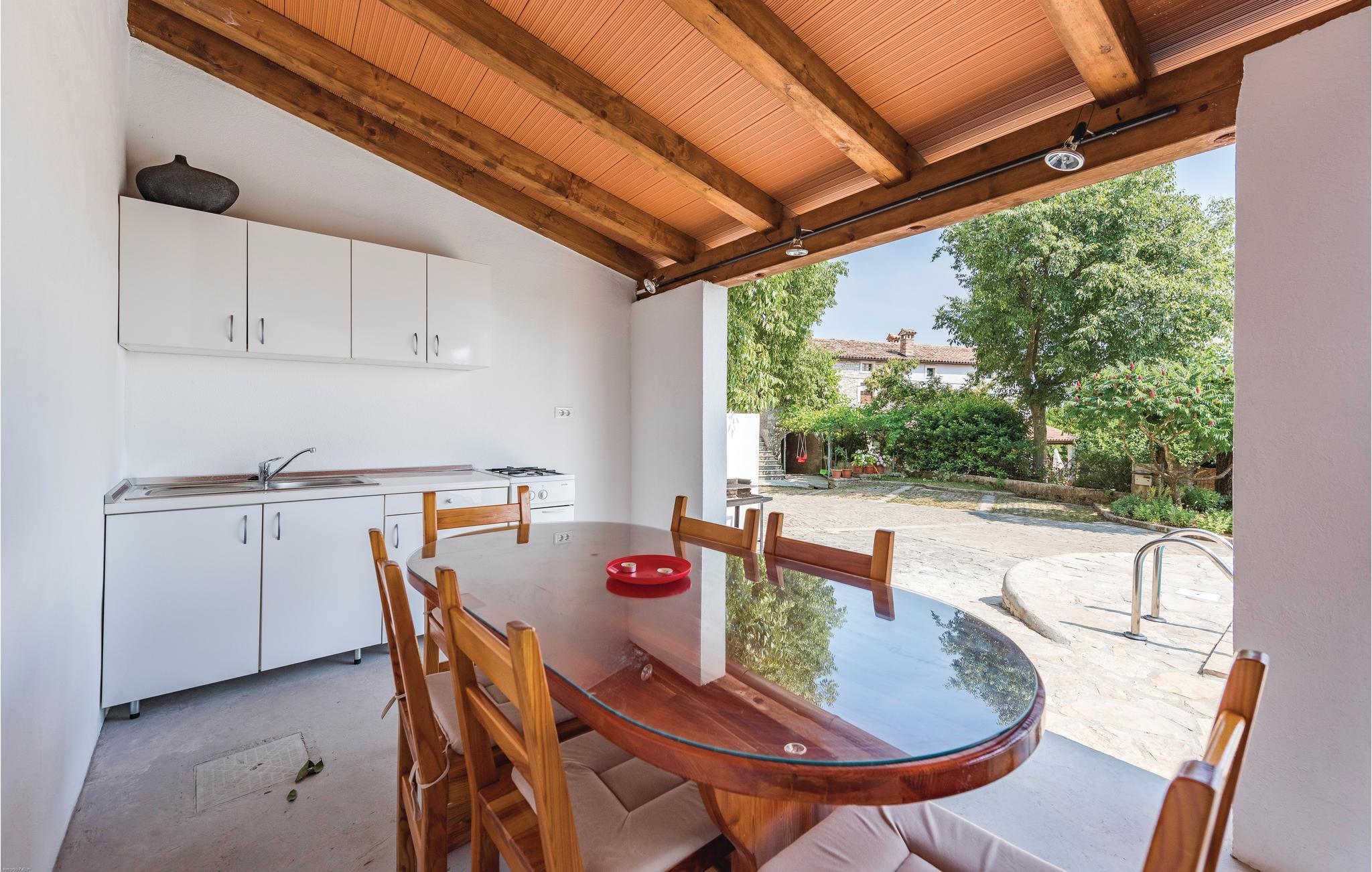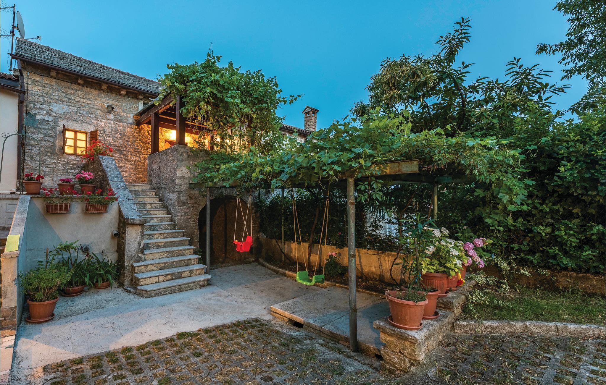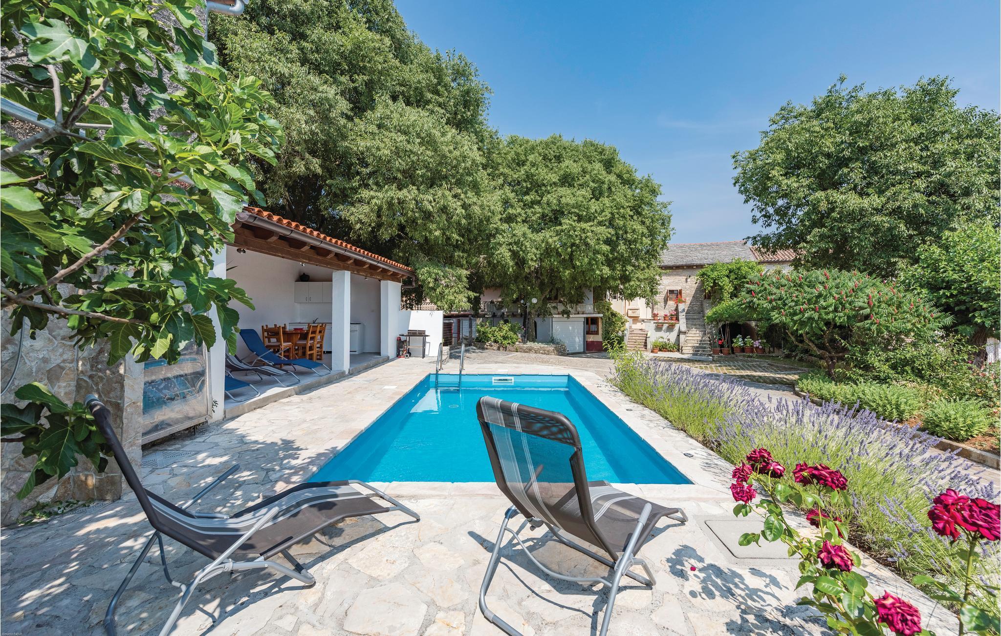 Det er det samme med dette dobbelthus ikke langt fra Zminj. Feriehuset ligger i centrum af landsbyen og har et typisk tag lavet af stenplader. Den lille udendørs pool og sommerkøkkenet giver dig en afslappet atmosfære og behagelig afkøling på varme sommerdage, hvor de badeglade kan få den ene time efter den anden til at gå med leg og plasken rundt i vandet.
