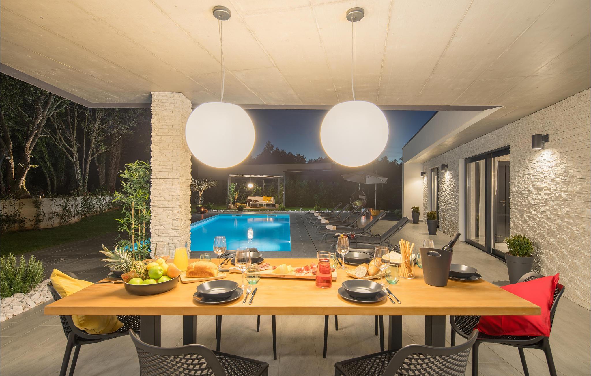 De store glasfacader lukker masser af lys ind og kan åbnes ud mod terrassen, hvorfra der er adgang til haven og jeres privat pool. Hop en tur i det rene, klare vand og køl af i varmen. Giv jer god tid til at lave mad i det udendørs køkken, mens I nyder luften og lydene under åben himmel. Som noget særligt kan I slappe af i den hyggelige lounge og nyde ferien 100 %. Der er også tænkt på børnene med legetøj og forskellige muligheder for at være aktive.