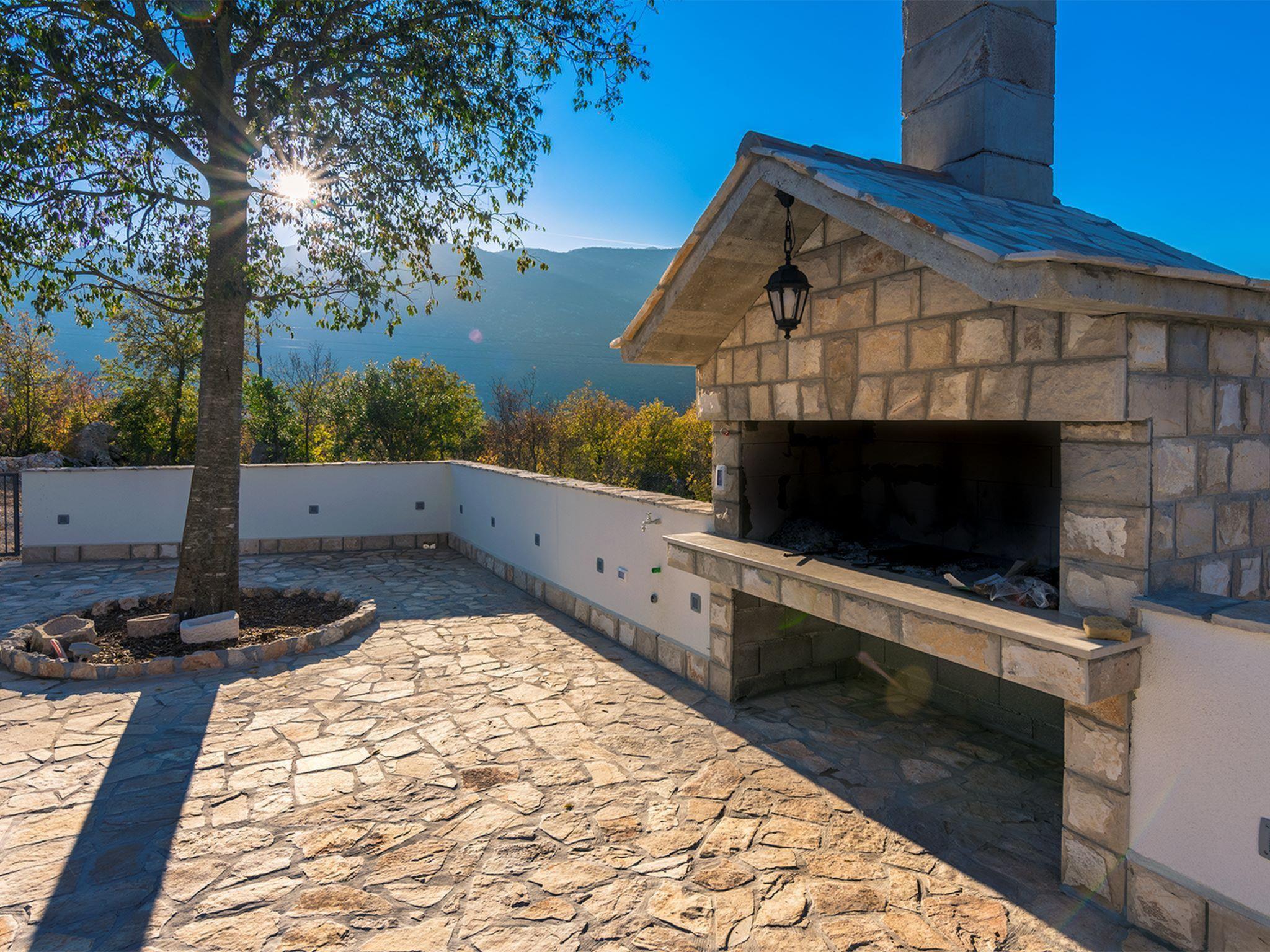 Outside, the villa boasts two private pools to suit everyone's needs: a shallow pool safe for children's play and a deeper one for invigorating swims. The private hot tub invites relaxing moments under the sky, while the panoramic views of the mountains and village provide a breathtaking backdrop. An outdoor dining and barbecue area, complete with a garden patio, table, and chairs, ensures memorable al fresco meals among loved ones.