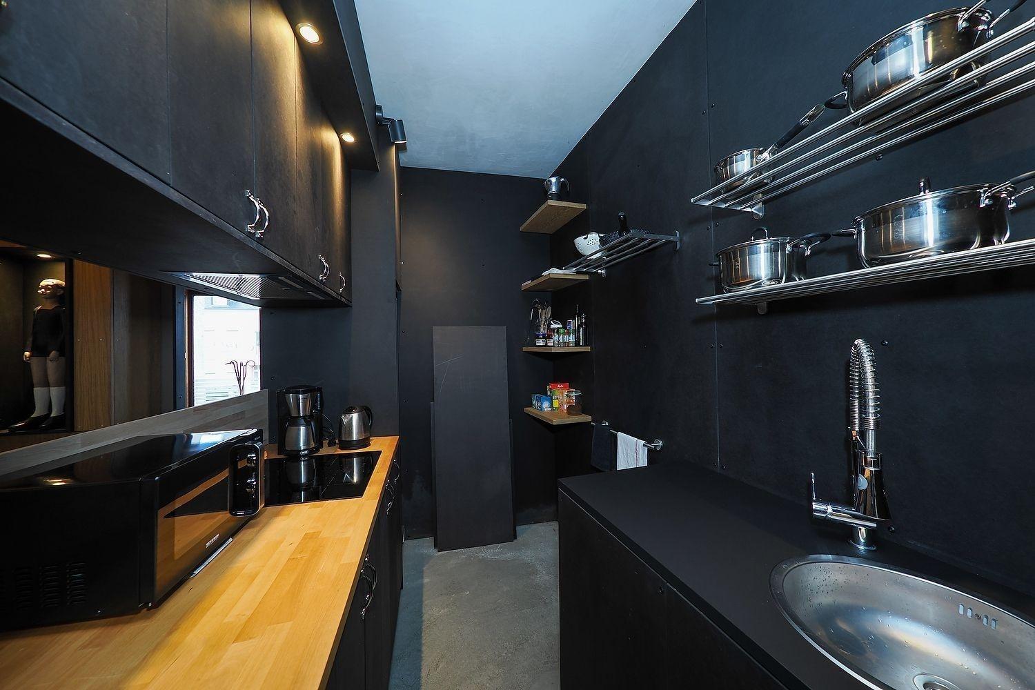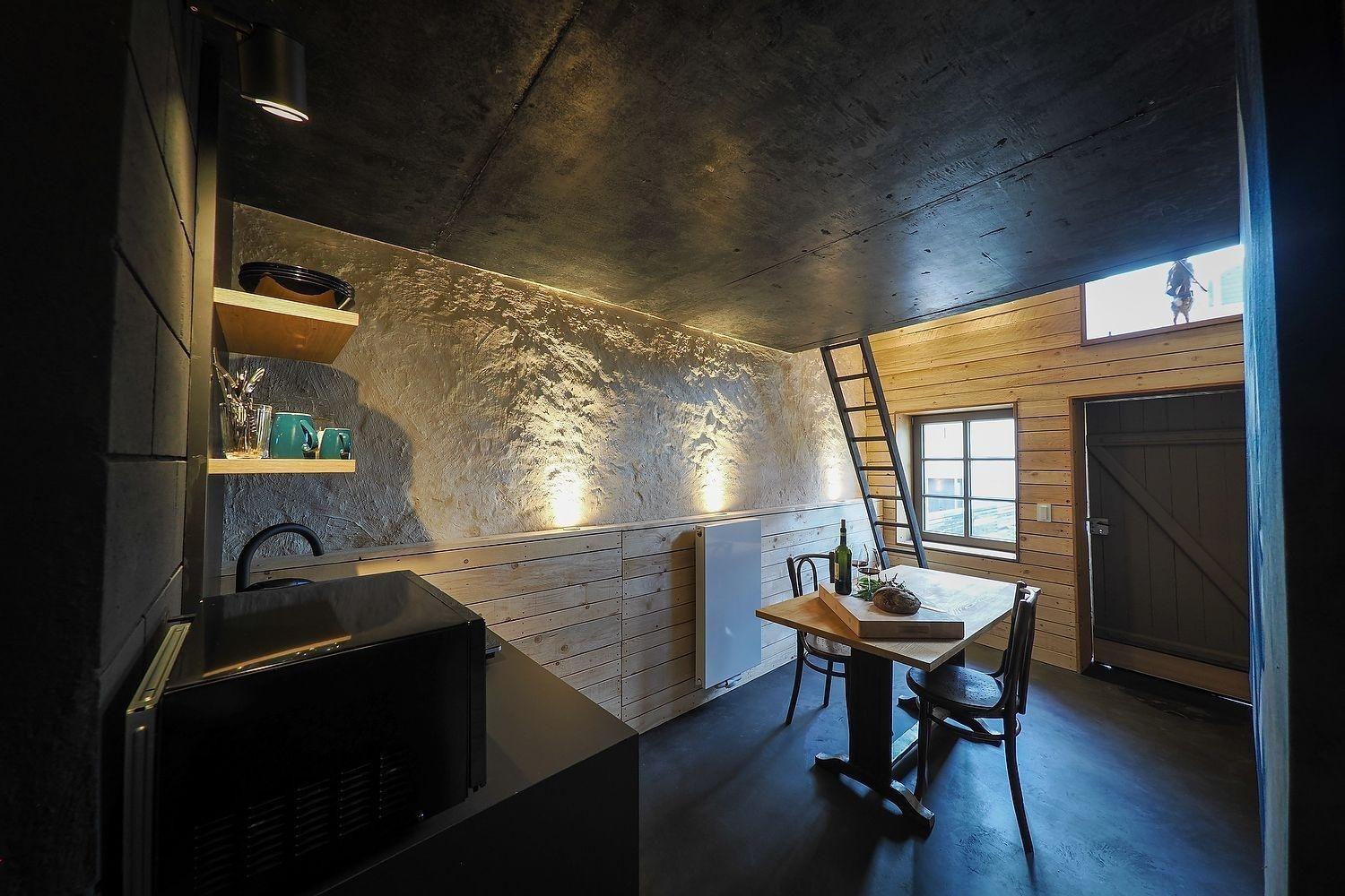 Nach dem privaten Eingang entdecken Sie im Erdgeschoss den Wohnbereich mit Kochnische und der angrenzenden ... sagen wir mal 'Badhöhle'.