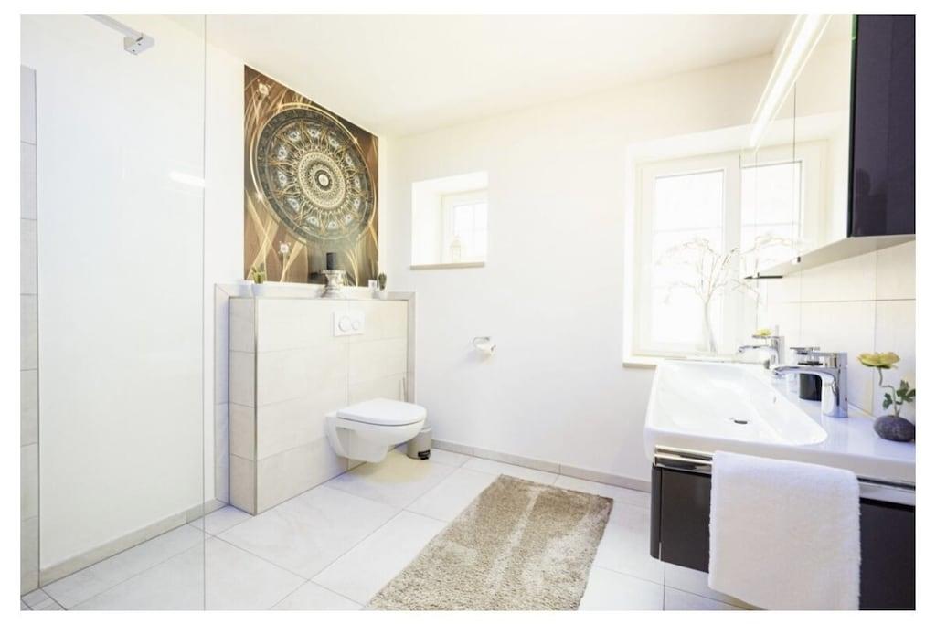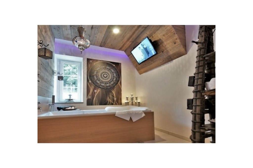 På 2. etage: (Stue(, , bibliotek, Fjernsyn, pejs, varme, insektnet), spisestue(spisebord, varme), Køkken(, , kogeplade, elkedel, brødrister, kaffemaskine, ovn, opvaskemaskine , køleskab, fryser, varme), soveværelse(, , dobbeltseng, Fjernsyn, varme), badeværelse(, badekar, bruser, bruser, håndvask, varme, føntørrer, insektnet), badeværelse(, badekar, bruser, bruser, håndvask, varme, føntørrer, insektnet), badeværelse(Fjernsyn, hottub, varme, insektnet), badeværelse(Fjernsyn, hottub, varme, insektnet)) , , carport, Førstehjælp, balkon(balkon, insektnet), parkering