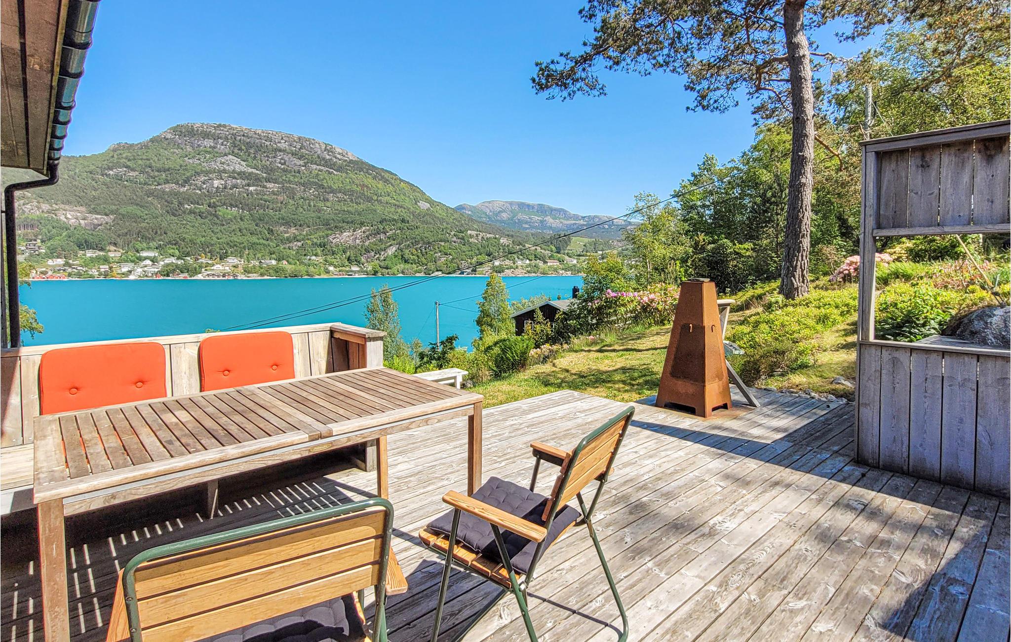Tilbring en uforglemmelig ferie ved fjorden i dette komfortable feriehus. Dette indbydende feriehus venter på dig med en fantastisk beliggenhed, det er det helt rigtige sted for en afslappende pause, hvor du kan nyde aktiviteter i naturen. De lyse værelser med træpaneler inviterer dig til at slappe af. Nyd en vidunderlig panoramaudsigt over fjorden, mens du spiser sammen, gør dig godt tilpas ved pejsen om aftenen og lyt til flammernes hyggelige knitren. Lad dig fortrylle af den vidunderlige udsigt fra terrassen. Når man soler sig over fjorden, kommer ferieafslapning næsten automatisk. Hop i det klare vand fra din egen lille badebro på varme dage. Der er også fremragende fiskeri i fjorden. Tag en båd ud på vandet eller vandre gennem de smukke naturomgivelser. Du er kun i kort afstand fra udgangspunktet for den spektakulære Preikestolen, Preikestolens golfbane og den lille by Jørpeland med alle faciliteter. Oplev Lysefjorden på et fjordkrydstogt, Flørlitrappene, Kjeragbolten og ture på nationale turistruter. Stavanger og forlystelsesparken Kongeparken er ideelle til dagsture. Glæd dig til en afvekslende ferie i dette feriehus!
