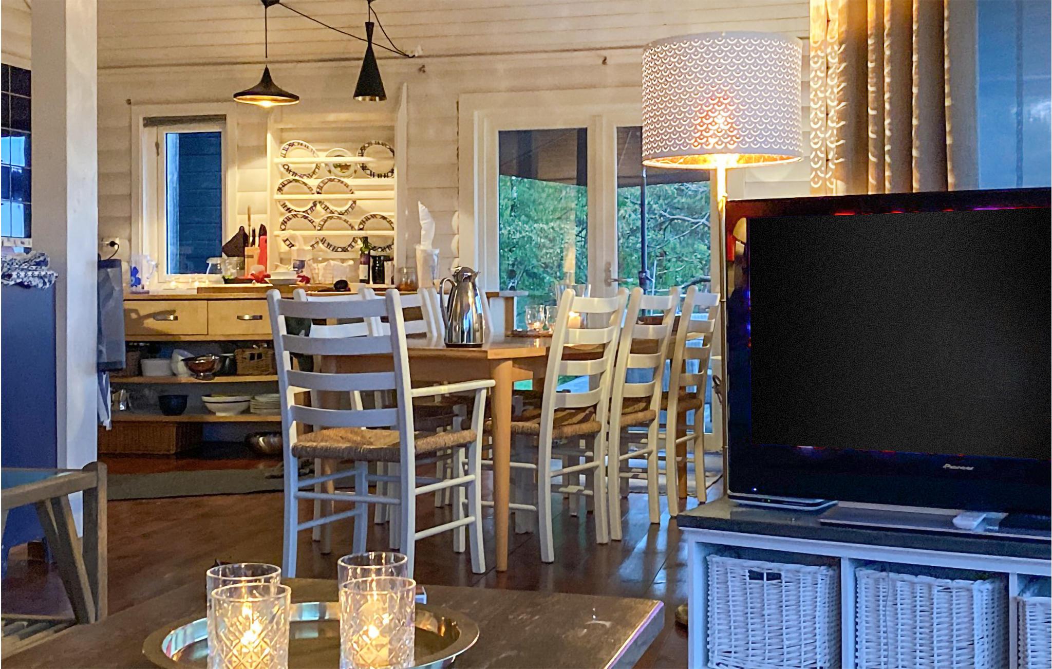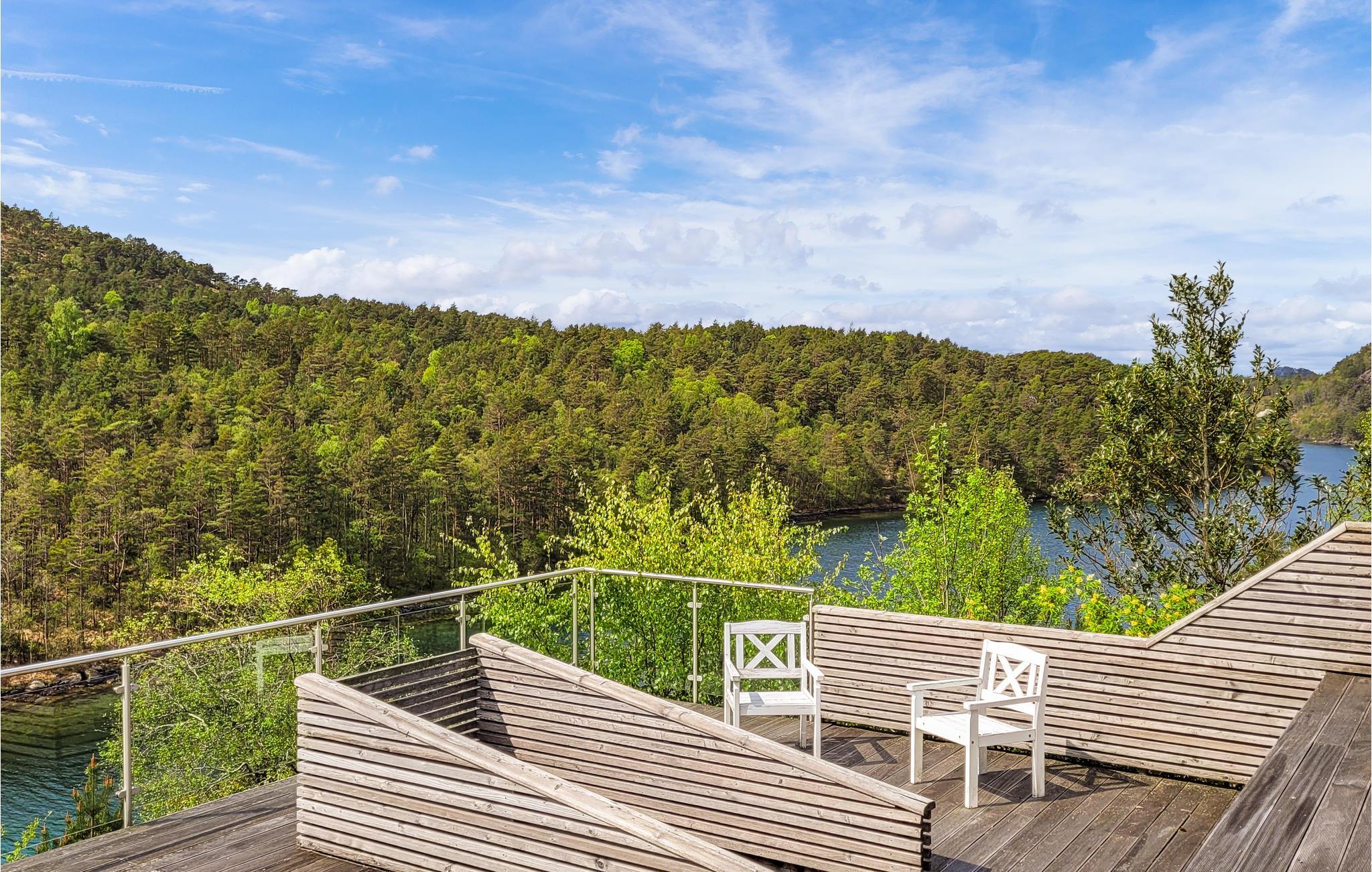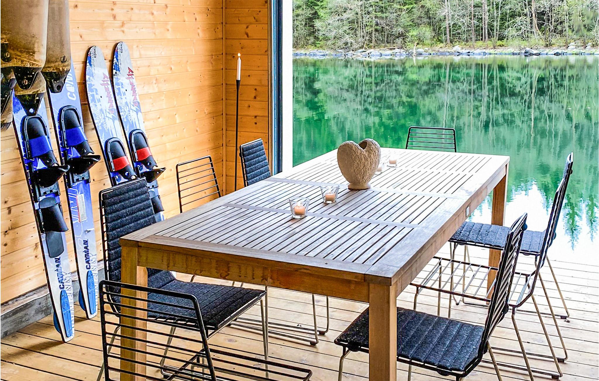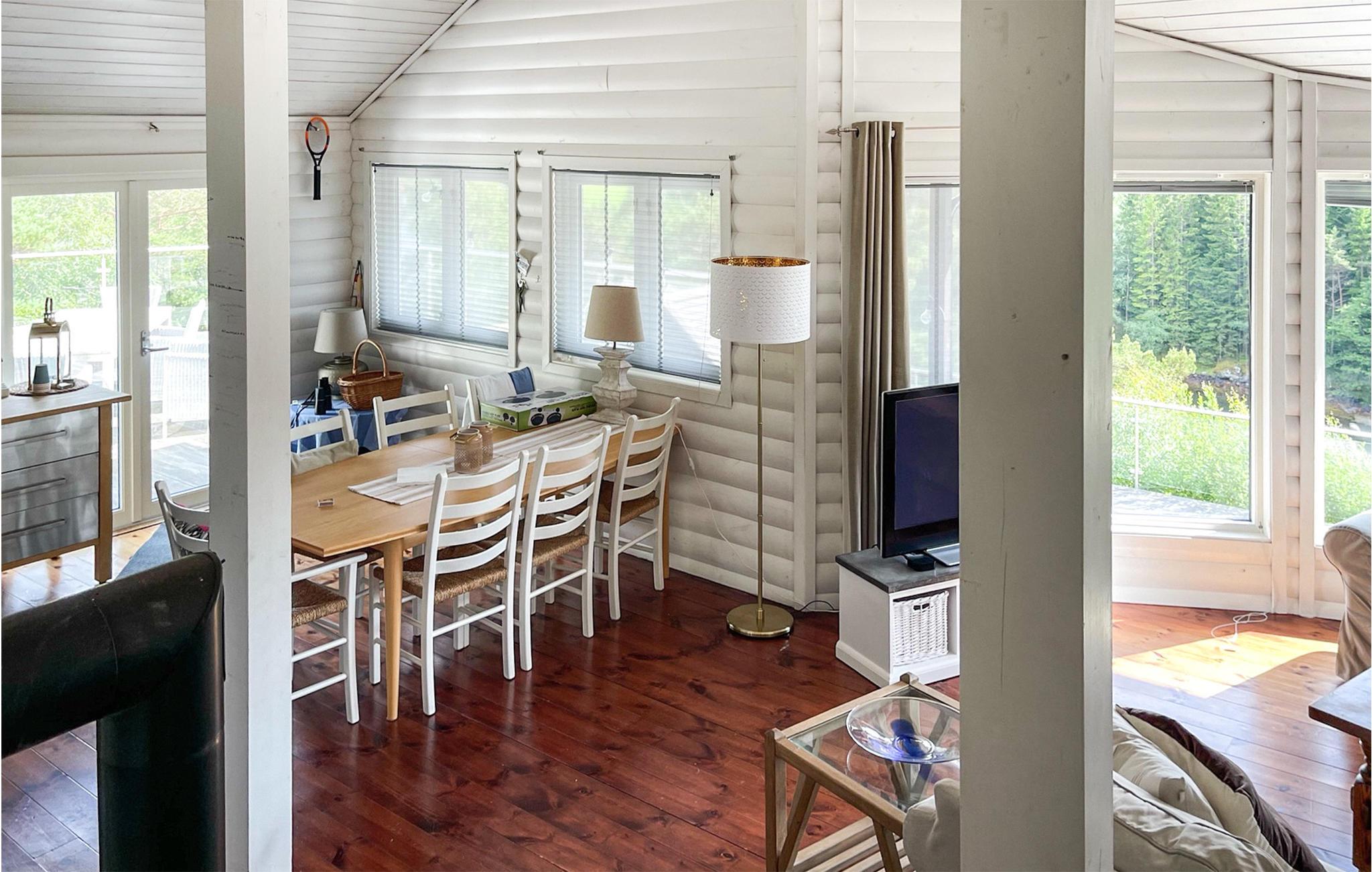 Denne hytte med en fantastisk beliggenhed lige ved Ålfjorden er et paradis for lystfiskere. De høje lofter og store vinduespartier, som slipper mere naturligt lys ind og bringer naturen direkte ind i stuen, formidler en luftig følelse af rum, ro og varme. Hav sjove spilleaftener ved sofabordet og planlæg jeres ture. Forbered morgenmad i det blå-fliser køkken og nyd hjemmebagte kager på det store dæk med udsigt over smaragdvandet og tårnhøje grantræer. Mærk solen og træk den friske luft ind. Hop ind i den funklende fjord eller kast jeres fiskeline ud. Gå på vandretur og opdag det rige plante- og dyreliv. Blåbær, tranebær og multebær forsøder jeres ture.
