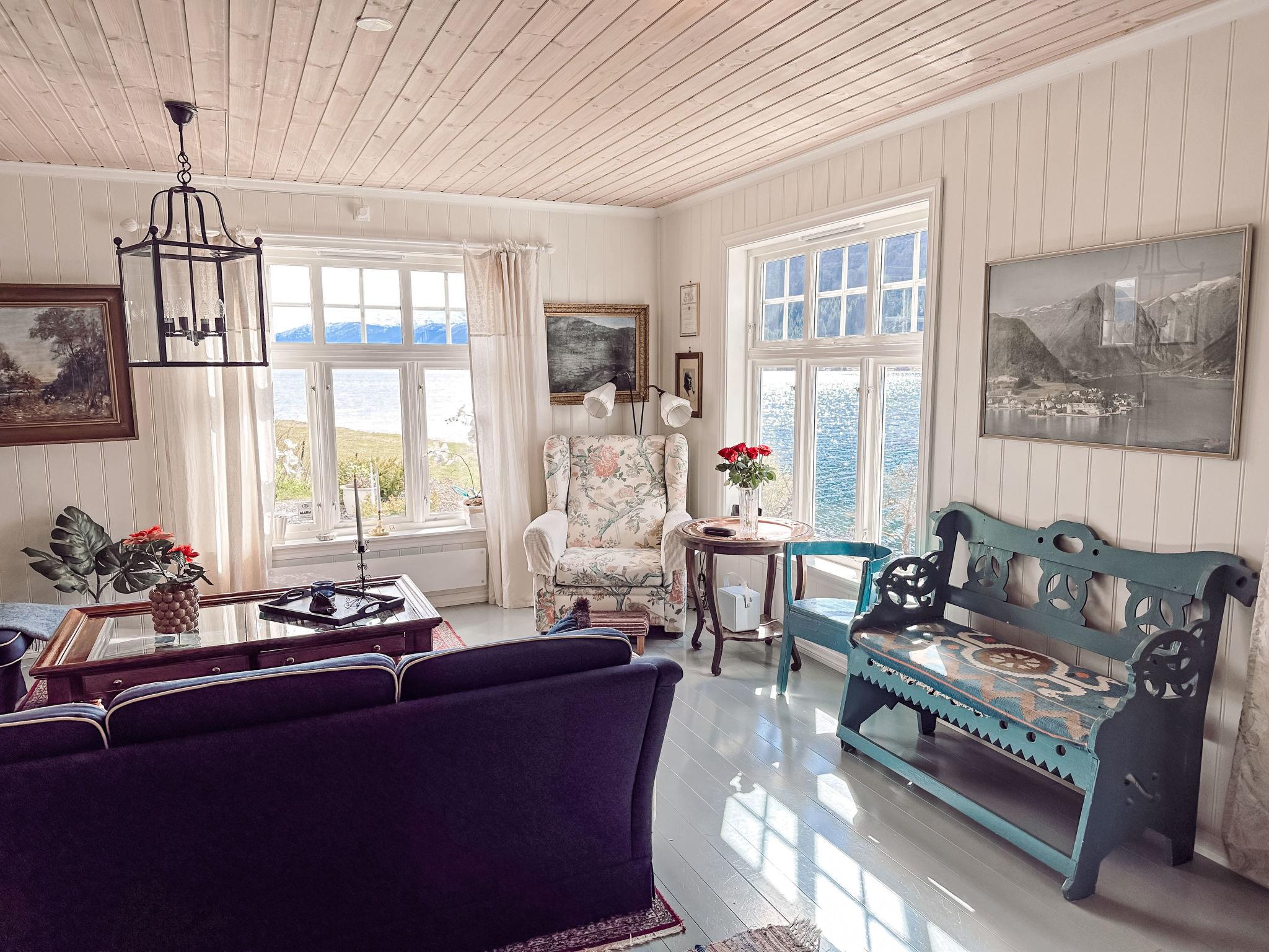 "Villa Esefjord", 6-room house 200 m2 on 3 levels. Renovated in 2010, tasteful and cosy furnishings: living room with TV. Exit to the garden. Shower/WC. Heating. Upper floor: living/dining room with Scandinavian wood stove and dining table. Exit to the balcony. 1 room with 1 double bed (180 cm, length 200 cm). Open kitchen (oven, dishwasher, 4 ceramic glass hob hotplates, microwave, freezer, electric coffee machine). 2nd upper floor: 1 room with 1 double bed (180 cm, length 200 cm). 2 rooms, each room with 1 double bed (150 cm, length 200 cm). Sep. WC. Wooden floors. Balcony, terrace partly roofed, patio. Terrace furniture, barbecue. Very beautiful view of the sea, the mountains and fjord. Facilities: washing machine, dryer, iron. Internet (WiFi, free). Please note: non-smoking house. Private mooring. The freezer is in the basement. 924531169