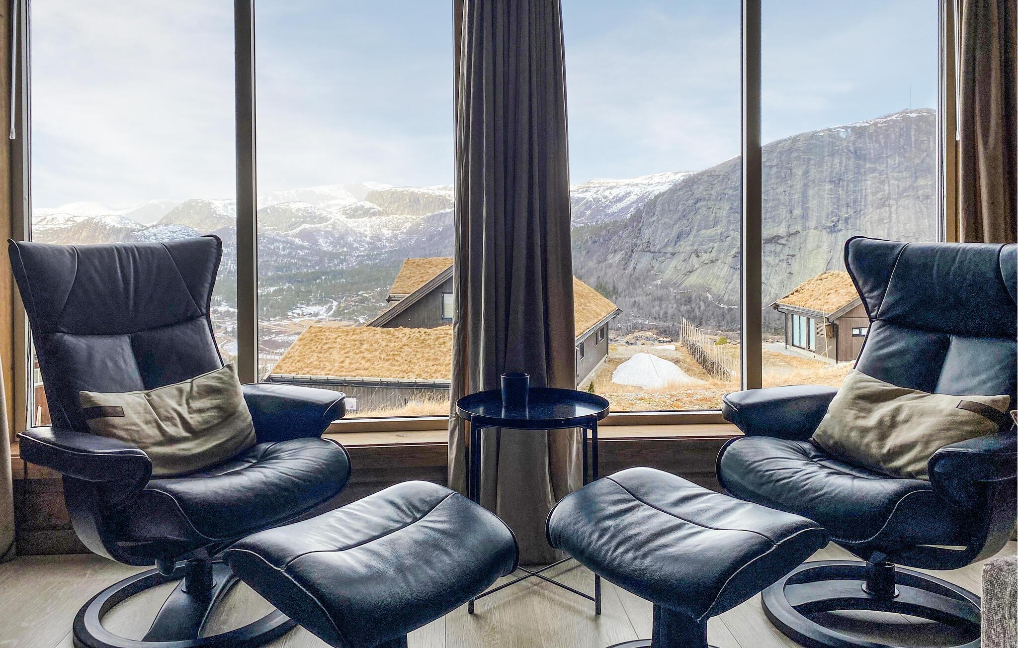 Huset kan prale af en storslået udsigt, som I kan nyde under aktiviteterne takket være de store panoramavinduer. Uanset om I slapper af i de behagelige lænestole med en god bog, eller slapper af på sofaen efter en aktiv dag i naturen med en knitrende ild i brændeovnen, vil I altid have det storslåede bjerglandskab foran jer.