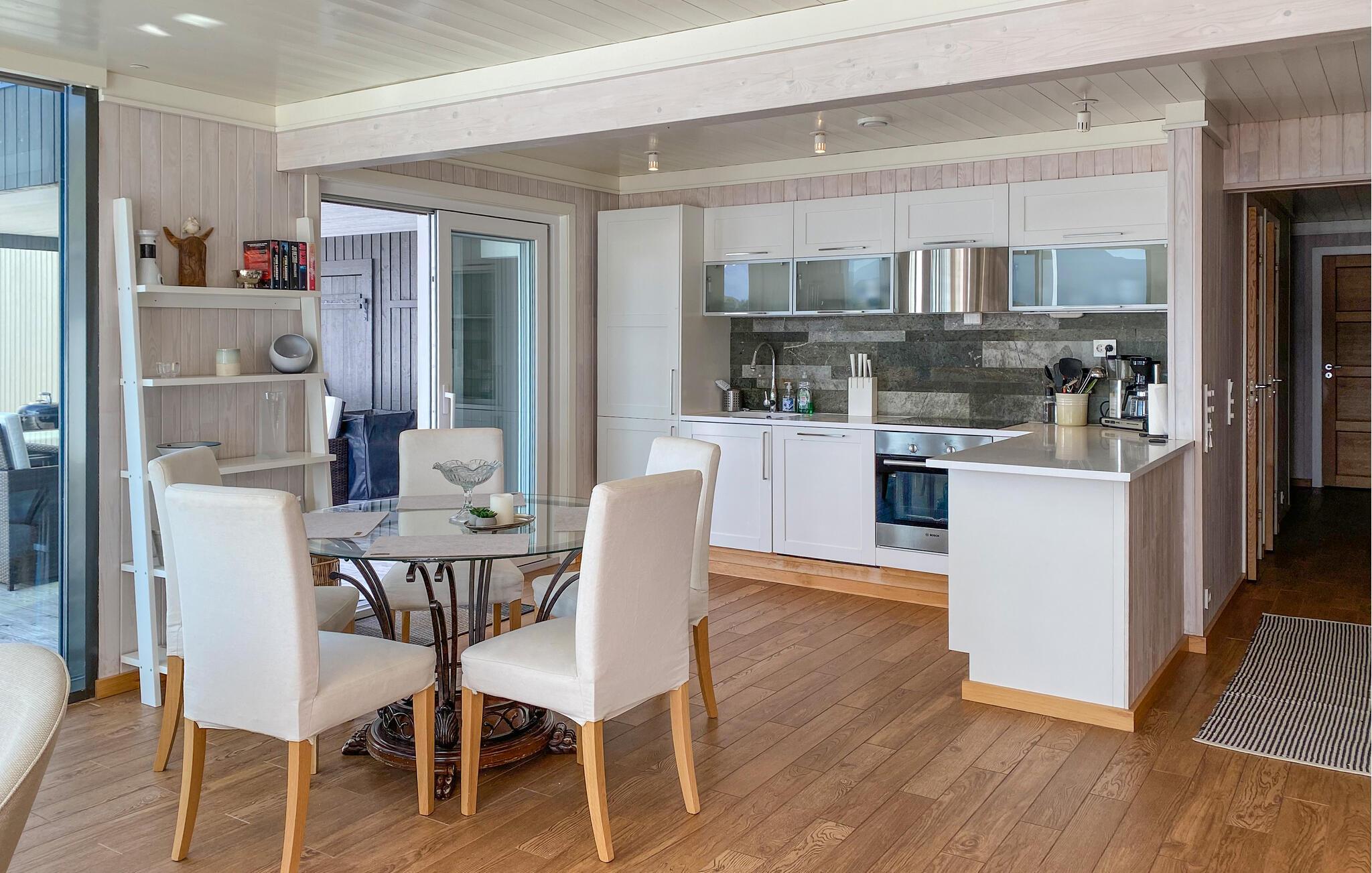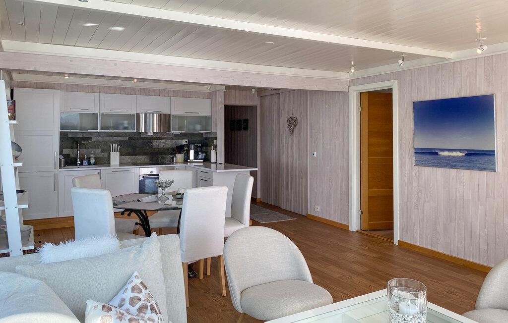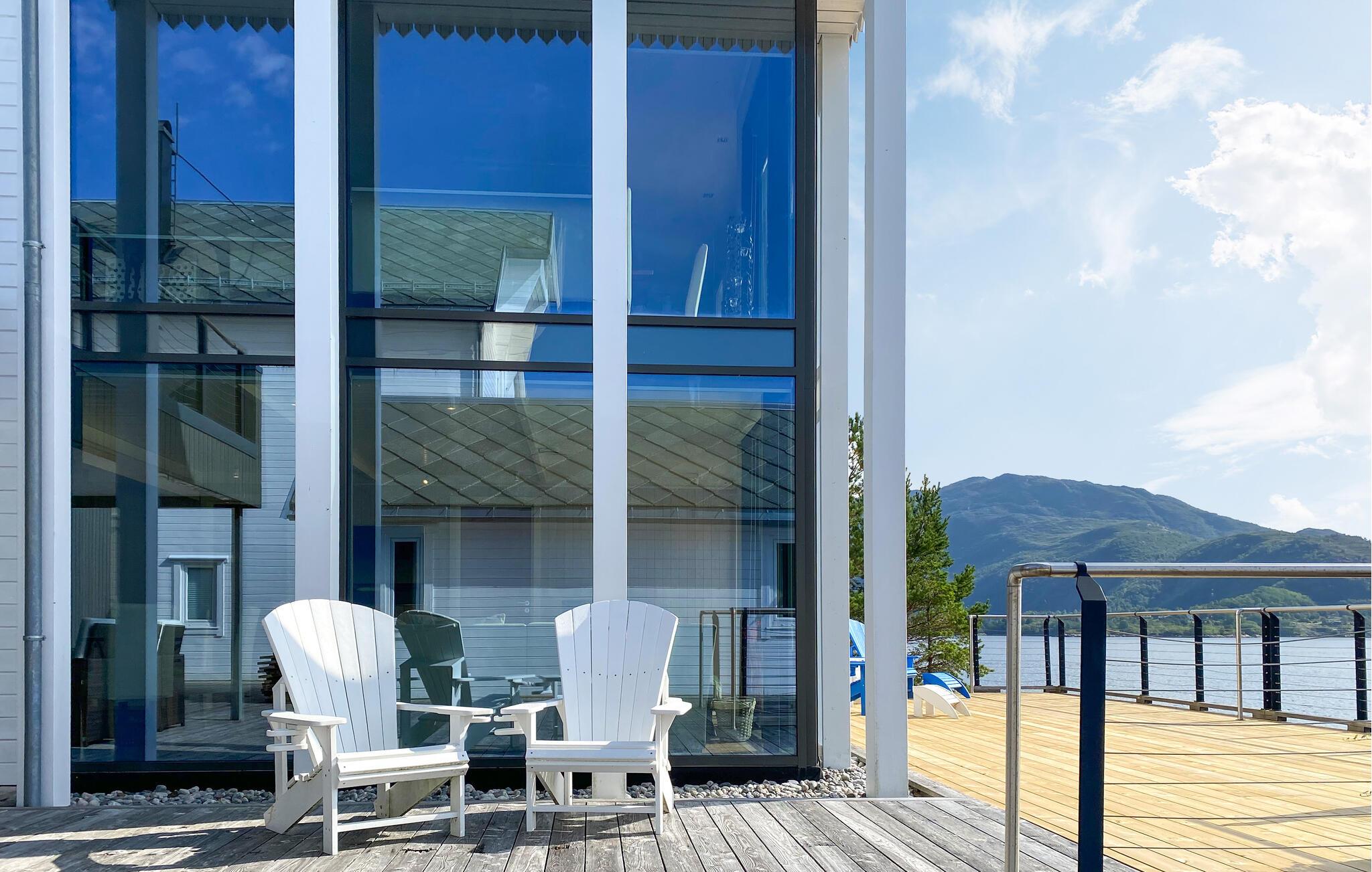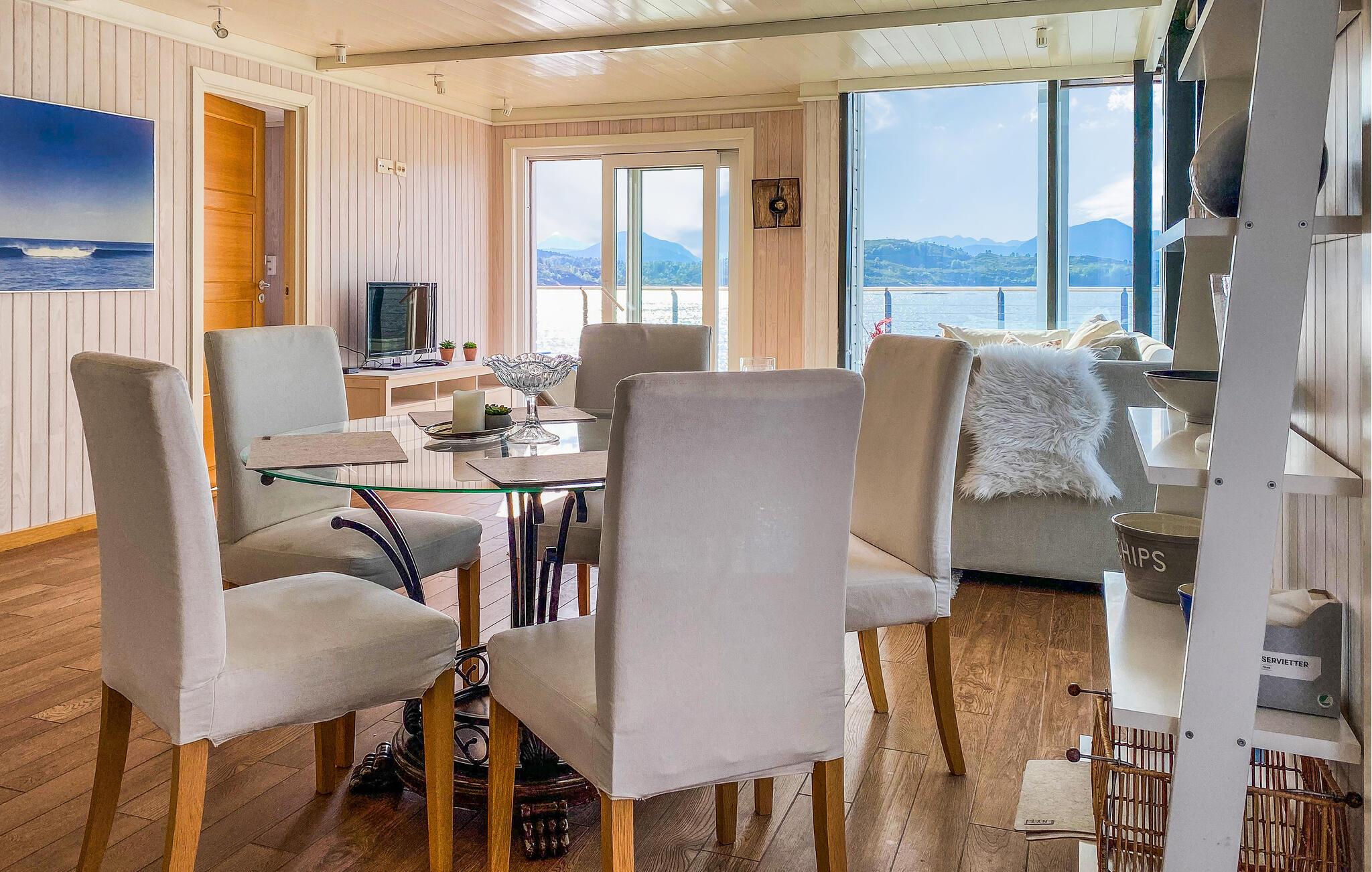 Forkæl jer selv med uforglemmelige dage i denne komfortable ferielejlighed med sauna og fortryllende udsigt over fjorden. Store glasfacader i denne rummelige og stilfuldt møblerede lejlighed tilbyder en sensationel udsigt over det glitrende vand uden for jeres hoveddør og sørger for behagelig belysning i den hyggelige opholdsstue. Fremtryl kulinariske lækkerier i det åbne køkken og nyd afslappede måltider ved det indbydende spisebord. Afslut en lang dag med en saunatur eller stream en god film på sofaen. Genopliv jeres sanser med en morgendukkert i fjorden, og server jer derefter en lækker morgenmad på jeres terrasse. Lej en båd og prøv lykken med fiskeri. Om aftenen kan I nyde den fredelige atmosfære med lækker grillmad. Ro kajak langs kysten og led efter idylliske steder til en picnic. Beundre jugendarkitekturen i Ålesund og besøg den fascinerende Atlanterhavspark. Forkæl jer selv med kulinariske lækkerier i Ulsteinvik, tag en tur til øen Runde, og oplev Ørsta og Volda på en afslappende udforskning.