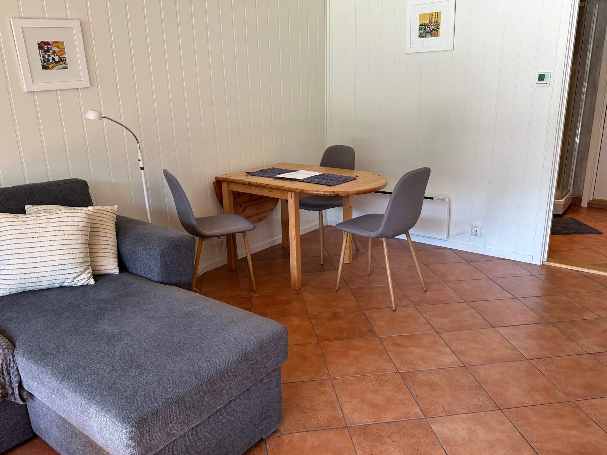 Fra stue- og kjøkkendelen er det en stor foldedør i glass til overbygd terrasse hvor man kan nyte utsikten. Kjøkkenet har ikke stekeovn, men mikrobølgeovn. Det innerste soverommet nås gjennom det første soverommet. Utenfor leiligheten er det uteplass, i tillegg er det uteplasser for ferieleilighetene 28173, 64341 og 64345 ved fjorden. 30 m til en liten sandstrand hvor man kan bade. Badetrapp fra terrassen ved fjorden og utedusj.