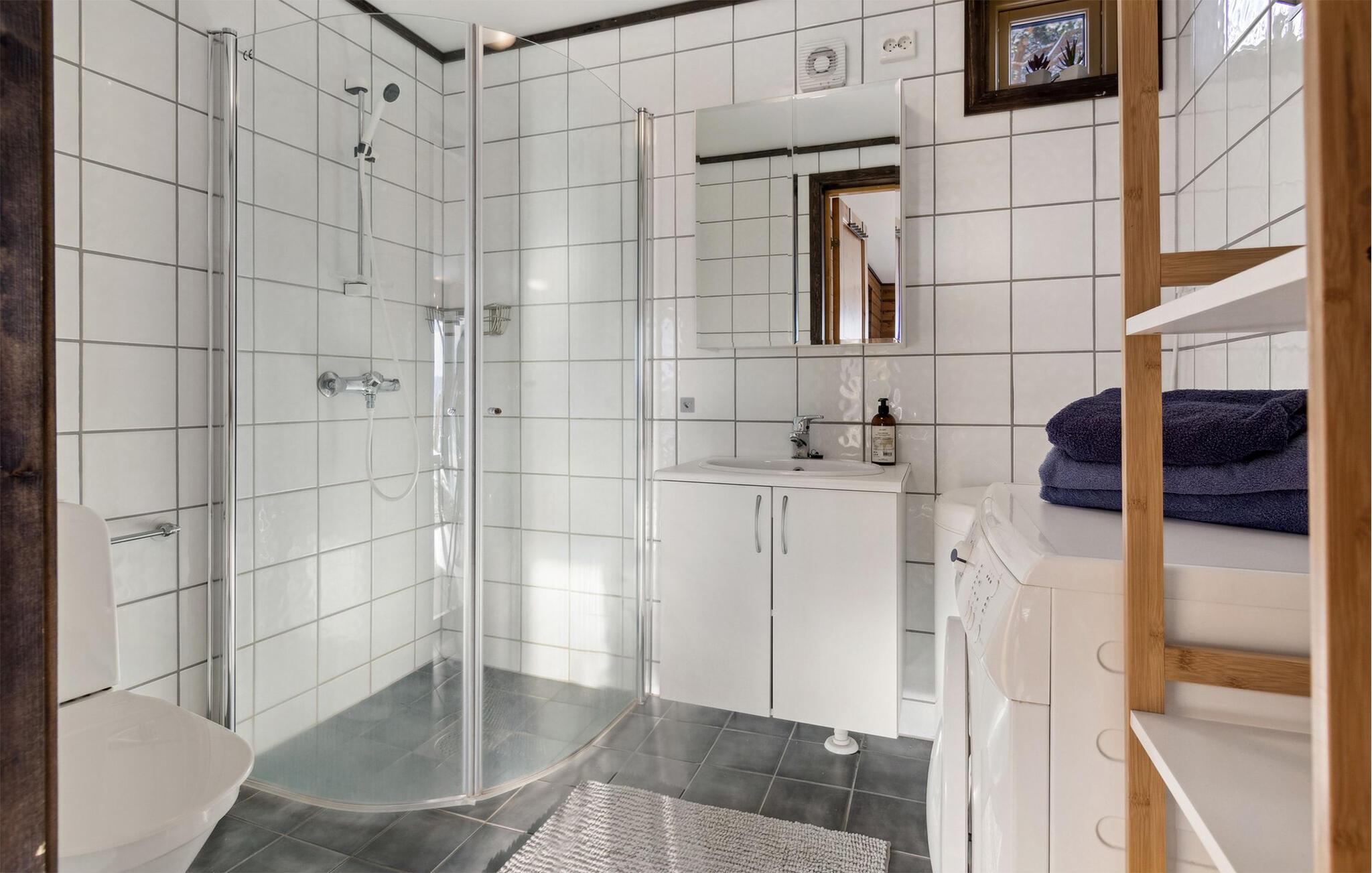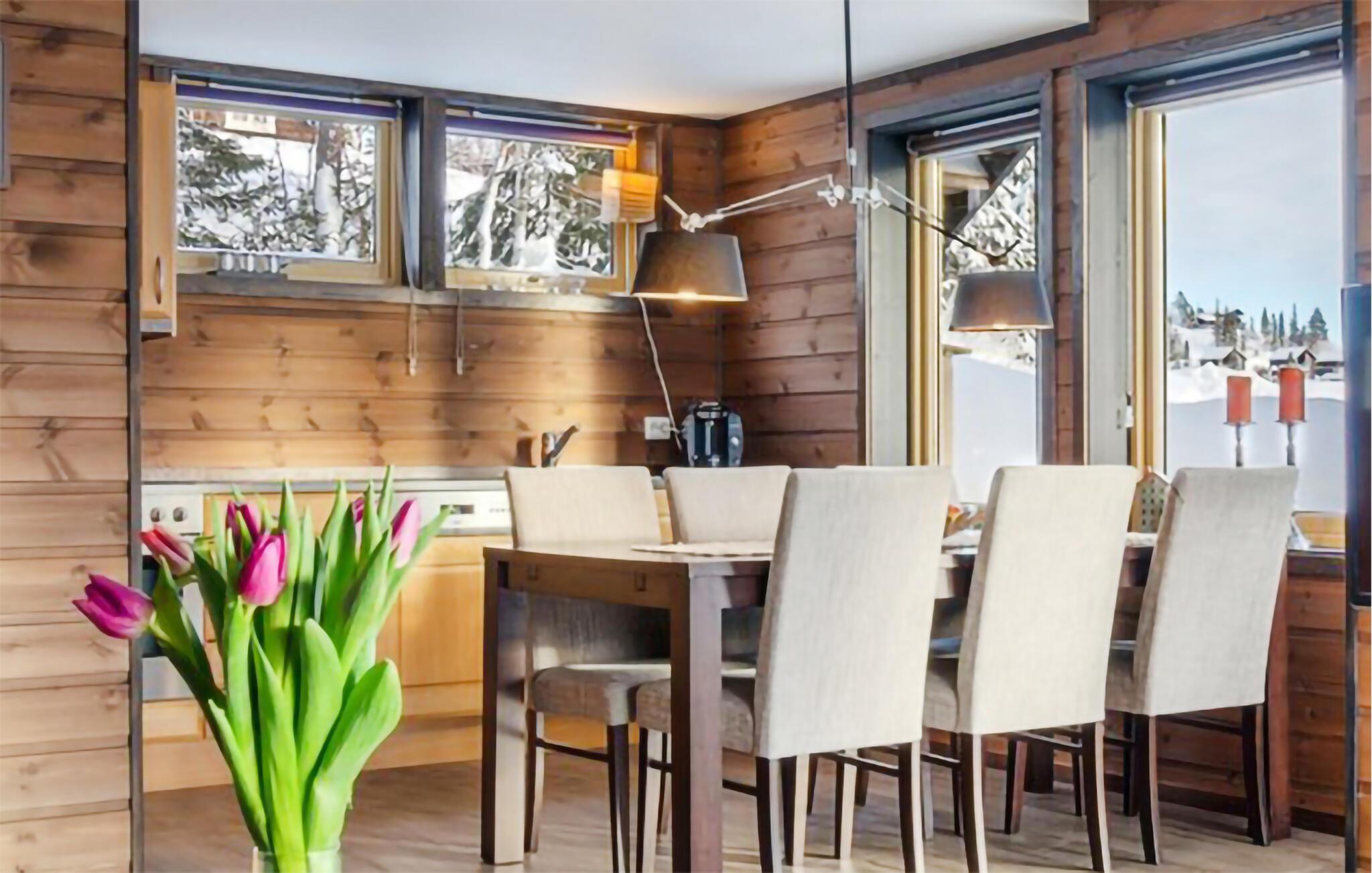 Dette indbydende feriested er præget af et varmt trædesign og store vinduer, der lukker masser af lys ind og giver en betagende udsigt. Tilbered lækre fiskeretter i det moderne køkken, og nyd jeres måltider ved det stilfulde spisebord. Slap af i stuen med komfortable sofaer og lænestole, og afslut dagen hyggeligt med en film eller en god bog.