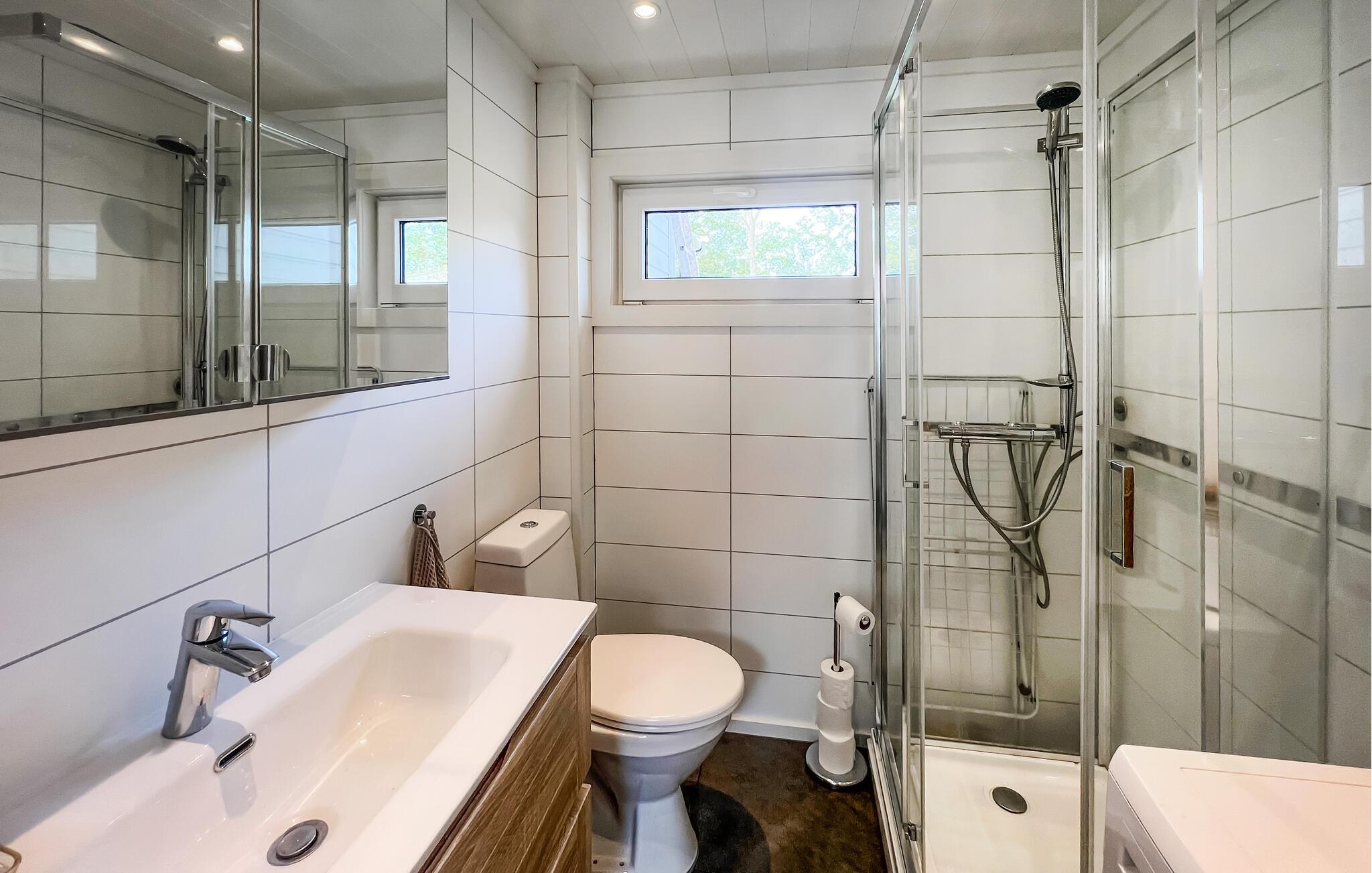 Dette feriehus giver jer mulighed for at tilbringe en afslappende ferie i naturlige omgivelser. Sæt jer til rette i husets stue. Gør det behageligt i den store hjørnesofa og nyd udsigten over naturen gennem de rummelige vinduer. Ved spisebordet kan hvert måltid nydes i en afslappet atmosfære. Tilbered nemt måltiderne i det praktiske køkken, som lægger op til at dele madlavningsoplevelser sammen.