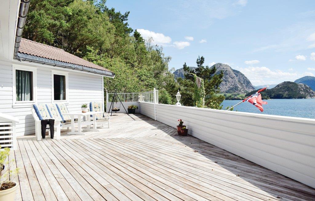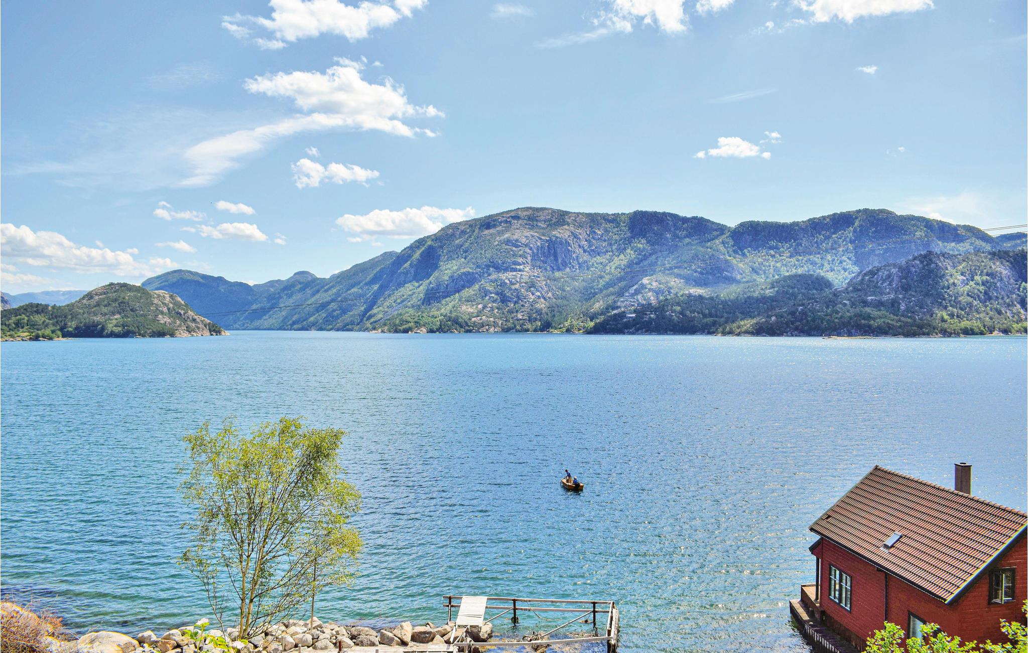 Er ønsket en betagende panoramaudsigt? Da er dette dejlige feriehus, det helt rigtige. Fra husets store terrasse med havemøbler, er der en betagende udsigt over fjord og fjeld, året rundt. Om sommeren kan I slappe af i de behagelige havemøbler og lave mad på grillen og spise den udendørs. I kan fange fisk i den nærliggende fjord, enten fra båd eller fra land. Der er udendørs fiskerenseplads, som I sikkert får stor glæde af. Ekstrabåd på 15 fod med 25 HK motor og elstart. I kan bade i fjorden på de varme sommerdage. Der er ikke langt til de nærmeste vandrestier, ligesom det er oplagt at tage på udflugt til Hjelmeland og Årdal og på dagsture til Lysefjorden og Prekestolen. Er der børn med, vil de sætte pris på at besøge Kongeparken med mange forlystelser.