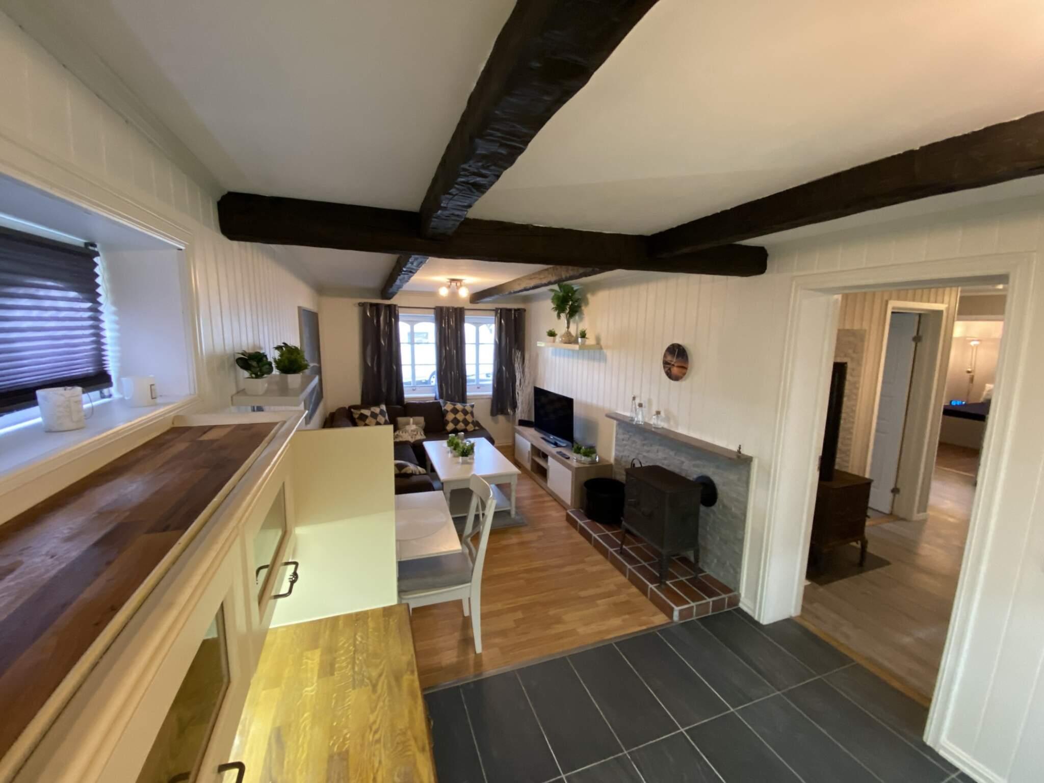 Ferieleiligheten har god plass til 5-6 personer og inneholder 2 soverom, 2 bad, vaskerom, åpen kjøkken/stue løsning samt en stor bod med sovesofa. Leiligheten ble nyrenovert i 2025 og fremstår moderne og fin med varmekabler i flere gulv. Det er dobbeltseng i det ene soverommet og familiekøye i det andre. Leiligheten har varmepumpe/AC og to vedovner. Utenfor er det godt med parkeringsplass, og en overdekt liten platting med utemøbler/grill.