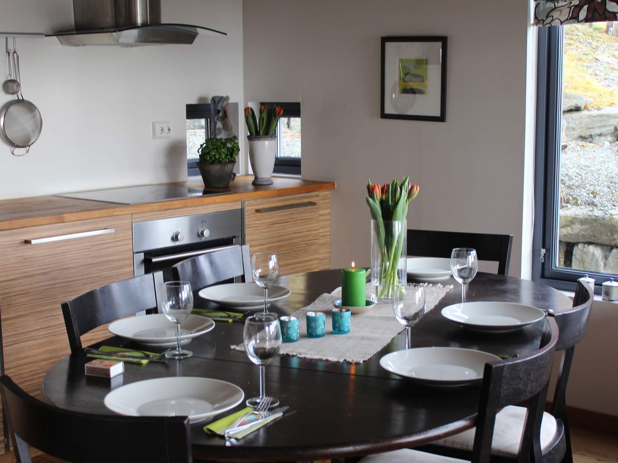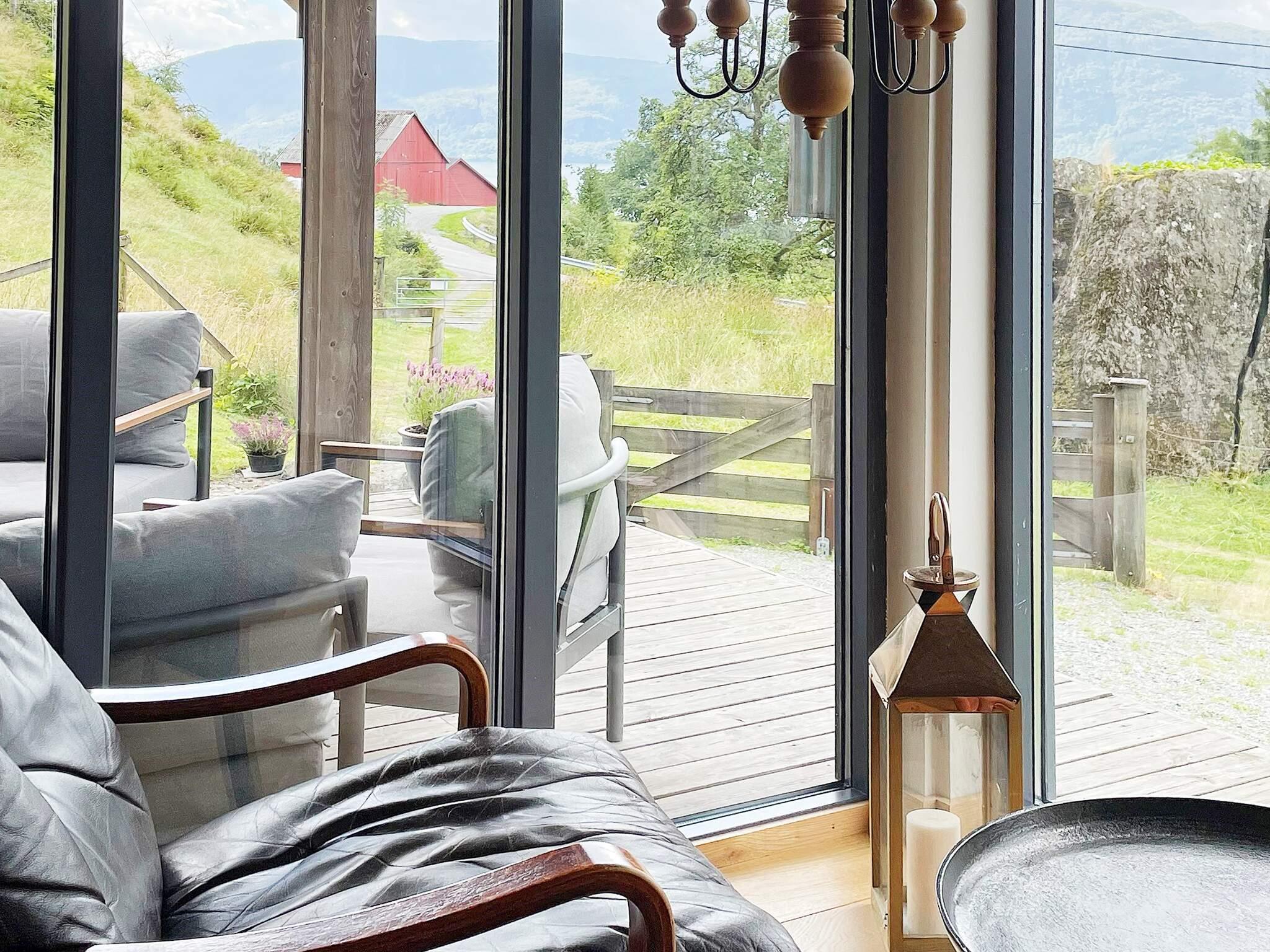 Feriehuset ligger ved fjorden i naturskjønne omgivelser med panoramautsikt over fjorden. Luksusferiehuset er bygget for å gi deg og din familie den optimale ferieopplevelsen. Feriehuset er meget smakfullt innredet med møbler og utstyr av høy standard og moderne design. Utsikt over fjorden og kveldssol til langt på kveld. Fin solnedgang fra en liten, usjenert overdekket terrasse og stor uteplass med hagemøbler og grill. Det er en ekstra håndvask på det ene soverommet i 2 etg. Mange TV-kanaler, inkl. flere internasjonale, men ingen tyske.