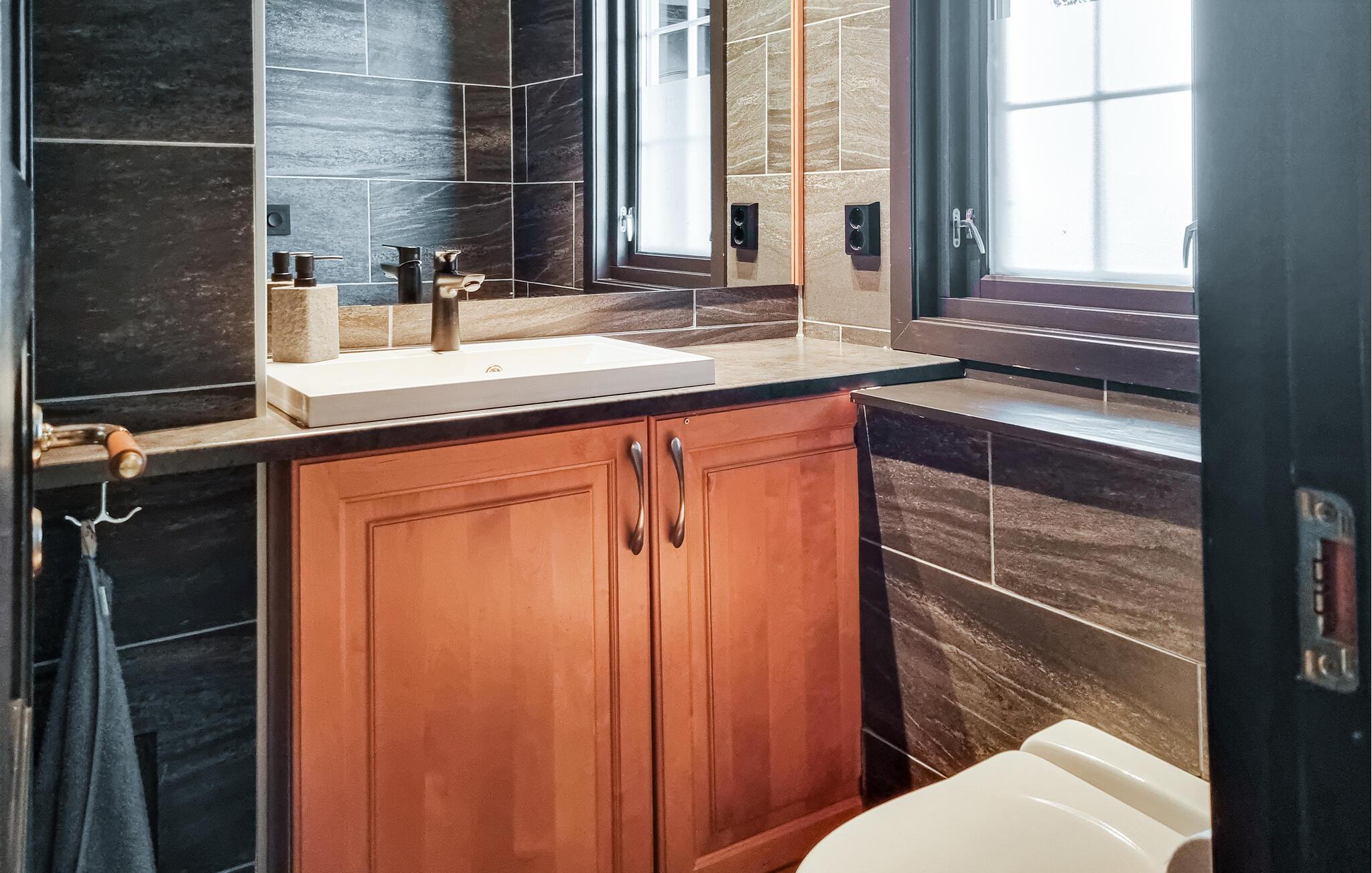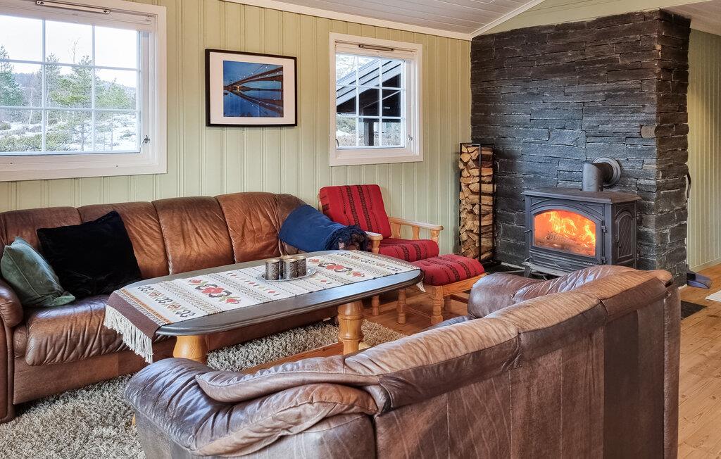 Med en fantastisk udsigt til de omkringliggende bjerge byder dette hyggelige feriehus jer velkommen, ideelt til afslapning og ro med afstand til naboerne. Store vinduer i stuen forbinder interiøret harmonisk med naturen – en fryd året rundt. Glæd jer til hyggelige stunder på sofaerne foran pejsen, hvad enten det er med kortspil, brætspil eller gode samtaler. Her kan I nyde fællesskabet væk fra hverdagens stress og fordybe jer i aktiviteter, der normalt ikke er tid til.