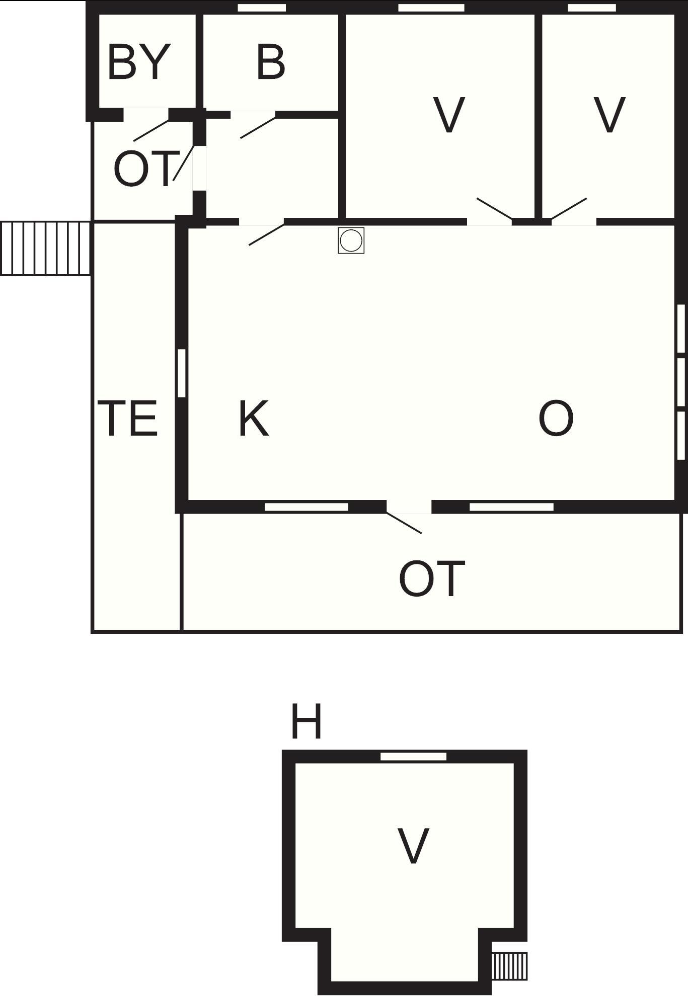 Stor og romslig stue med kjøkkenavdeling. 20 kvm delvis overbygd terrasse mot fjorden. TV: SmartTV+/Apple TV, norske, nordiske, tyske og europeiske TV-kanaler. Internett 100 Mbits. Køyeseng med 120 cm bredde nede og 75 cm bredde oppe. Hems for den spreke med to lave 90 cm brede senger, gode madrasser. Bratt stige opp til hemsen. Langgrunn sandstrand 10 m.