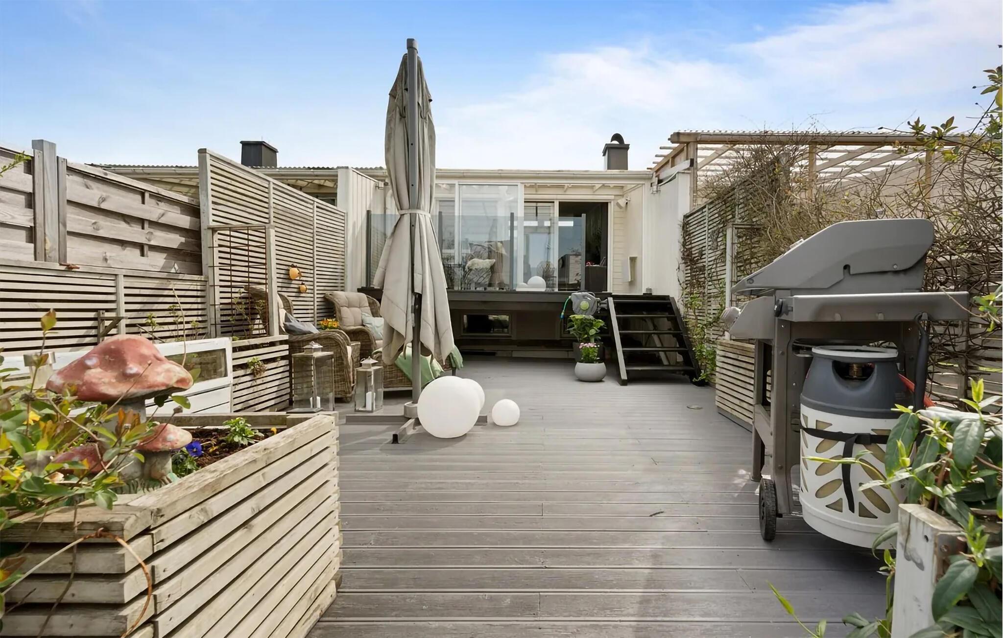 Den afsondrede, kærligt designede terrasse er også en sand oase af velvære, hvor I kan nyde solrige dage udendørs. Genoplad batterierne, mens I snakker på de behagelige havestole, nyder et glas vin og tænder op i grillen.