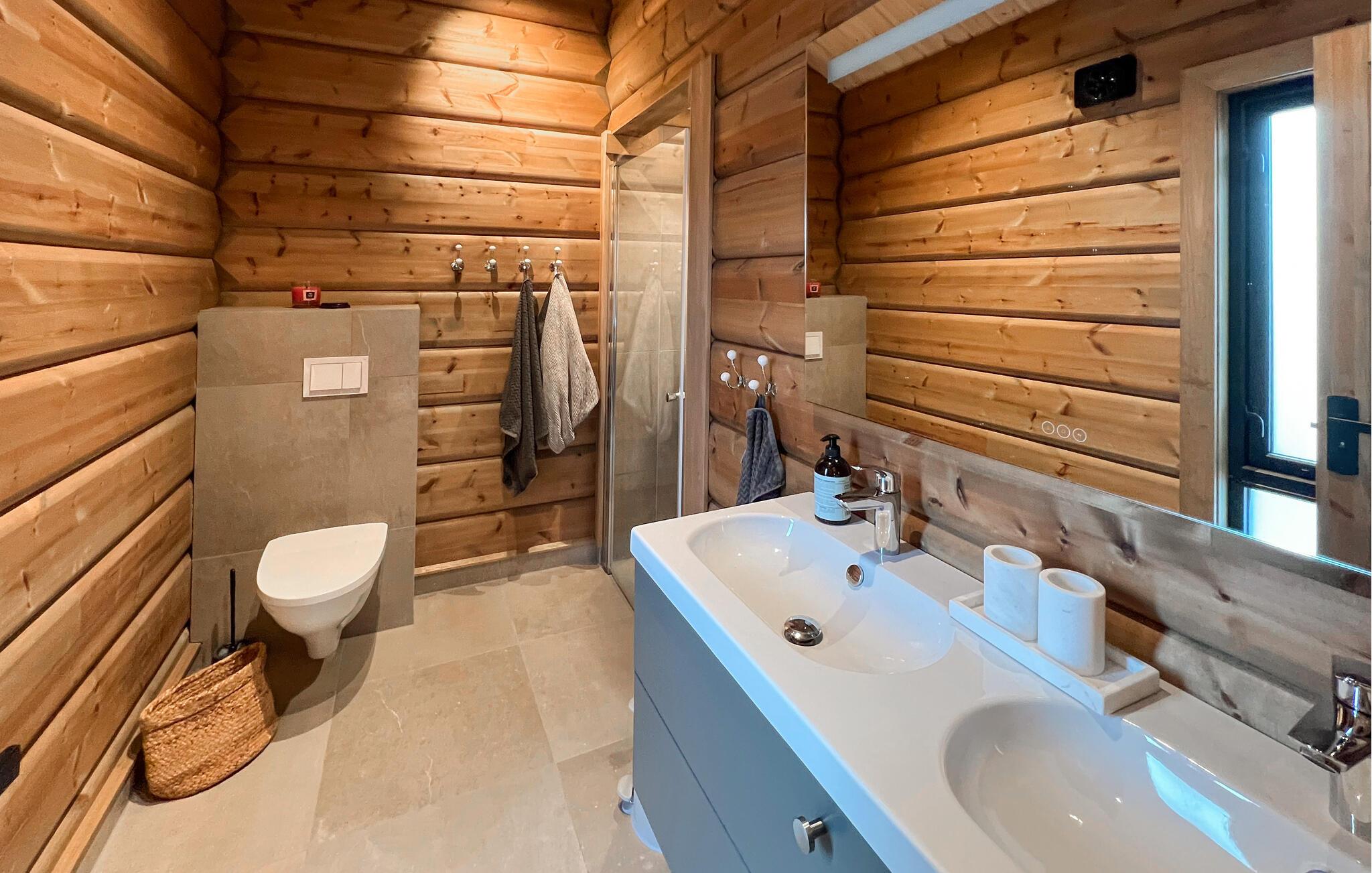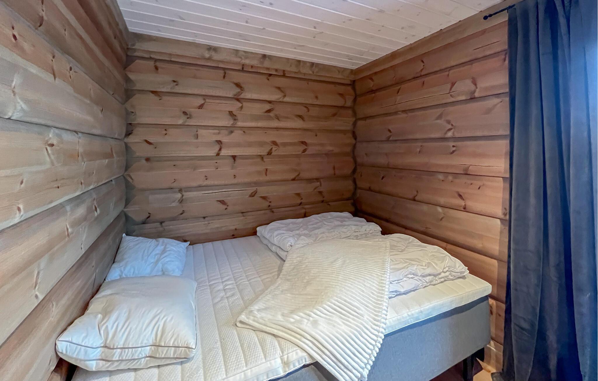 Velkommen til dette hyggelige feriehus, hvor masser af træ, smagfuld indretning og stilfuld belysning sørger for en masse hygge. Pisk træskeen op i det fuldt udstyrede køkken og saml jer om det lange spisebord med panoramaudsigt til lækre måltider. Tænd pejsen og glæd jer til hyggelige aftener i sofaen med en spændende film eller et glas vin.