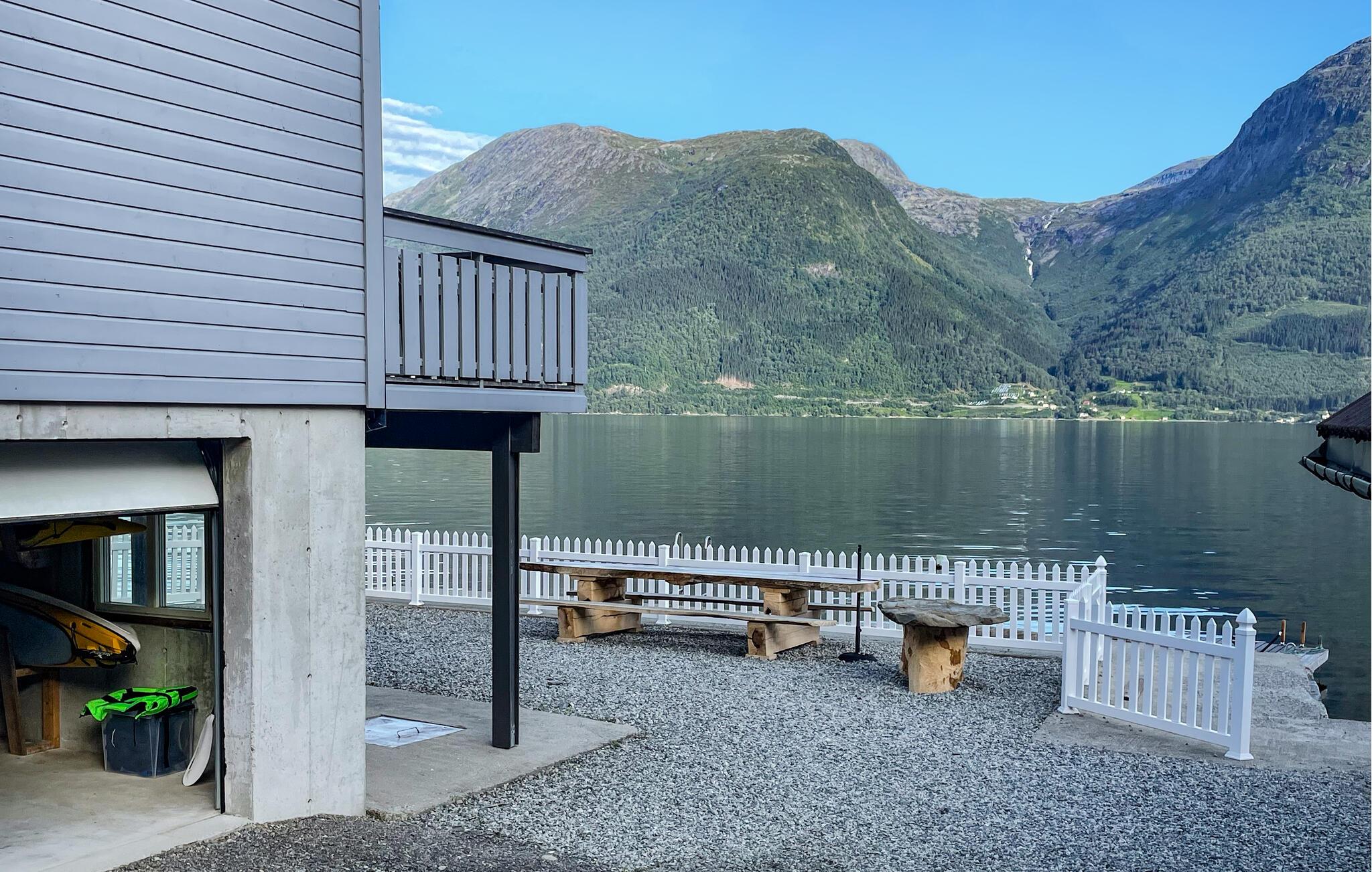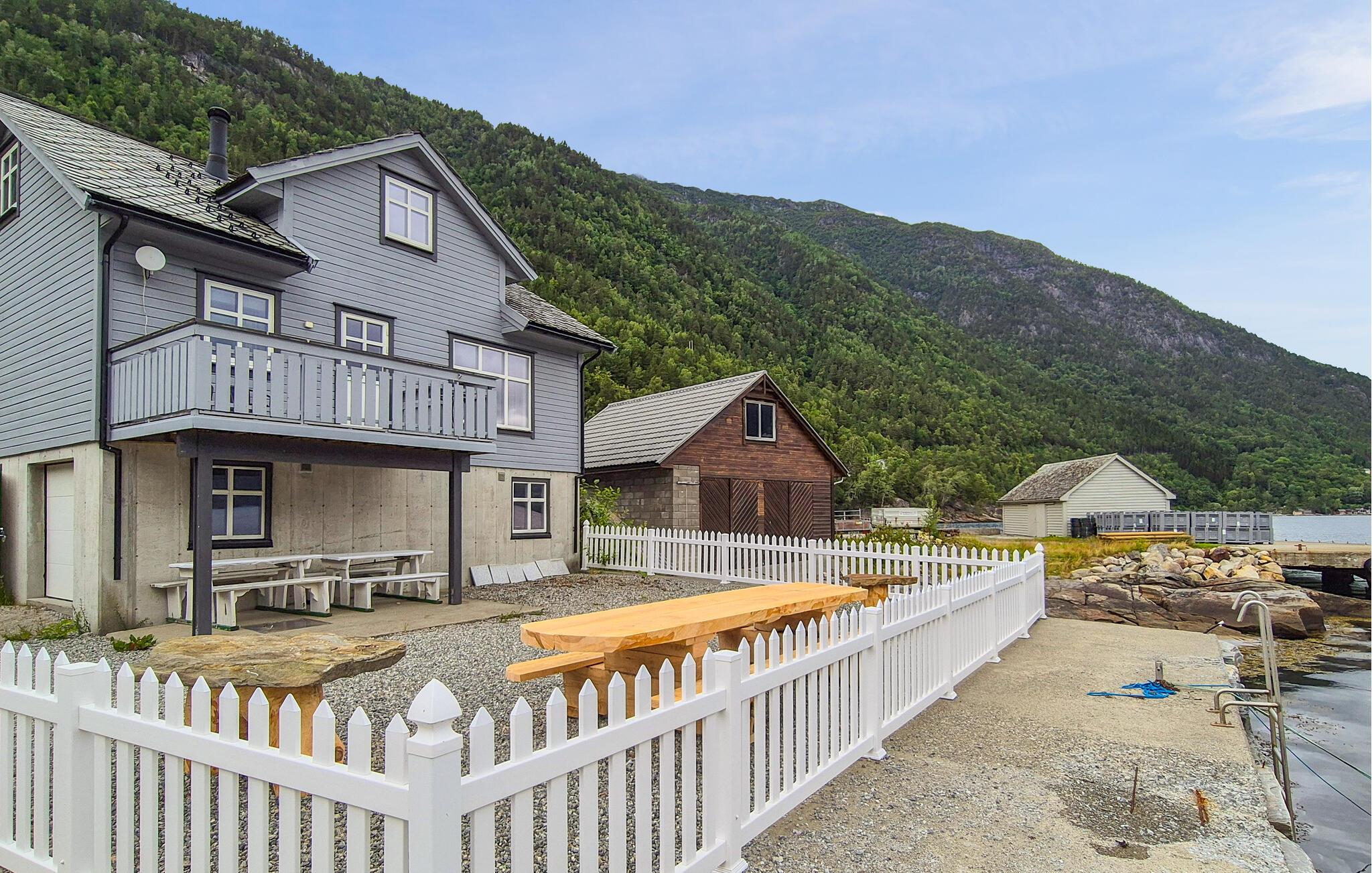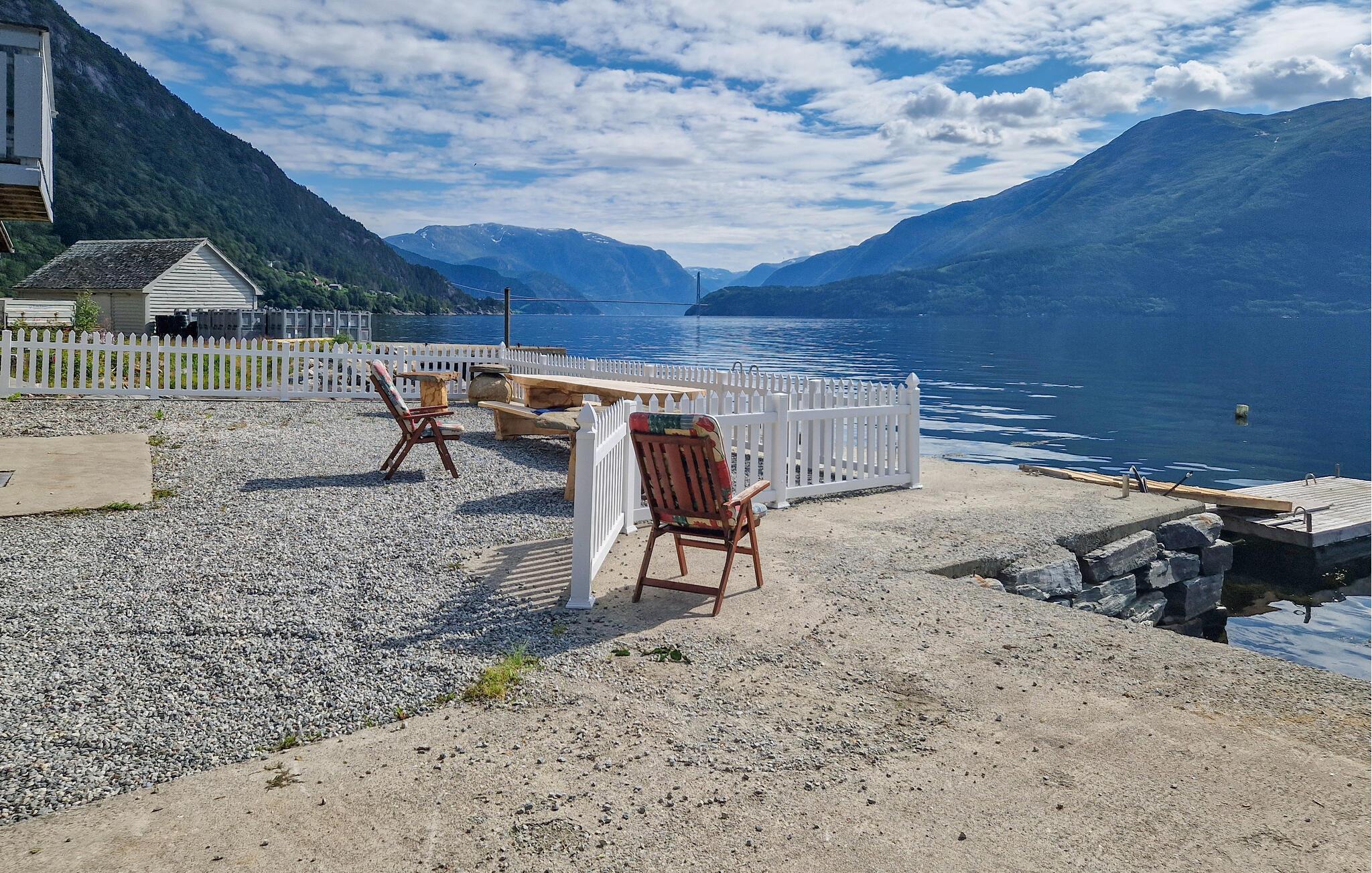 I Djønno, lige ved bredden af ??Hardangerfjorden, kan I se den betagende udsigt over fjorden både fra huset og fra de store udendørsarealer. Slap af på den hyggelige terrasse eller på jeres egen badebro og lad tankerne vandre, mens bølgerne blidt plasker på kysten. I kan også bade her. Benyt muligheden for at køle ned i fjorden hver dag. Eller se, om I fanger noget direkte fra anløbsbroen. Her er mange muligheder for at fange fisk. I kan også tage på lange vandreture i det stille fjeldlandskab eller leje en kajak og udforske fjorden fra vandet.
