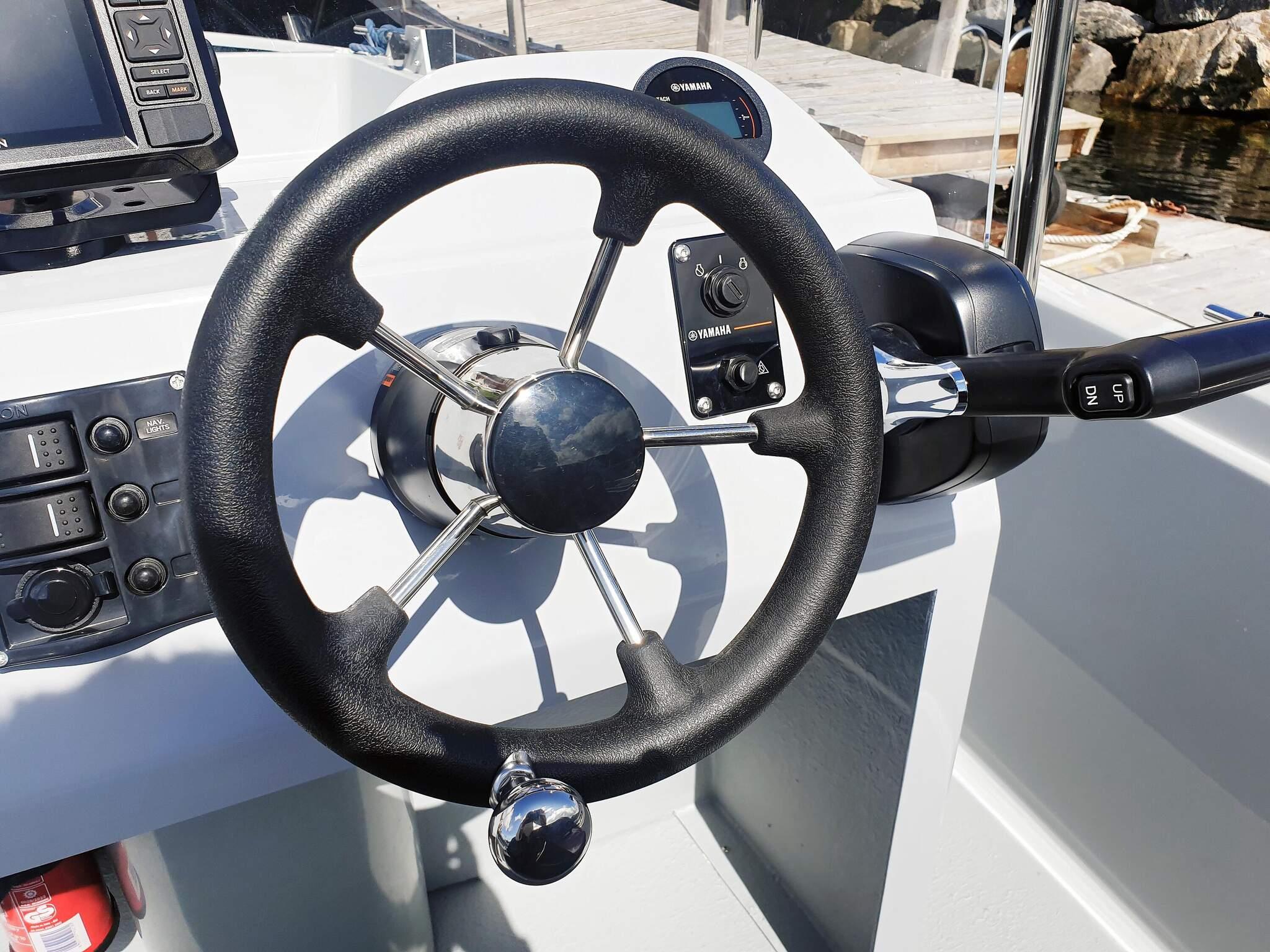 Ved flytebryggen utenfor sjøhuset er det til leie en 2023-modell 18 fots HobbyBoat 528CC med 70 HK Yamaha motor, styrekonsoll og Garmin 52 ekkolodd, gps og kartplotter og 6 stangholdere.