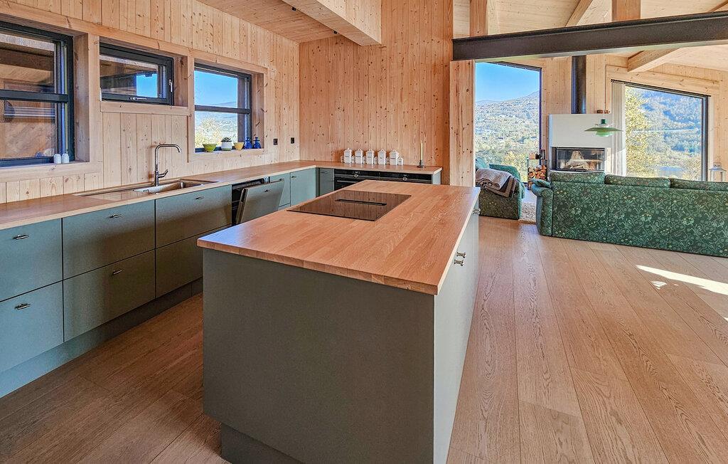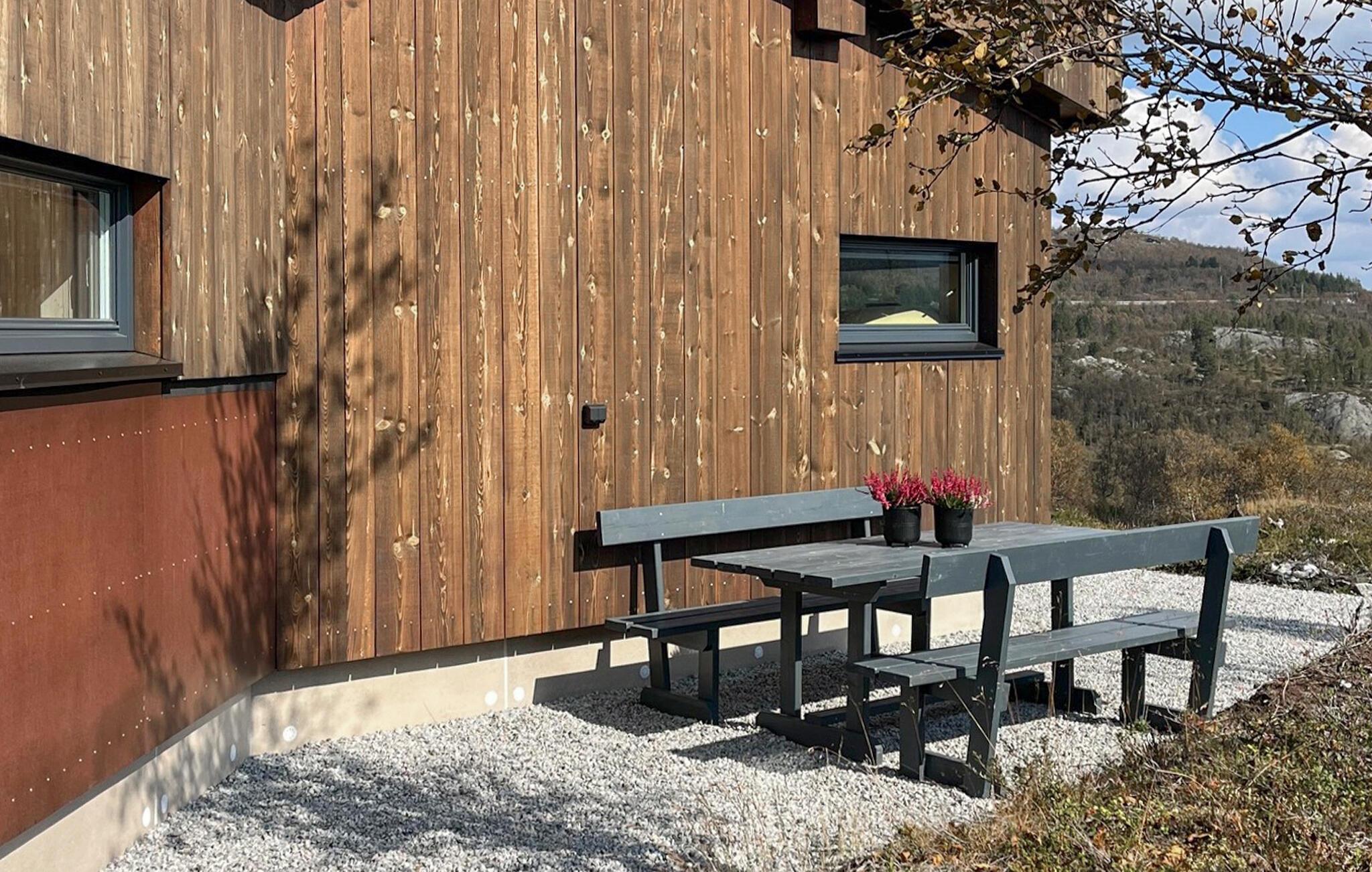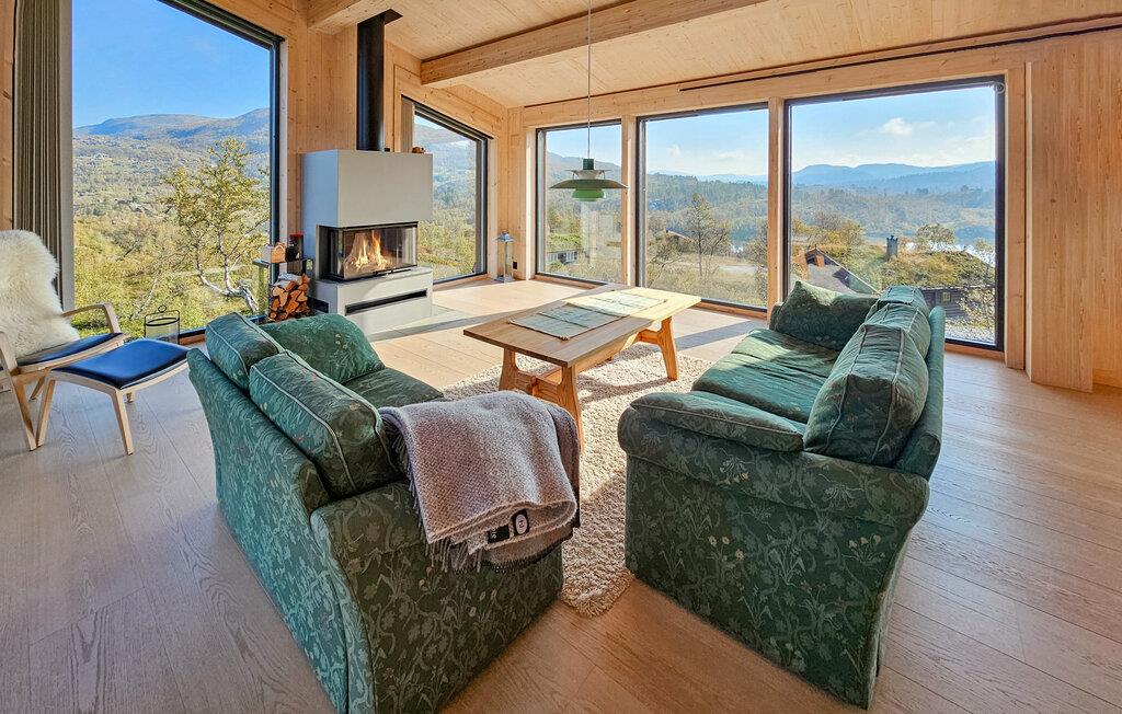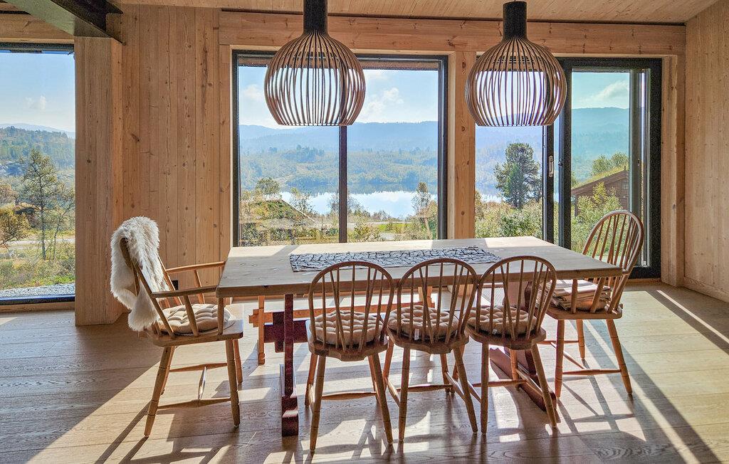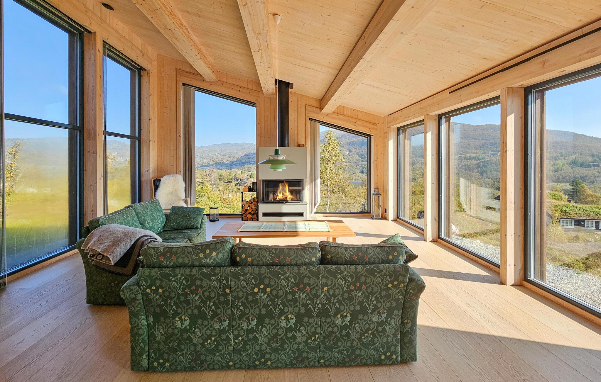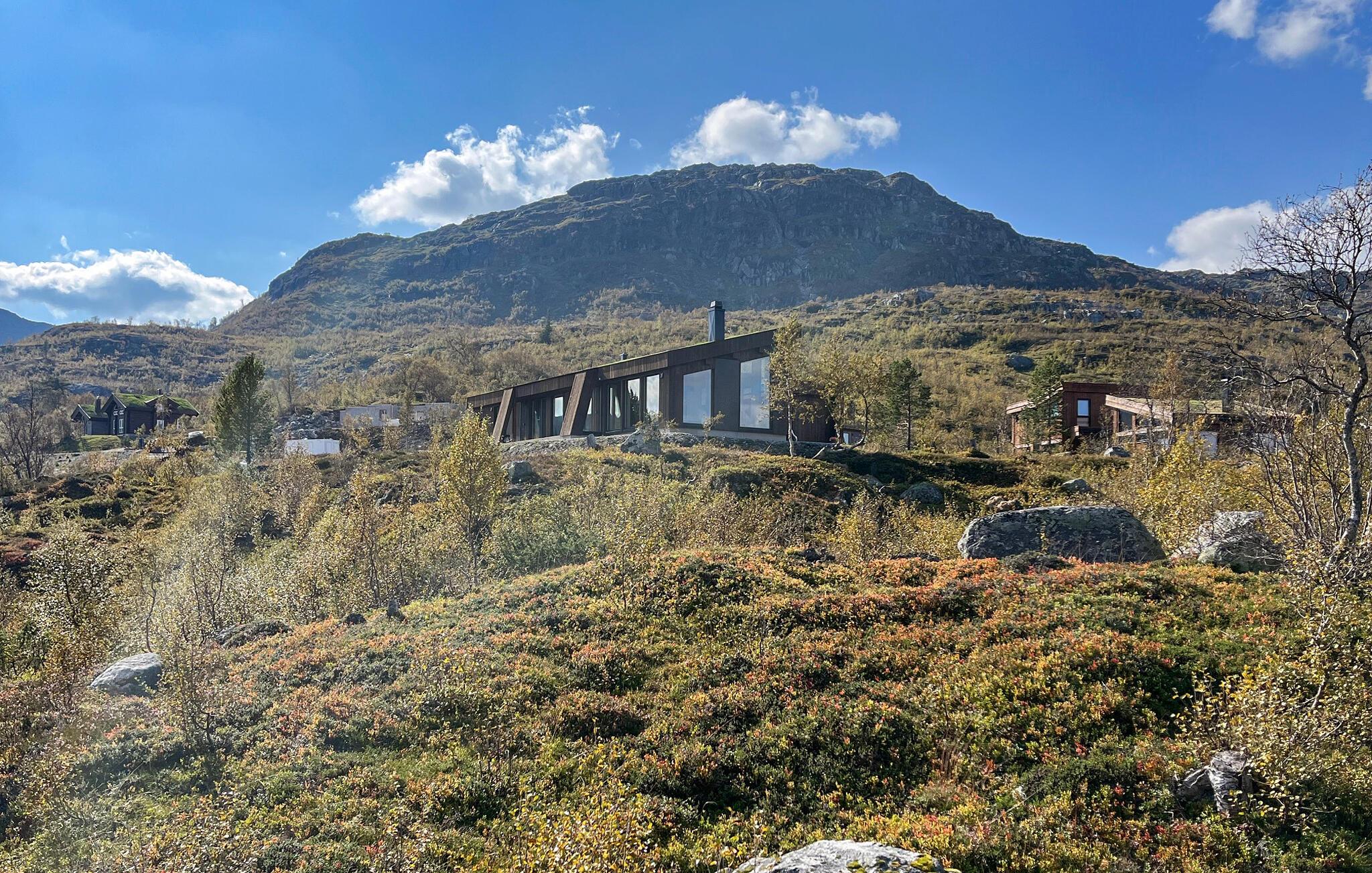 Oplev dette unikke feriehus på Haukelifjell. Det moderne design og den varme træarkitektur smelter harmonisk sammen med omgivelserne og tilbyder jer et tilflugtssted fyldt med komfort og ro. Nyd panoramaudsigten over de omkringliggende bjerge og søen direkte fra den store terrasse eller den hyggelige opholdsstue. Lad sjælen få ro, og tag den imponerende natur ind. I den åbne opholdsstue inviterer store vinduespartier lys og udsigt indenfor. Slå jer ned på de komfortable sofaer foran pejsen og lad bjerglandskabet virke på jer. Det moderne køkken er fuldt udstyret og tilbyder alt, hvad I behøver til fælles måltider. Nyd jeres måltider ved det store spisebord med udsigt over landskabet.